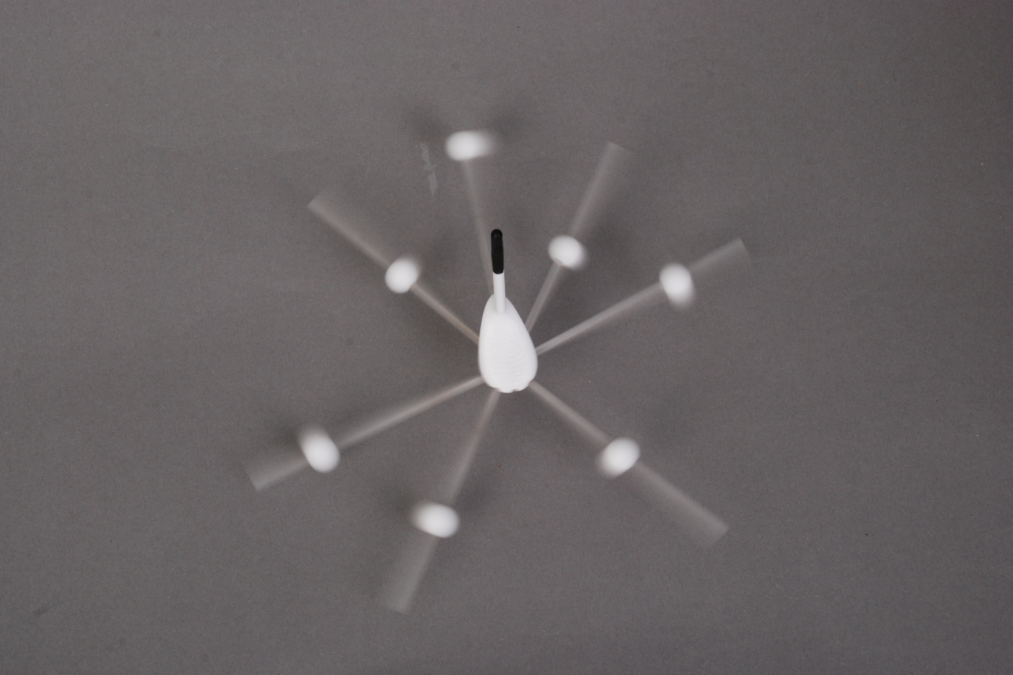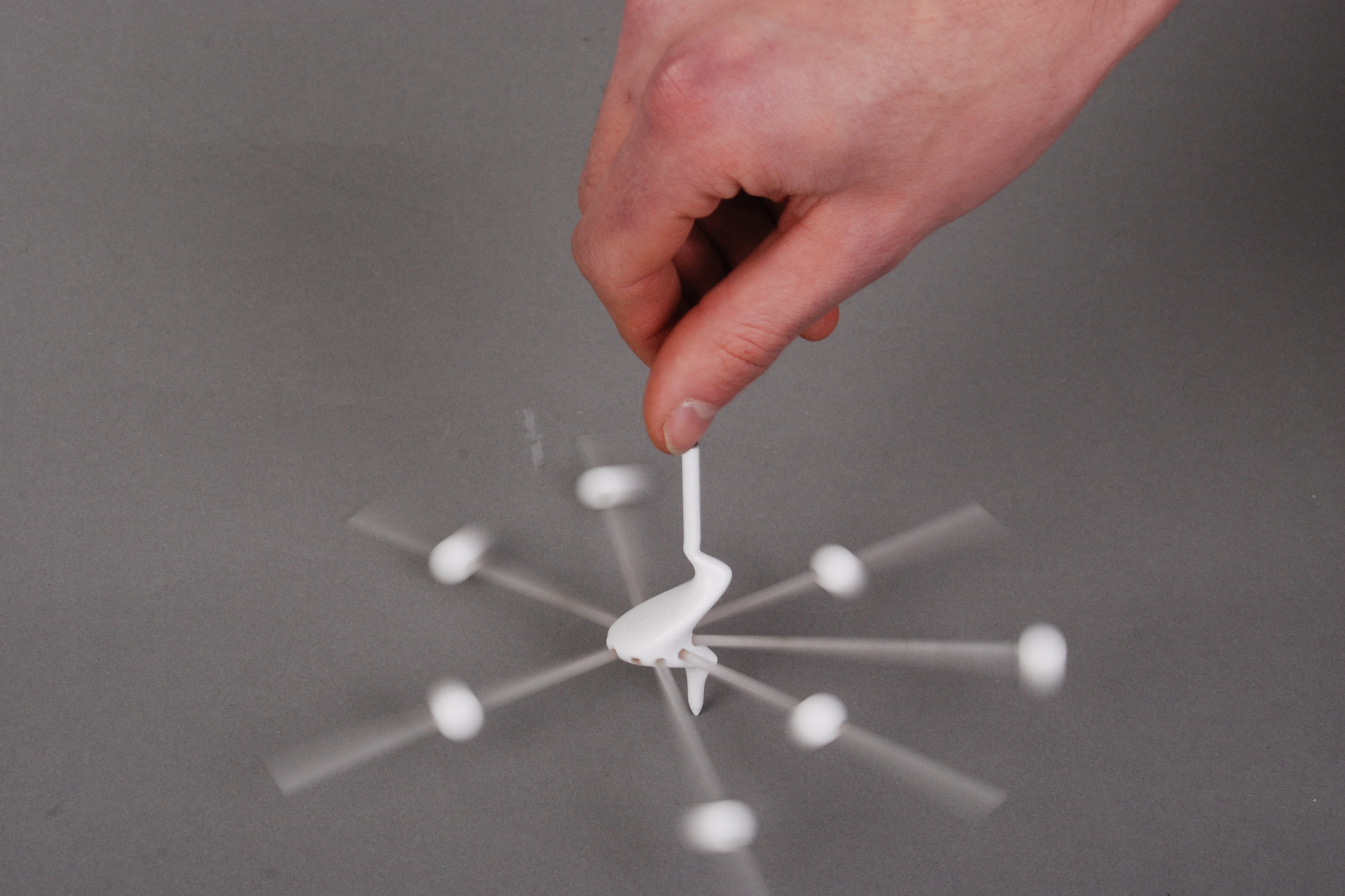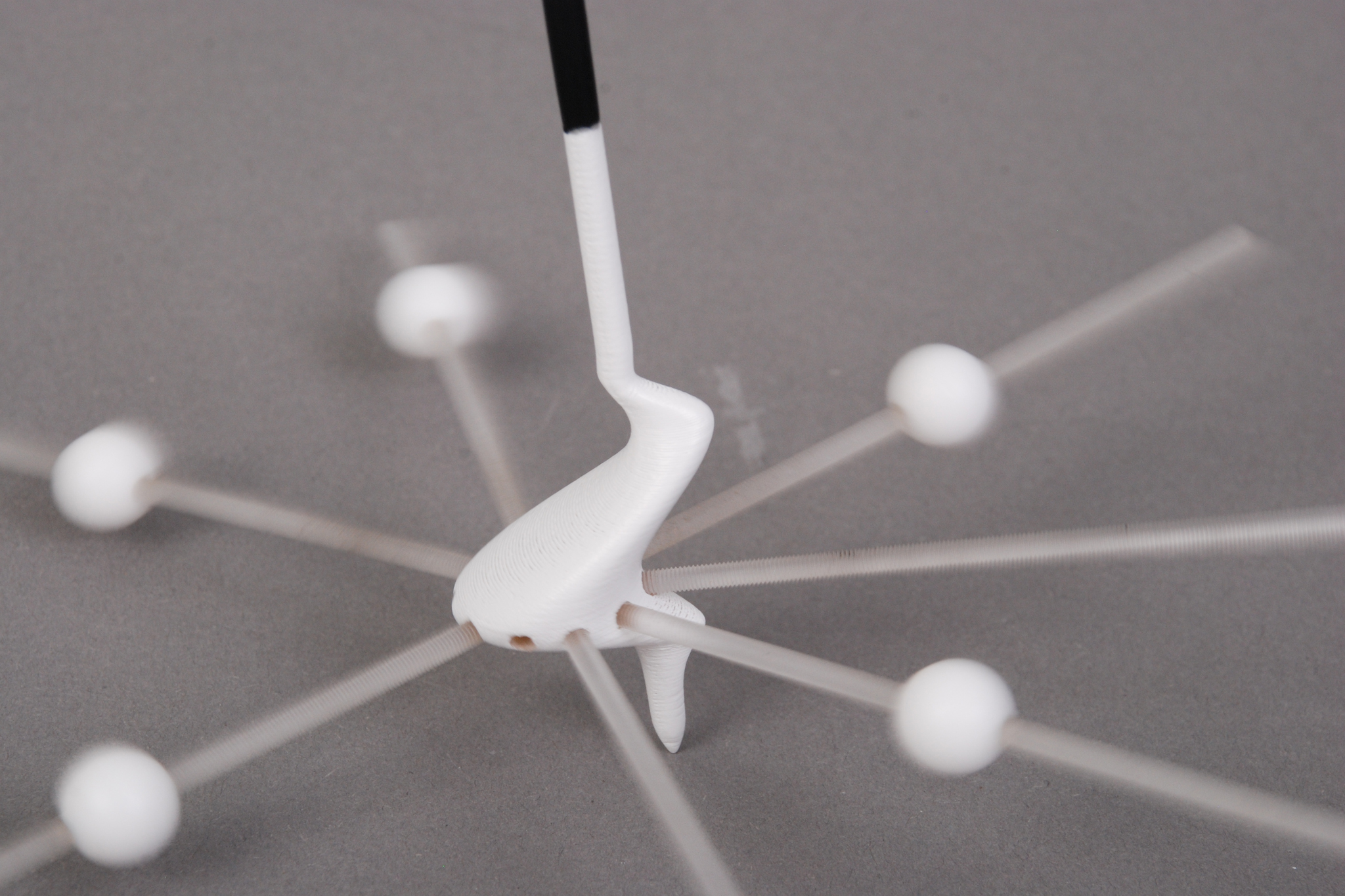 Dies wurde durch Zusatzmassen gelöst, die auf einer Ebene durch den Schwerpunkt, senkrecht zur gewollten Rotationsachse, stufenlos und exzentrisch verstellt werden können. Im konkreten Fall können Teflonkugeln über ein Gewinde auf einem Gewindestab aus Acrylglas bewegt werden und exakt so eingestellt werden, dass im Kreisel Ausgeglichenheit der Trägheitsmomente herrscht und er so ruhig auf der Spitze drehen kann.