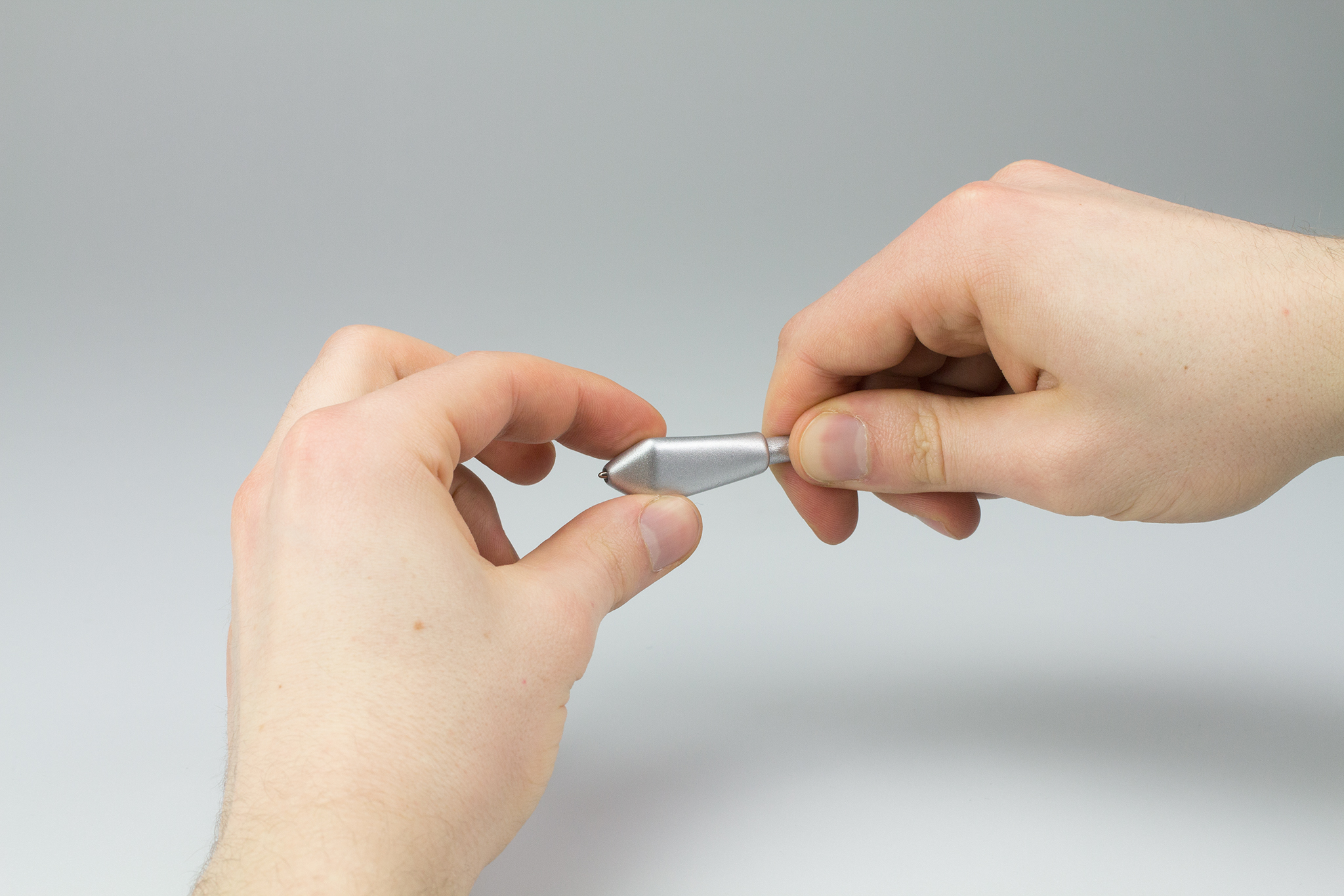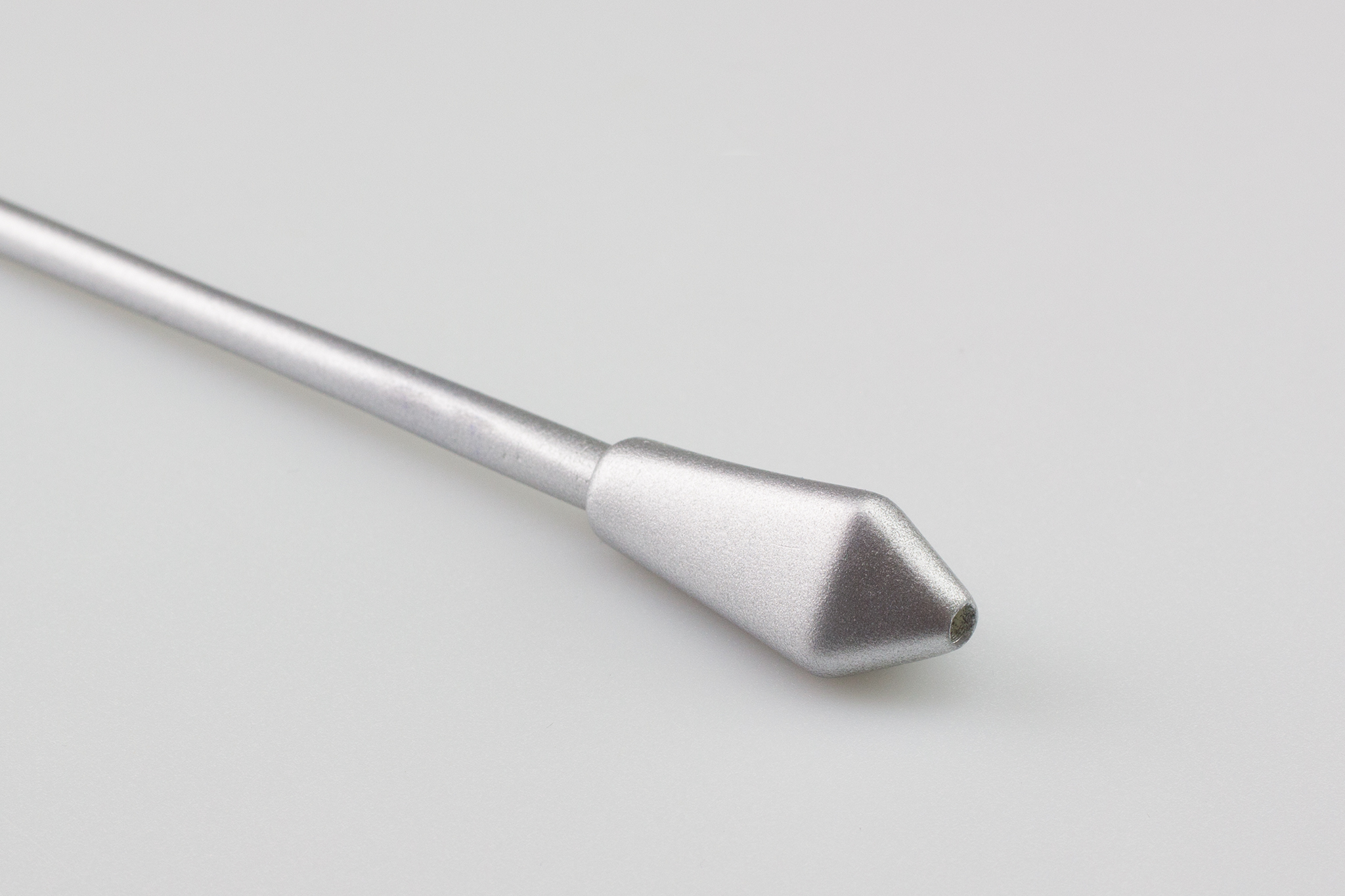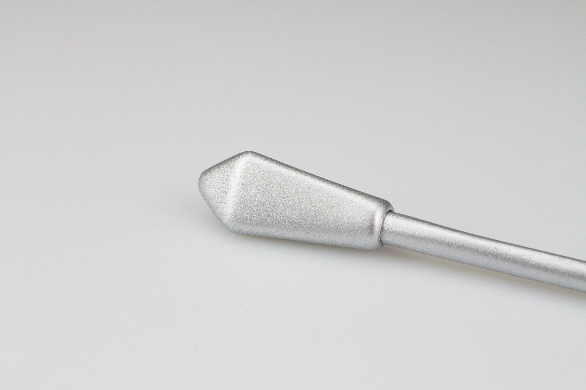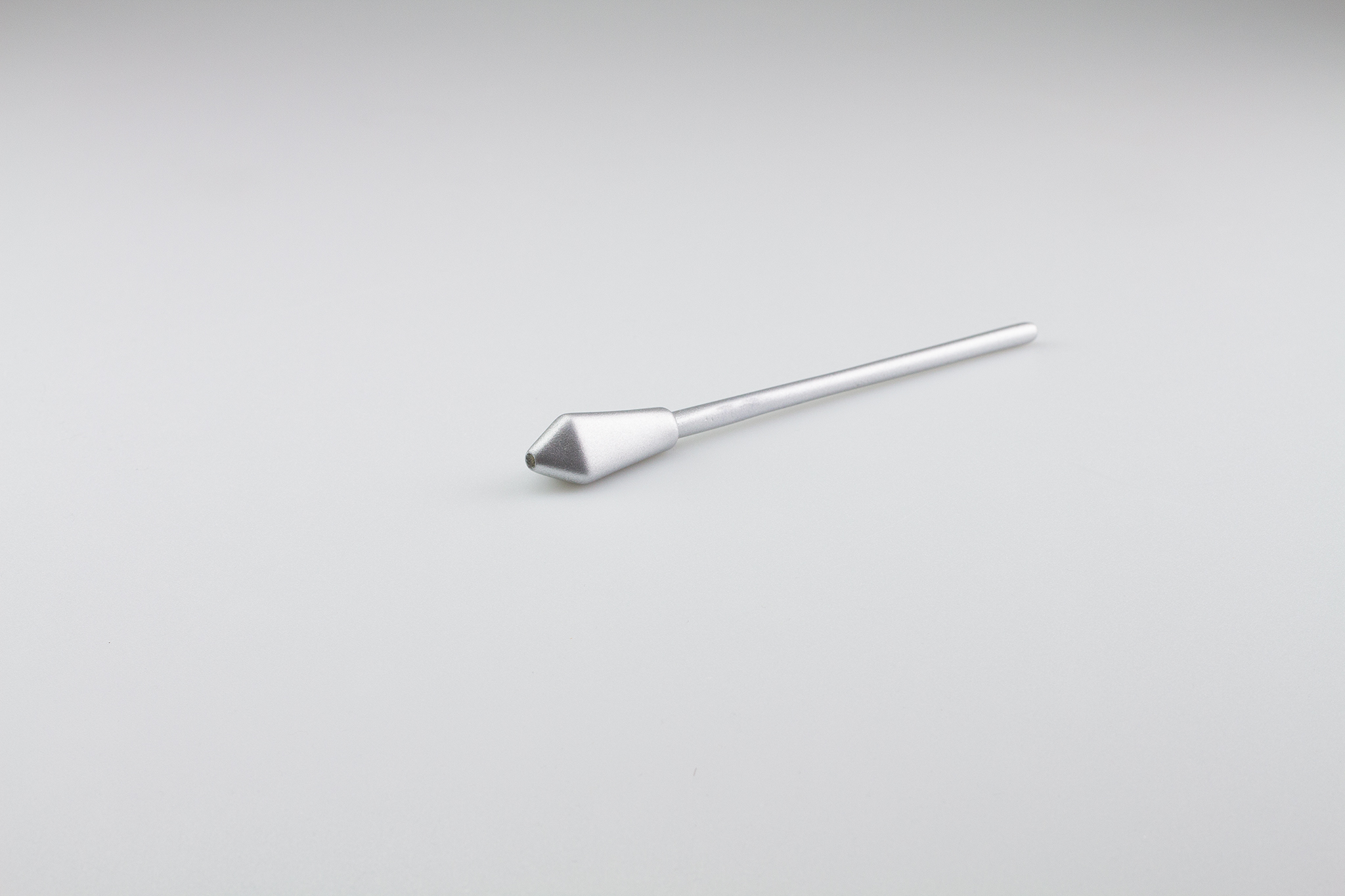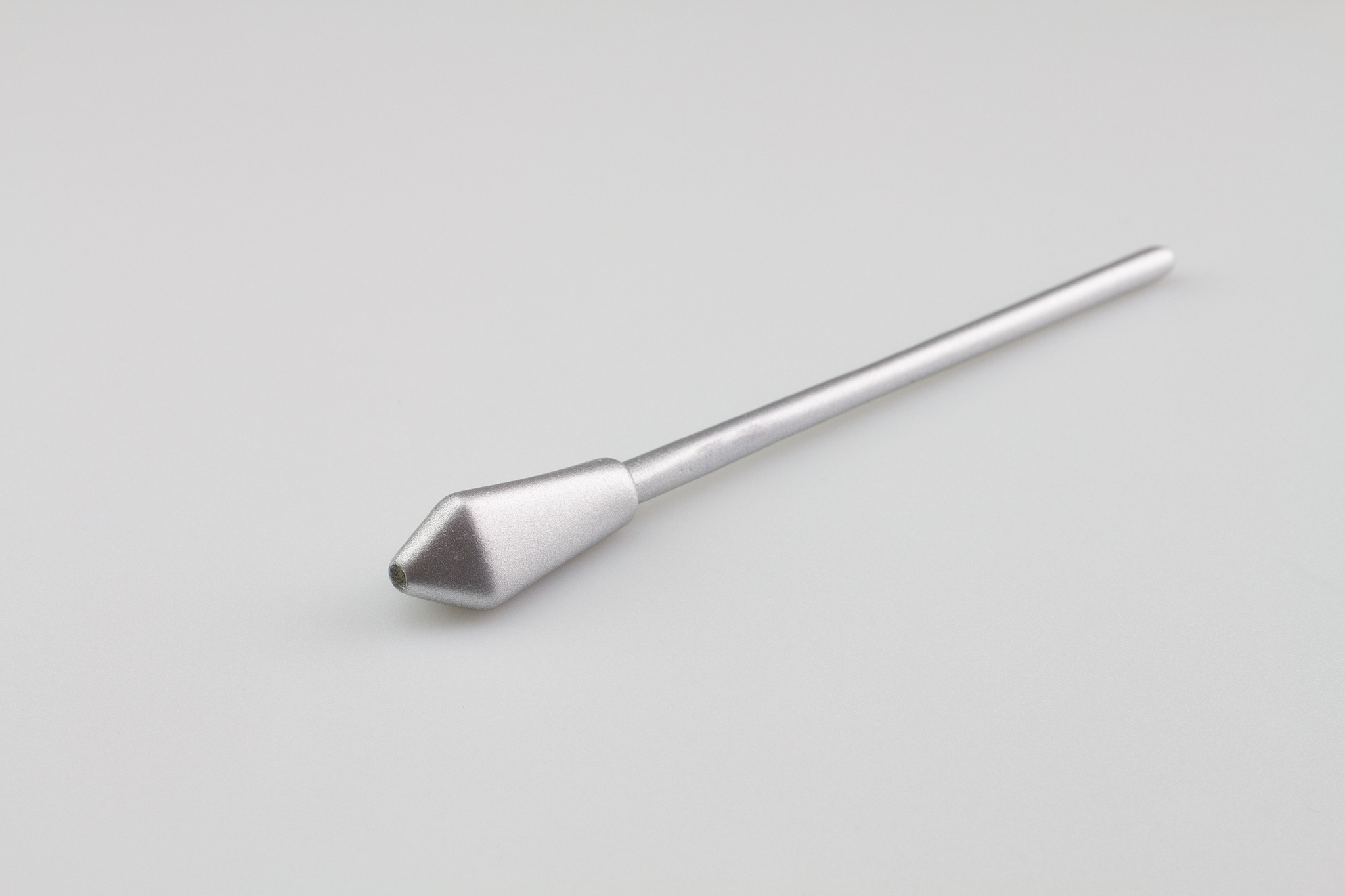 Durch die metallic-Lackierung entstehen Assoziationen von Wertigkeit und Eleganz, und gleichzeitig wird Robustheit und Widerstandsfähigkeit signalisiert. Die leicht spiegelnde Oberfläche betont die Strukturübergänge im Stiftkopf und die Mischung aus geometrischer und organischer Formalästhetik.