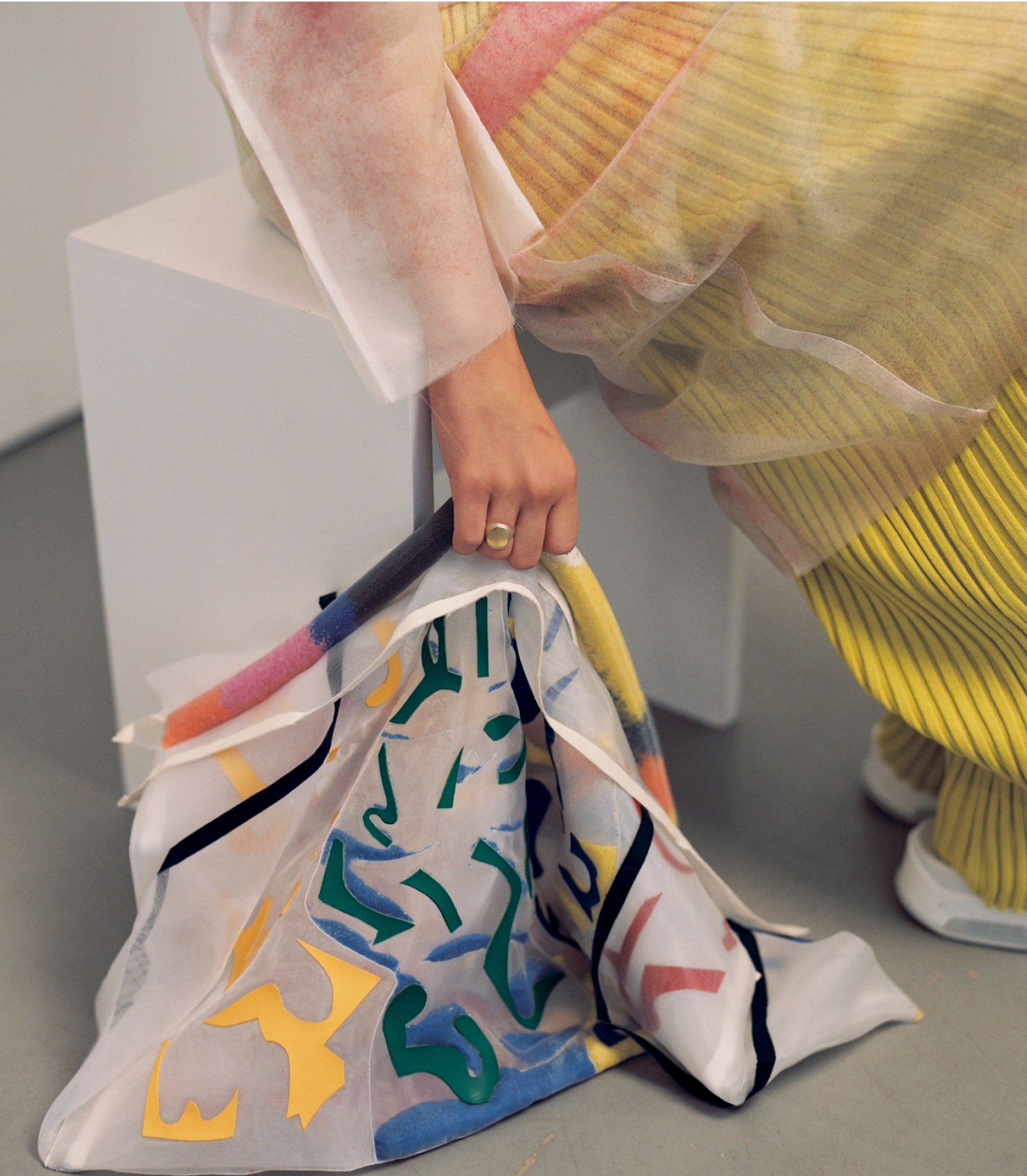 Gleichsam wie bei den Fauves und der Brücke ist die Farbe auch in der Kollektion ein bestimmendes Element, sie dient nicht mehr nur als Mittel zum Zweck, sondern darf in ihrer ursprünglichen, pulvrigen Konsistenz die Kleidung verändern und sich in ihr bewegen. Prall gefüllte Organza-Partien hingegen definieren durch das Farbpulver die Form der Accessoires oder dienen der Stabilisierung eines