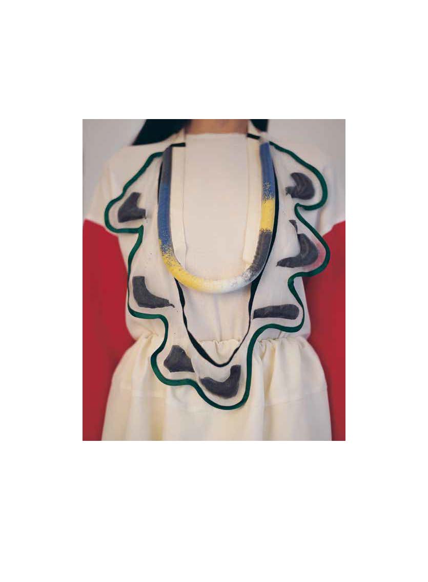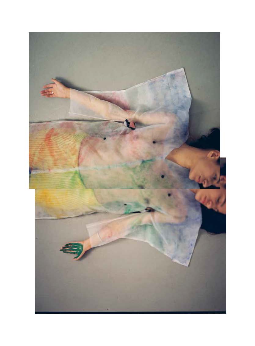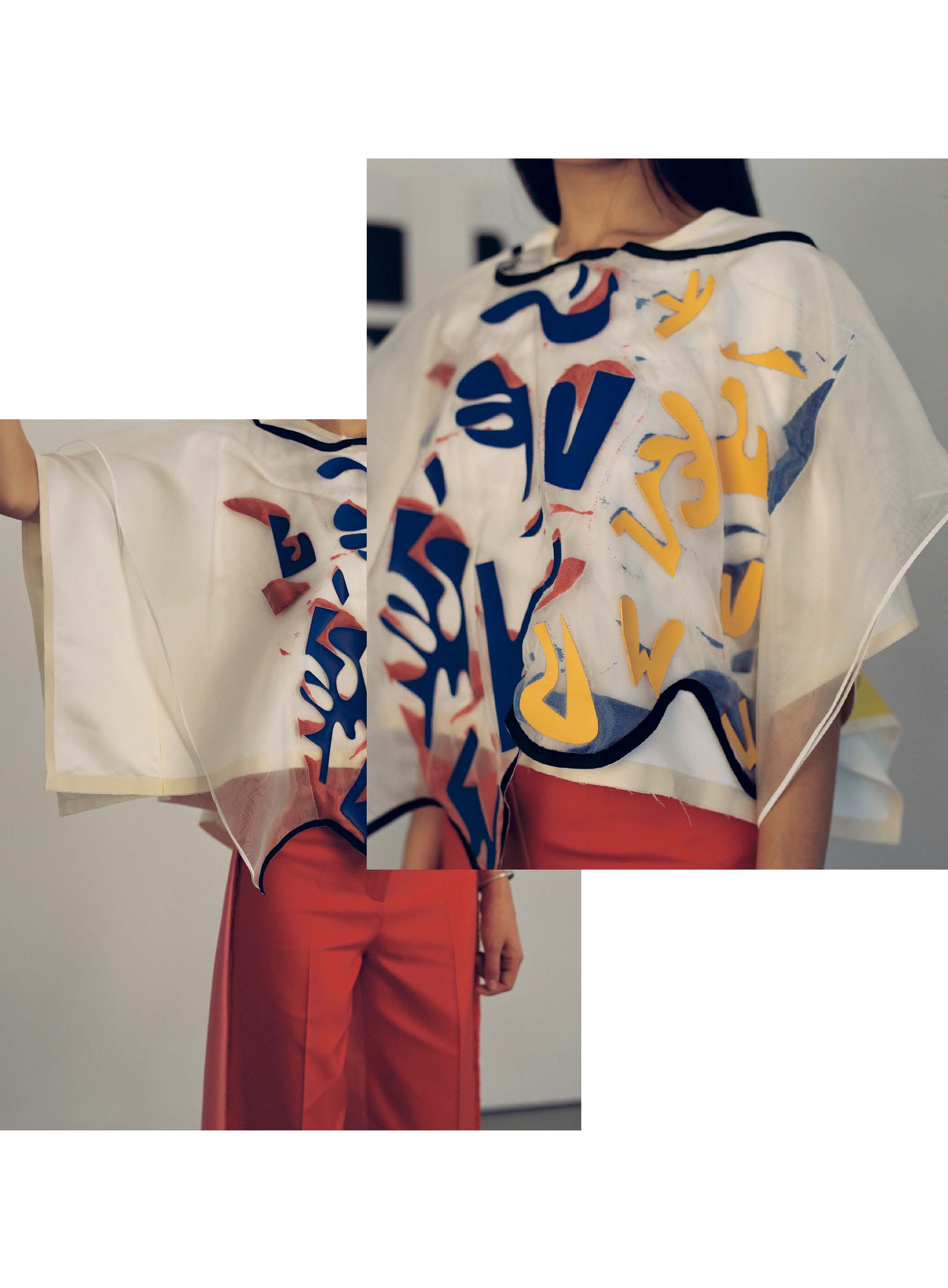 Taschengriffes. Bedruckte Layerings bilden ungeplante neue Farbspektren durch die Transparenten Überlagerungen. Die Recherche über die ersten Künstlergruppen die sich gegen die rein akademischen Lehrmethoden auflehnten, zeigten mir die Offenheit der Künstler gegenüber den Möglichkeiten, die das Material bietet. Sie erklärten ihre Ausdruckskraft, die in der Imagination des Fernen und Fremden ihren Ursprung hatte. Diese Eindrücke transformierte ich auf meine Arbeit und fand dabei zahlreiche neue Ansätze, die mir zeigten, dass noch lange nicht alle Möglichkeiten innerhalb der Mode ausgeschöpft sind.