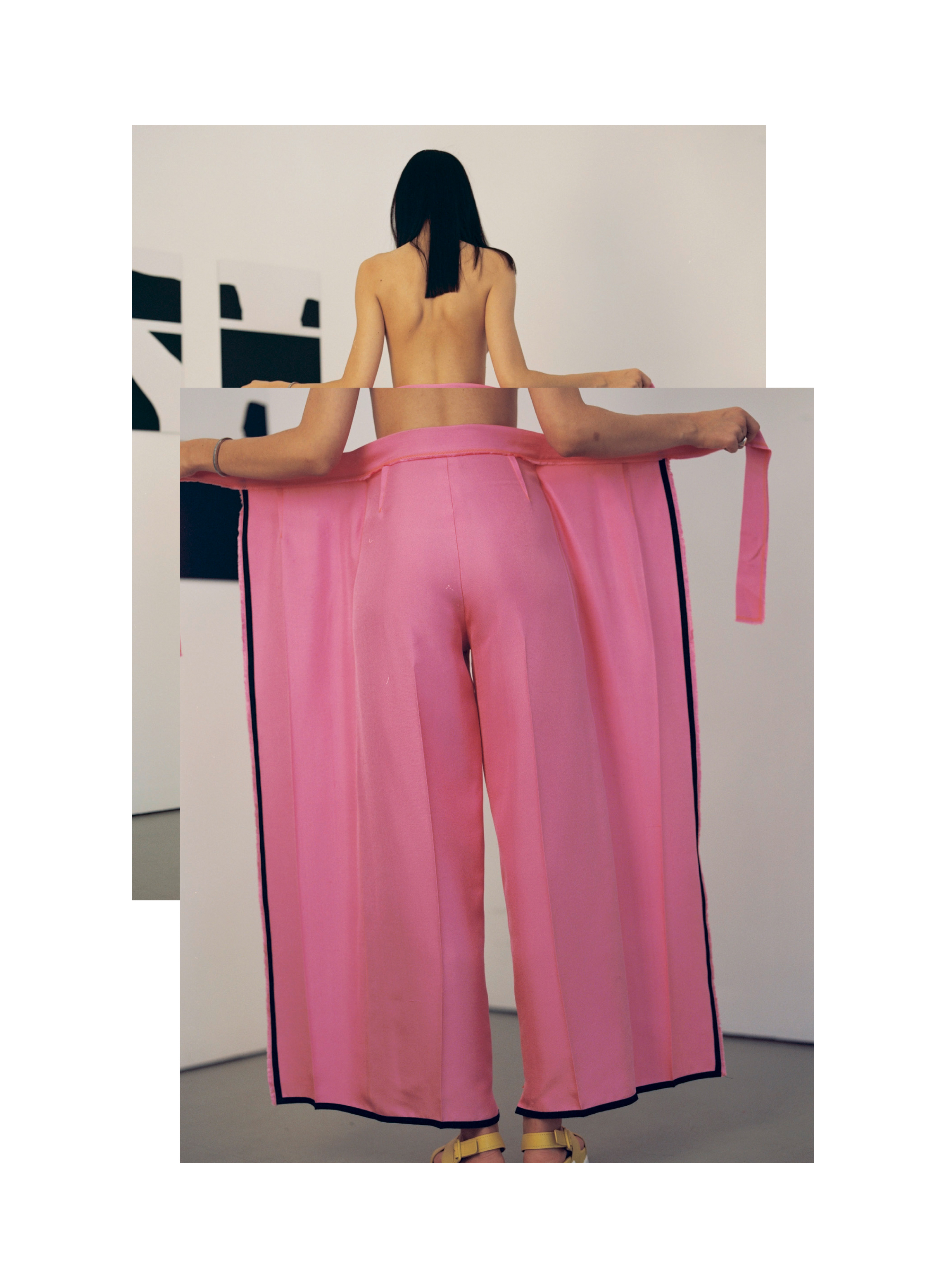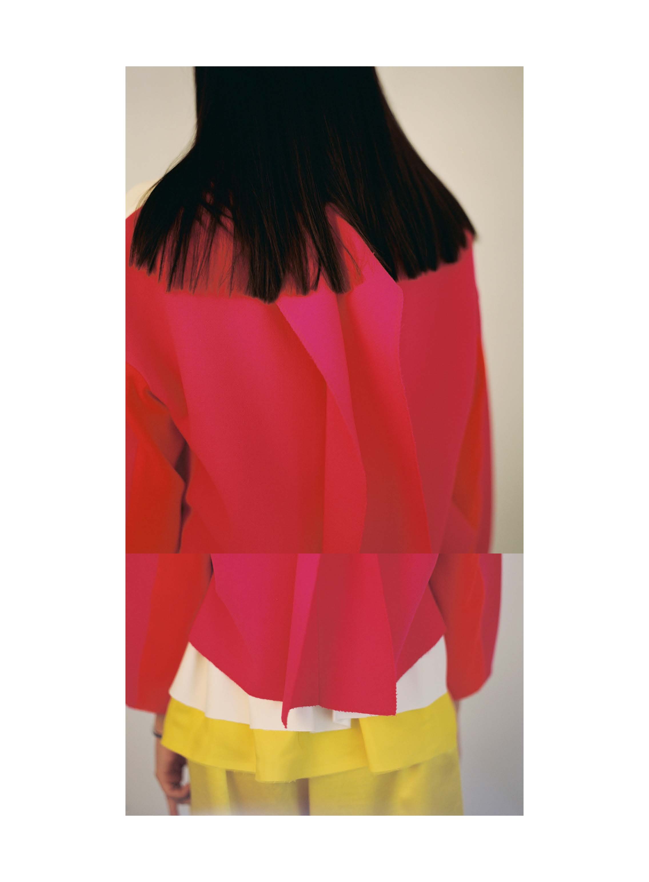 bildet stattdessen die abstrakte Malerei eine große Inspirationsquelle für neue, in der Mode anwendbare Methoden. Das rechteckige Tuch als Ursprung eines jeden Kleidungsstückes greift das Verlangen nach Reduktion und Einfachheit auf.