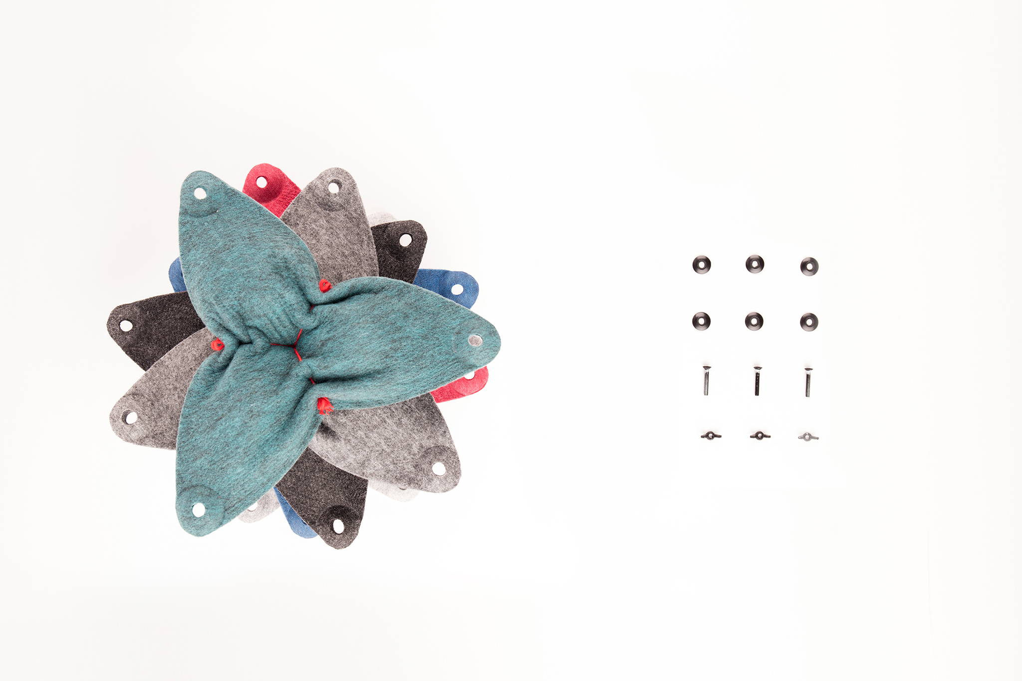 Die einzelnen Module sind aus Formvlies gefertigt, das sich dank seiner Eigenschaften hinsichtlich Schallabsorption und Verformung, sowie aufgrund seiner Leichtigkeit und Stabilität hervorragend als Material für Raumteiler eignet.