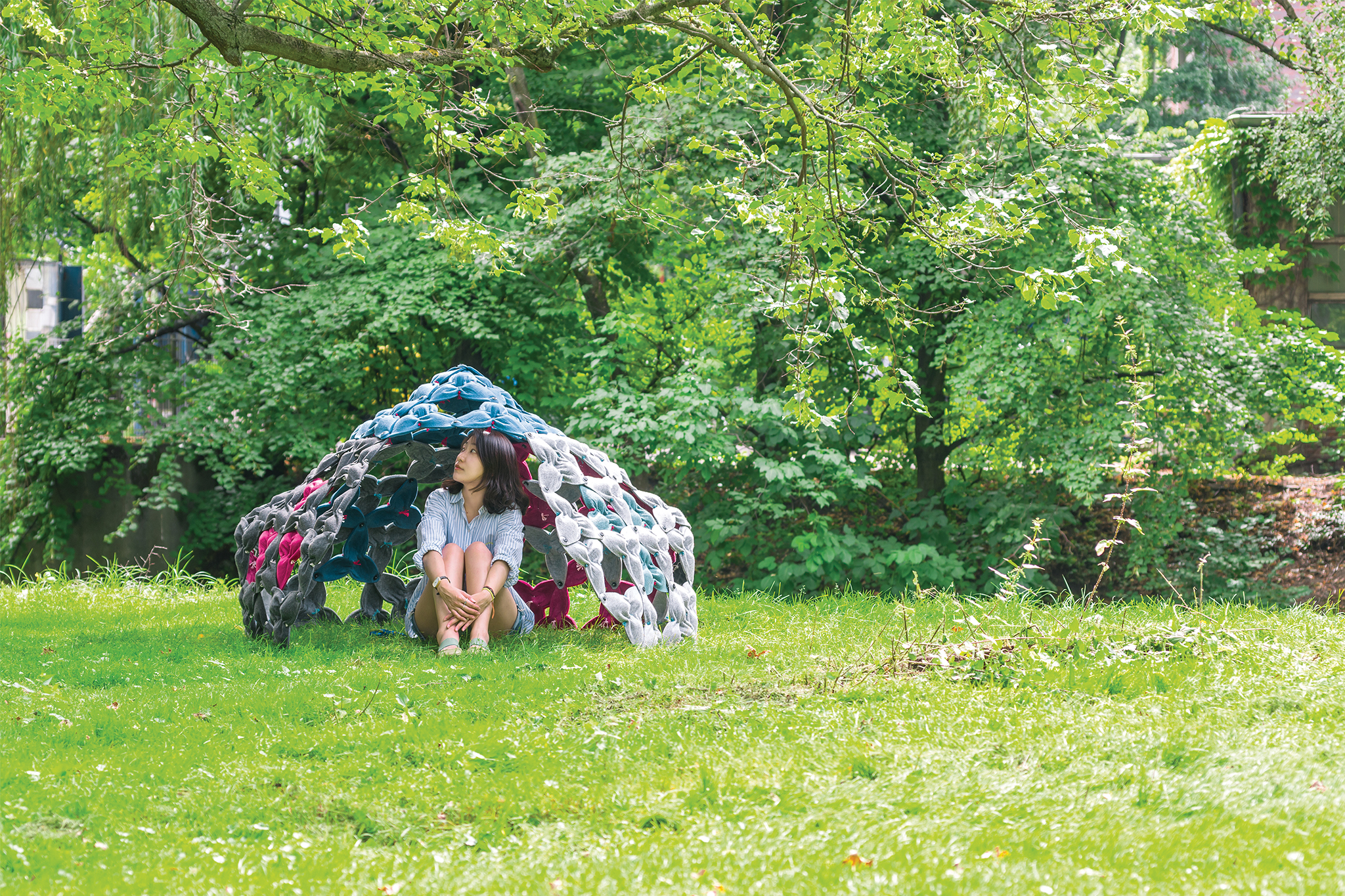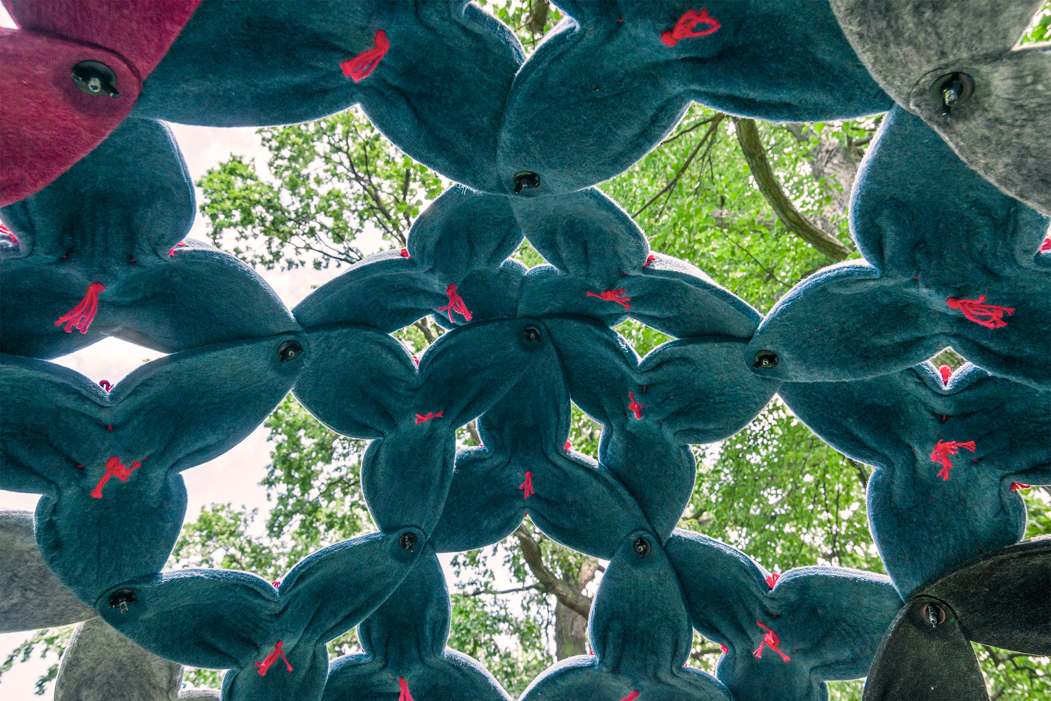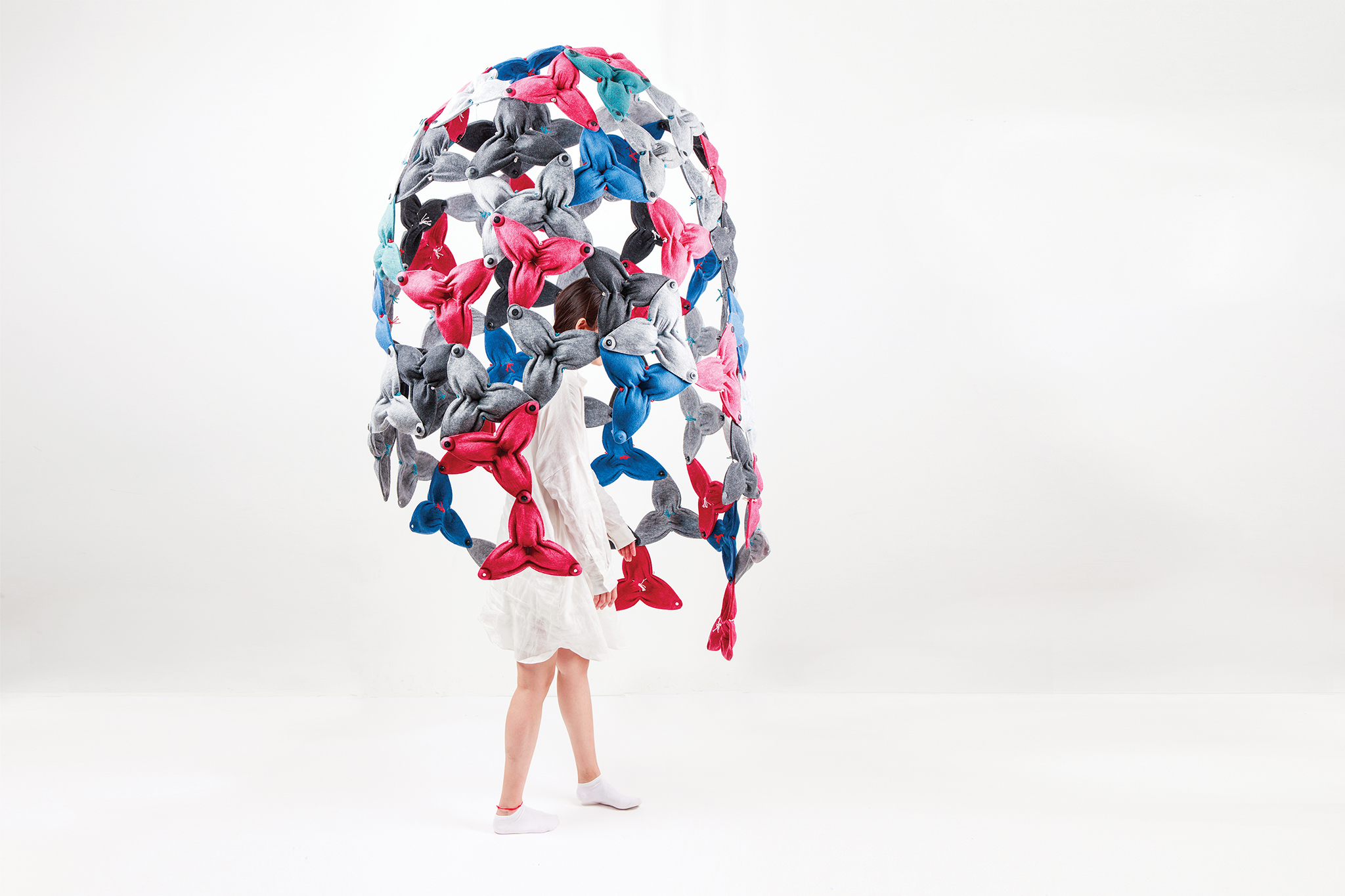 Dazu benutzte ich vor allem Fäden, um die Vliesmatten zusammenzuziehen und somit “natürlich” gewölbte Flächen und Körper zu erzeugen. Über die Wahl der Nähte, Zugrichtungen und -stärke konnten vielfältige Varianten entstehen. Es braucht nur einen Faden. Dank der mit Falten konstruierten Formung macht das Modul auf gesamten Strukturen genüge Stabilität.