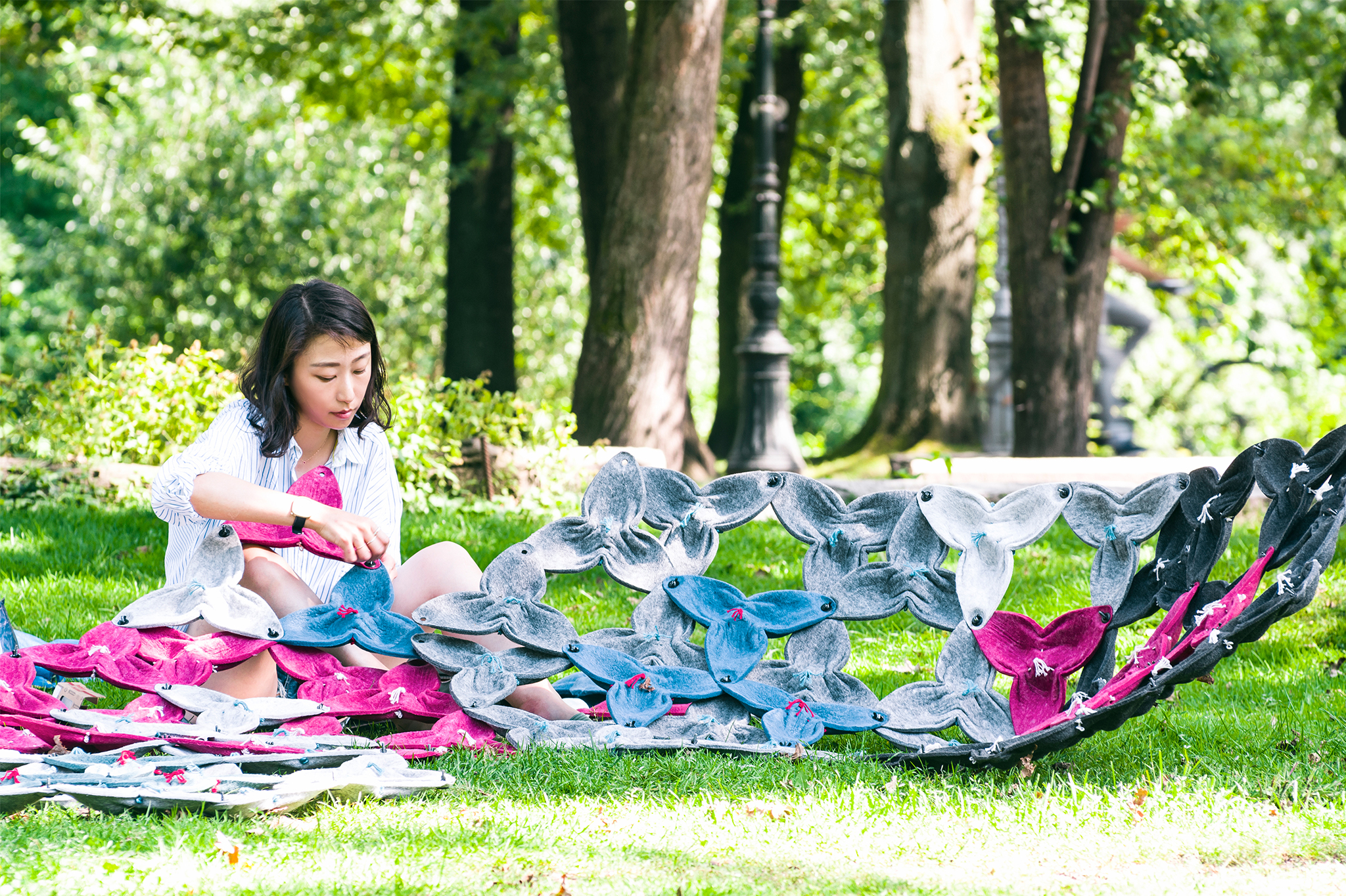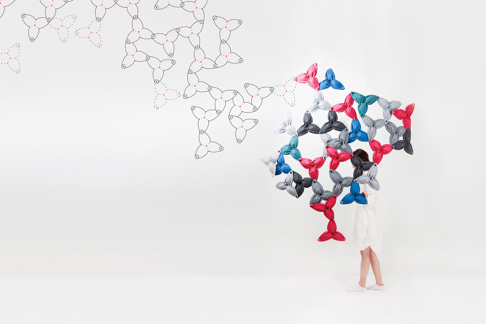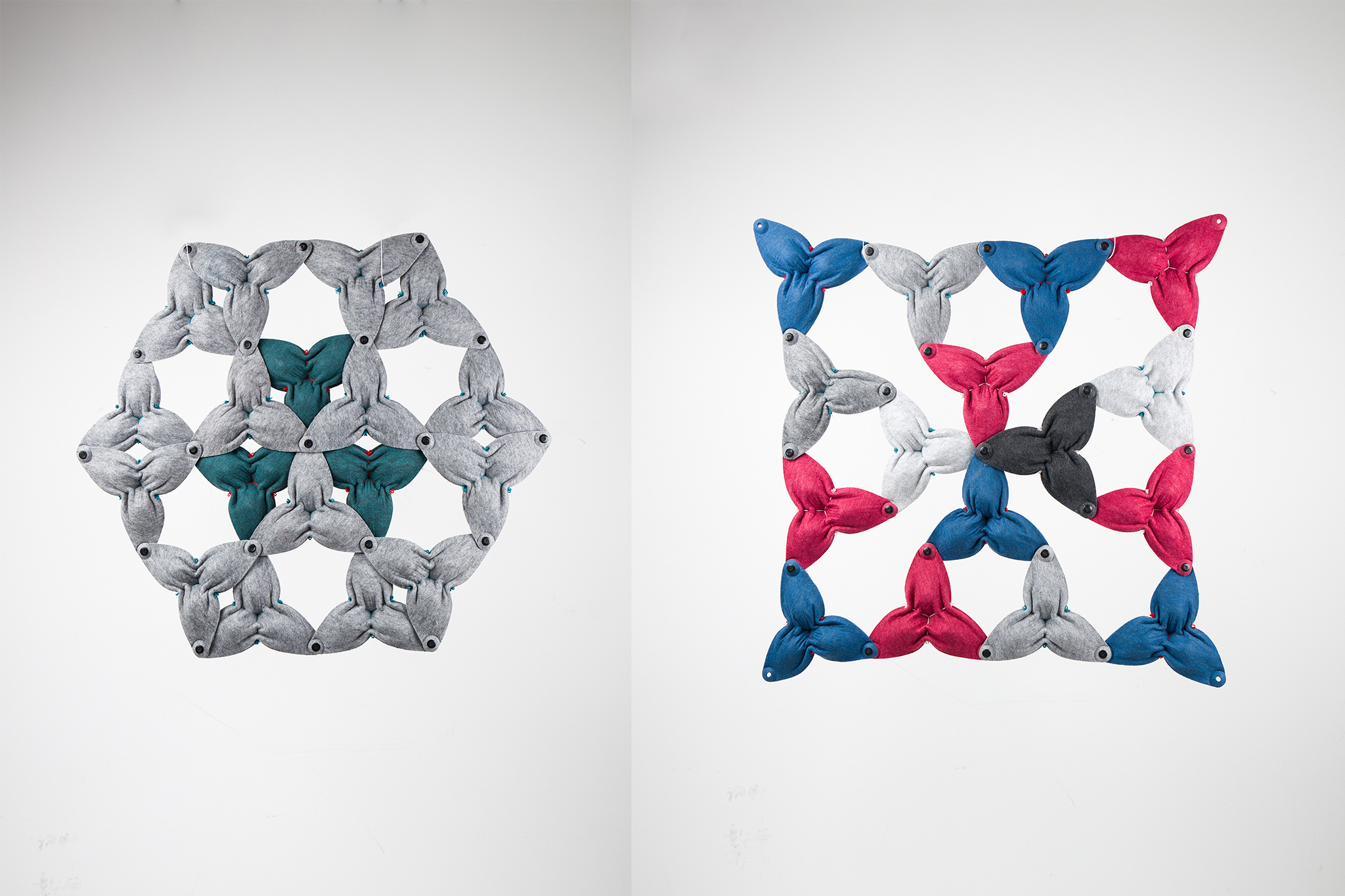 Modulare Systeme sind insofern dankbar, als sie stets aus einzelnen Elementen und Verbindungen bestehen. Die Ausmaße des am Ende entstehenden Konstrukts werden lediglich durch die Menge der verfügbaren Einzelelemente bestimmt. Hier bietet sich Formvlies als Material besonders an, da zum Einen das Pressverfahren eine schnelle und effiziente Massenproduktion ermöglicht. Zum Anderen erleichtert es durch sein geringes Eigengewicht den Bau potentieller größerer Konstruktionen. Durch das geringe Gewicht sind sowohl hängende als auch freitragende Konstruktionen möglich.