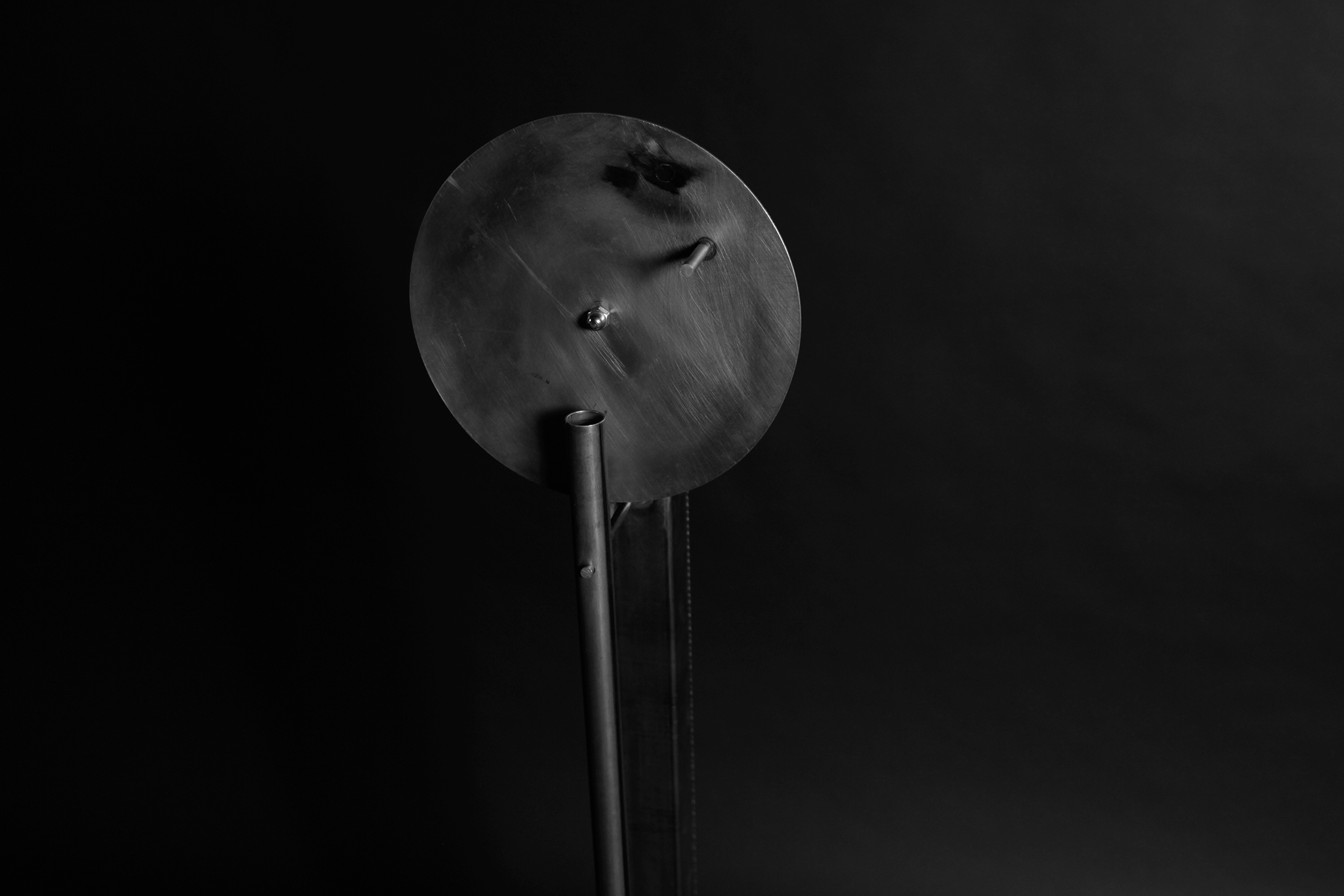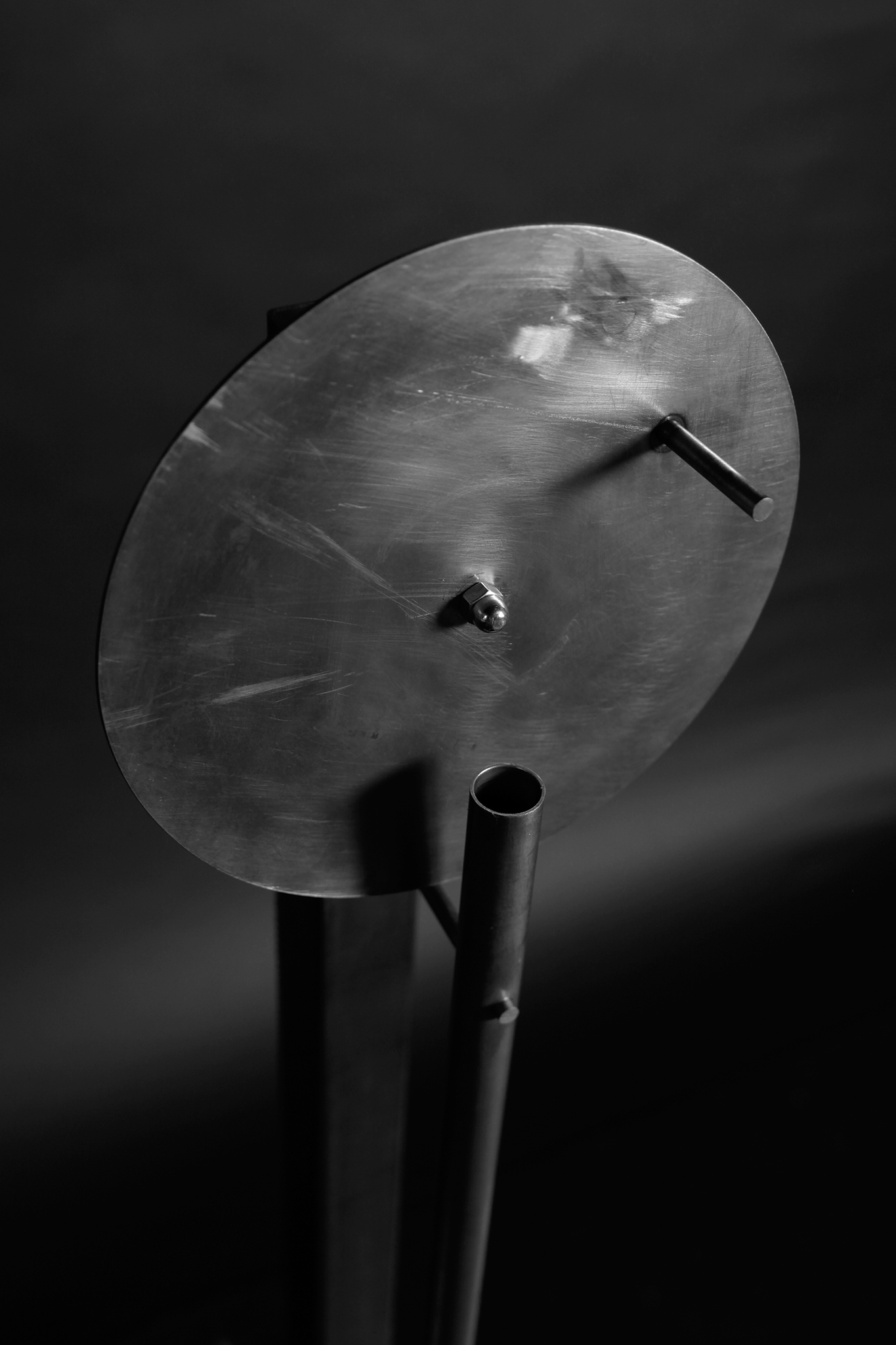 Im Inneren des Rundrohprofils sind zwei UV LED´s, die durch eine Knopfbatterie versorgt werden, verbaut. Die für den Rezipienten von aussen nicht sichtbare Lichtquelle pendelt so im kurzen Abstand über den im unteren Abschnitt integrierten Betonguss. Die Oberfläche des Standfusses wurde mit einem transparentem Gemisch aus Nachleuchtpigmenten und Klarlack glasiert. Durch die im Pendel integrierten UV LED´s wird so die einlackierte Betonoberfläche zum Aufladen gebracht. Resultat dieser Reaktion ist ein phosphorisierender Lichtstreifen, welcher nach dem Kontakt mit dem ultraviolettem Licht langsam erlischt.