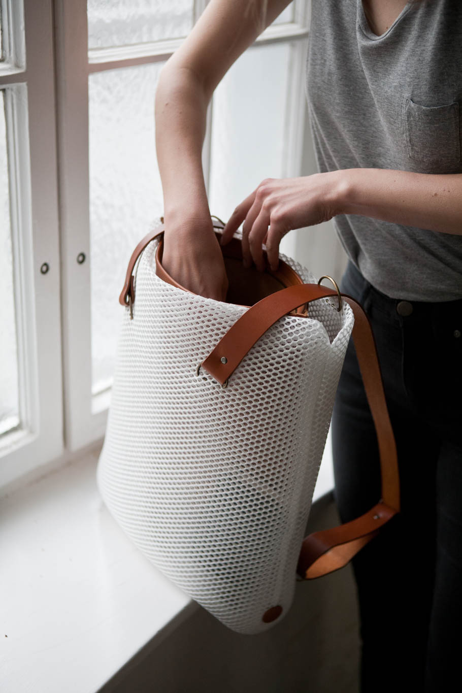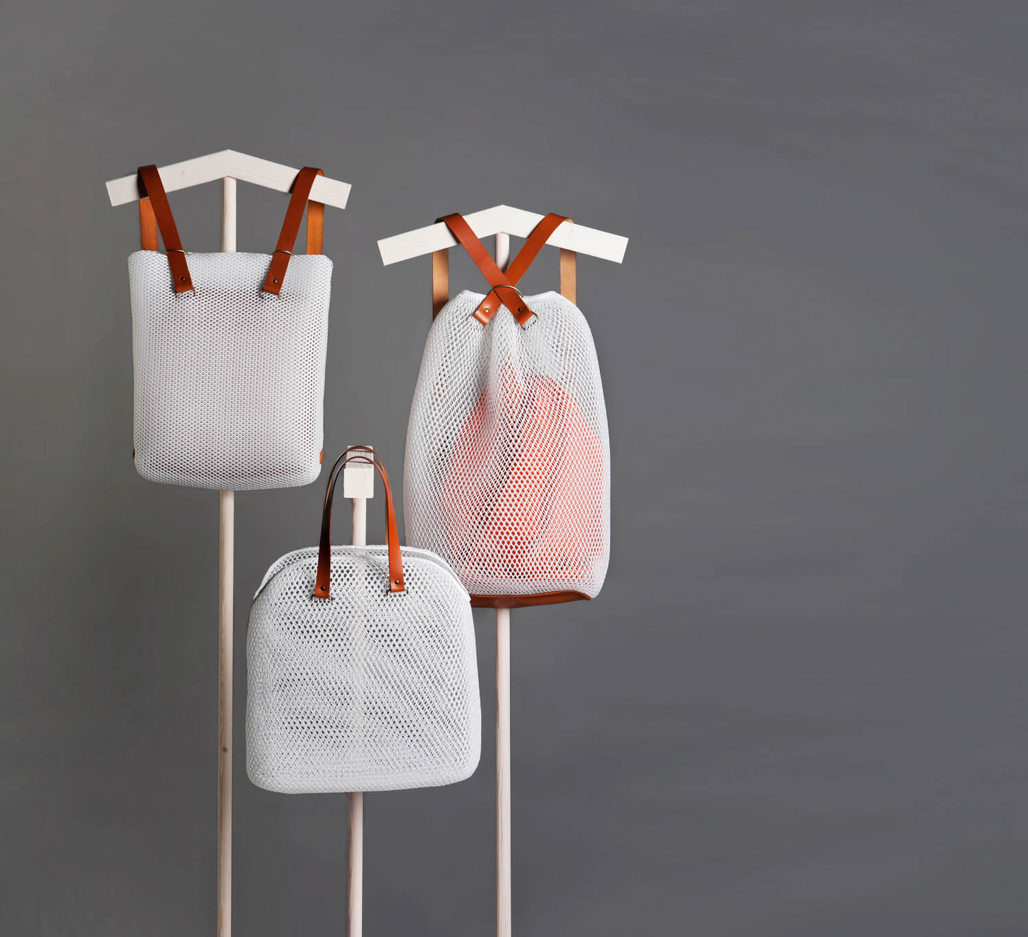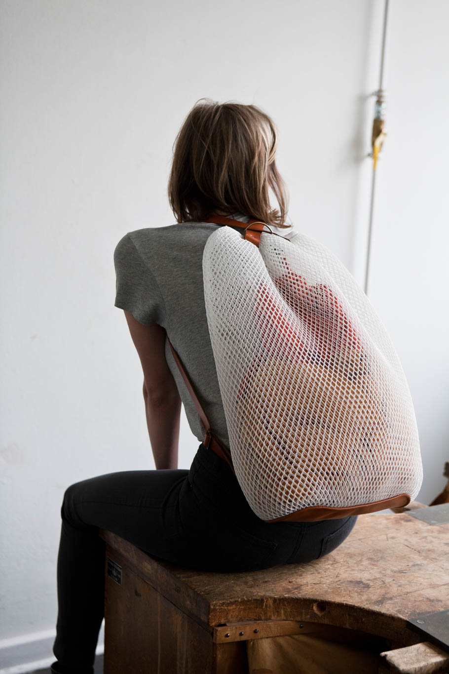 Der Balloo Collection liegt ein sogenanntes Abstandsgewirk zugrunde. Ein durchlässiges Polster, das als Tasche nicht mehr sein will denn ein Korb, ein Netz, welches Inhalt zusammenfasst. Ein Cocon, der die getragenen Elemente schleierha! umhüllt. Die Rucksäcke haben beide ein dichtes Herz, Innentaschen, die wichtige oder fragile Sachen noch mal besser schützen und, die nach Belieben und Bedürfnis mit anderen Innentaschen kombiniert werden sollen.