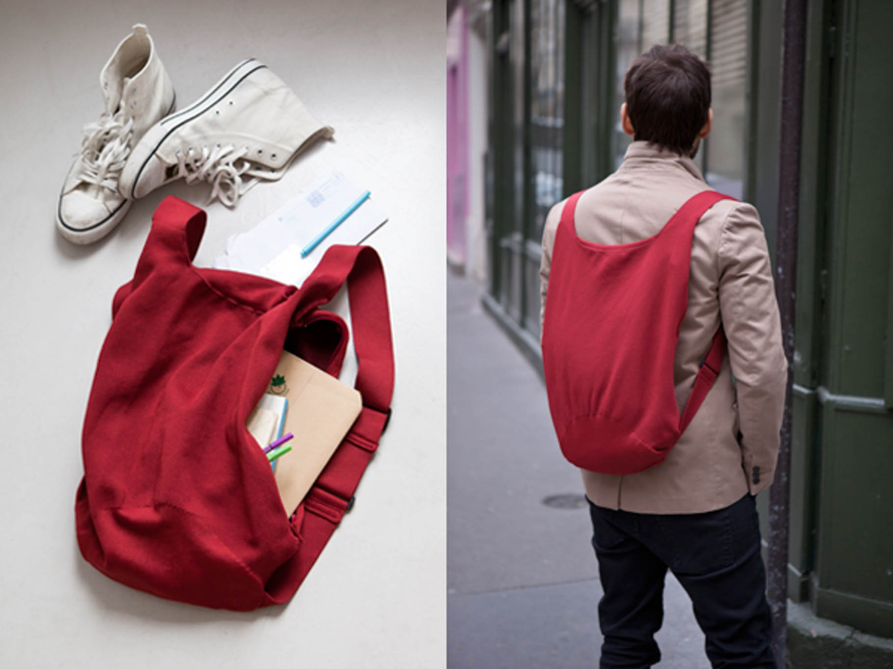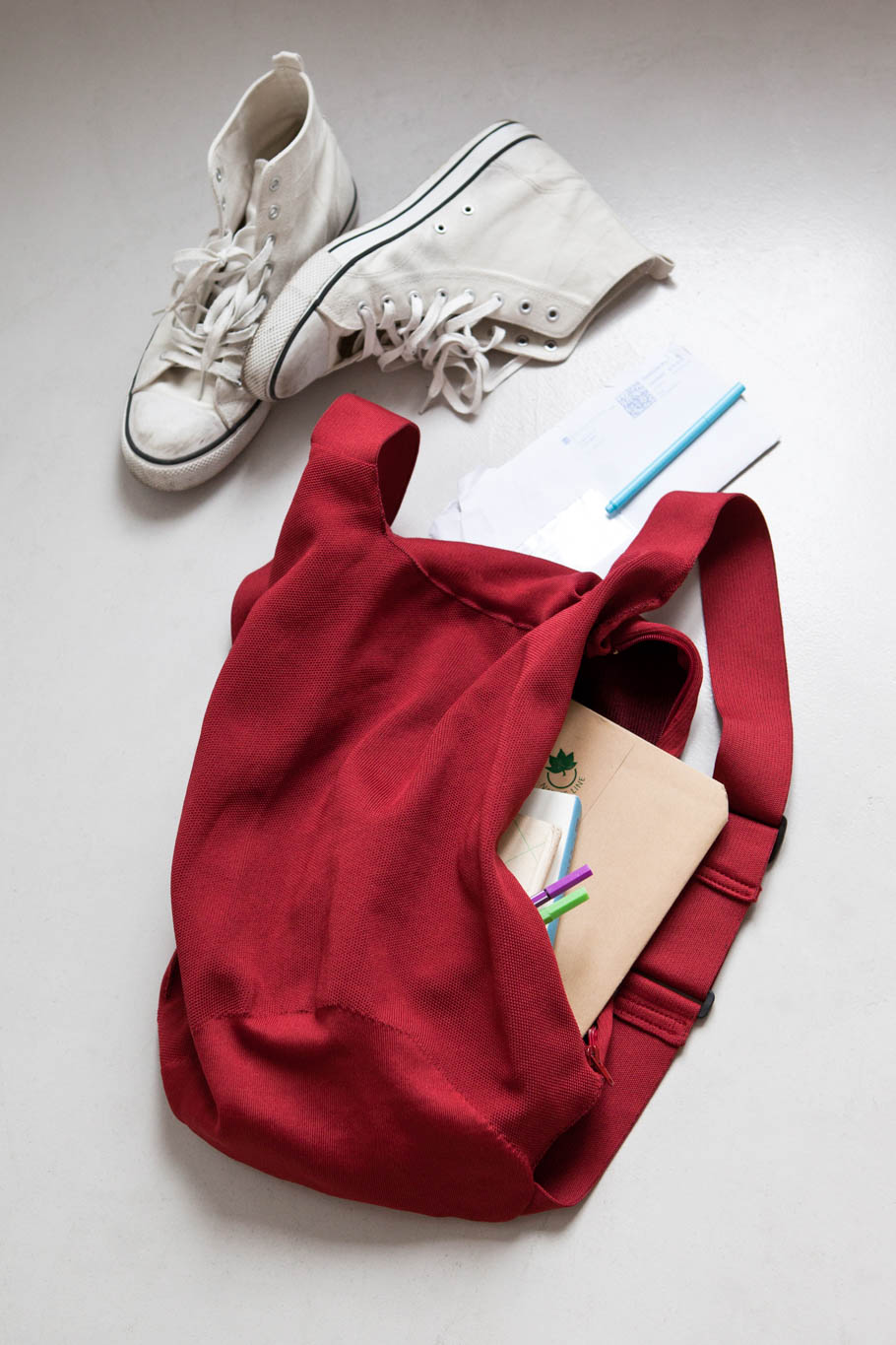 Sans-serif ist ein Rucksack der in einem dreidimensionalem Strickverfahren hergestellt wird. Der Rucksack besteht nur aus einem Teil, welcher von der Strickmaschine in einem Schuss produziert wird. Dabei entsteht ein Objekt, das näher an einem Kleidungsstück liegt als einem herkömmlichen Rucksack. Das Gestrick verleiht dem Sack Geschmeidigkeit und durch das Polyestergarn erhält er seine Beständigkeit. Der leichte, weiche als auch robuste Rucksack wird an einem Stück gestrickt, ist aber durch unterschiedlich dicke und elastische Zonen gegliedert, die durch ein vorprogrammiertes Strickmuster festgelegt sind.