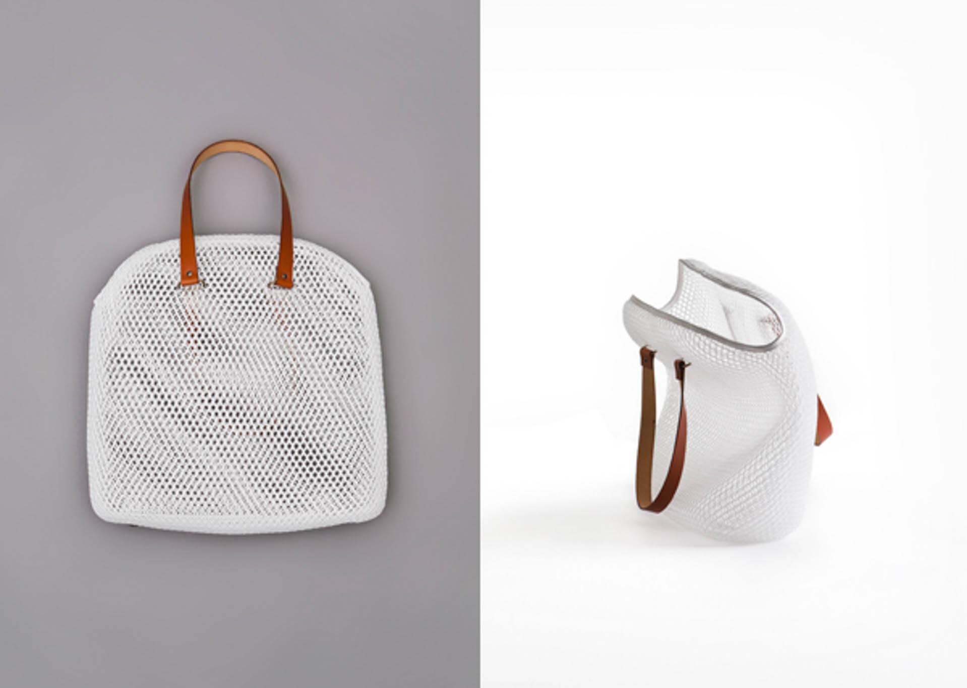 Die Netzstruktur und das Material (Polyester) ermöglichen es, einerseits durch Ra“ ungen Formen zu erzeugen, aber auch durch thermische Verformung Gestalt zu # xieren. Das Netz bietet ebenfalls die Möglichkeit, ohne eine zusätzliche Transformation des Gewebes, Haken und Ösen direkt einzufügen. Das Material besitzt durch seine versteifenden Abstandsfäden auch eine spannende Festigkeit, die eine gewisse Formstabilität gewährleistet, eine Flexibilität der Textilien jedoch weiterhin ermöglicht. Diese, dem Abstandsgewirk eigenen, Verarbeitungsweisen bilden die Basis der Kollektion.
