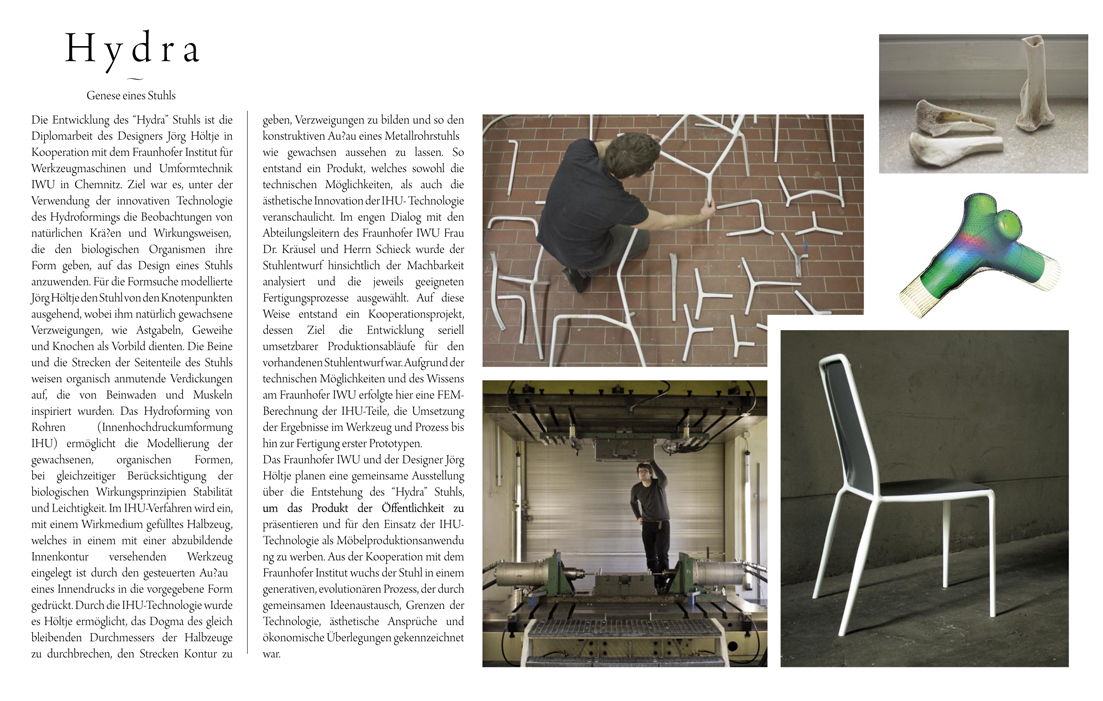 Der Stahlrohstuhl ist seit der Moderne der Designklassiker – mit Hydroforming kann man den nächsten Schritt wagen und das Rohr selbst frei gestalten. Die Entwicklung des „Hydra“ Stuhls ist die Diplomarbeit des Designers Jörg Höltje (Studio Hausen) in Kooperation mit dem Fraunhofer Institut für Werkzeugmaschinen und Umformtechnik IWU in Chemnitz. Ziel war es, unter Verwendung der innovativen Technologie des Hydroformings, die Beobachtungen von natürlichen, formgebenden Kräften und Wirkungsweisen auf das Design eines Stuhls anzuwenden. Das Hydroforming von Rohren (Innenhochdruckumformung IHU) bietet technologische Vorteile, wie die Realisierung von sehr stabilen Leichtbaustrukturen, die Reduzierung der Bauteilanzahl und Fügeoperationen. Darüber hinaus ermöglicht es die Modellierung freier Geometrien, wie die gewachsenen, organischen Formen des „Hydra“ Stuhls.