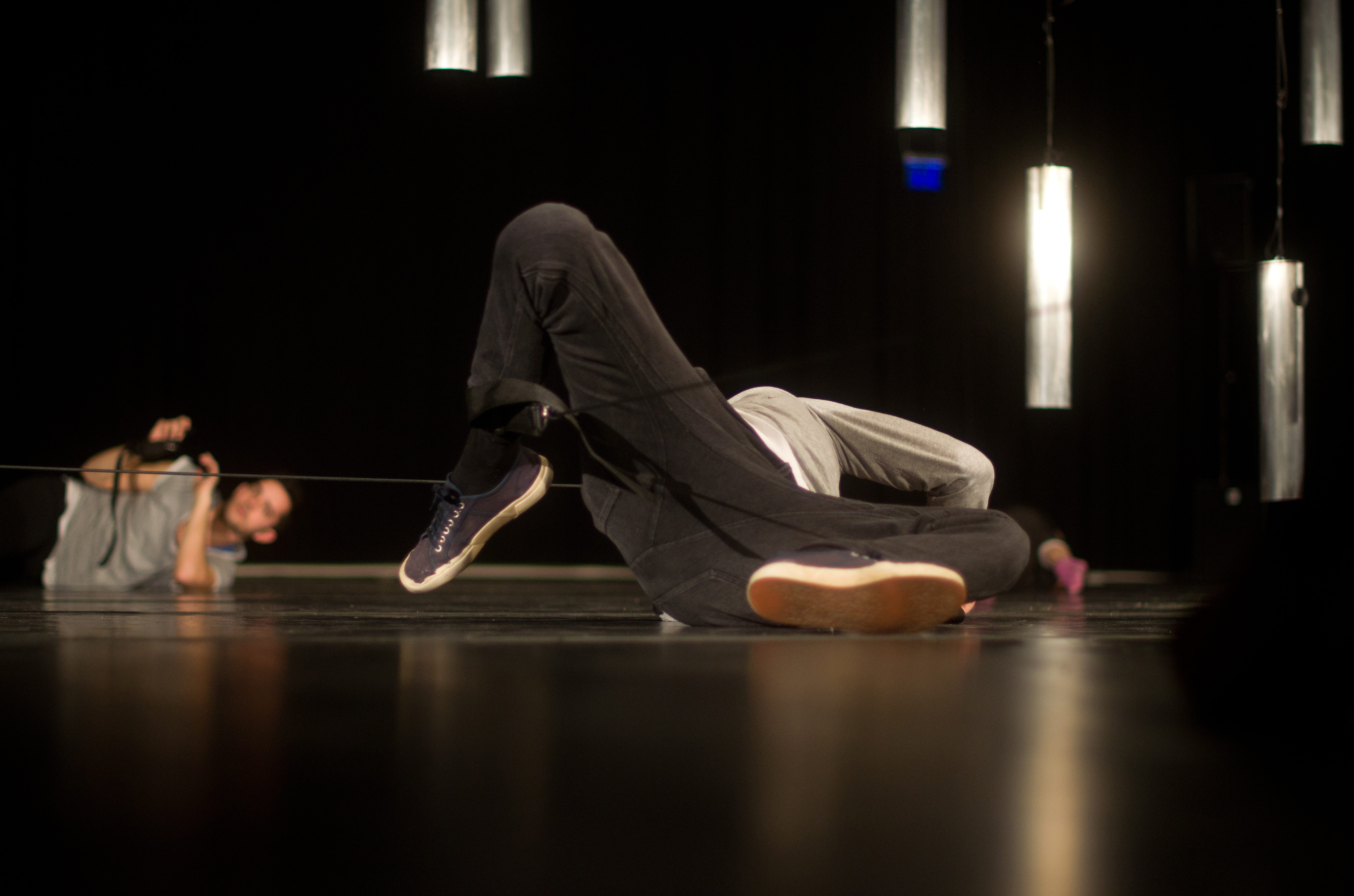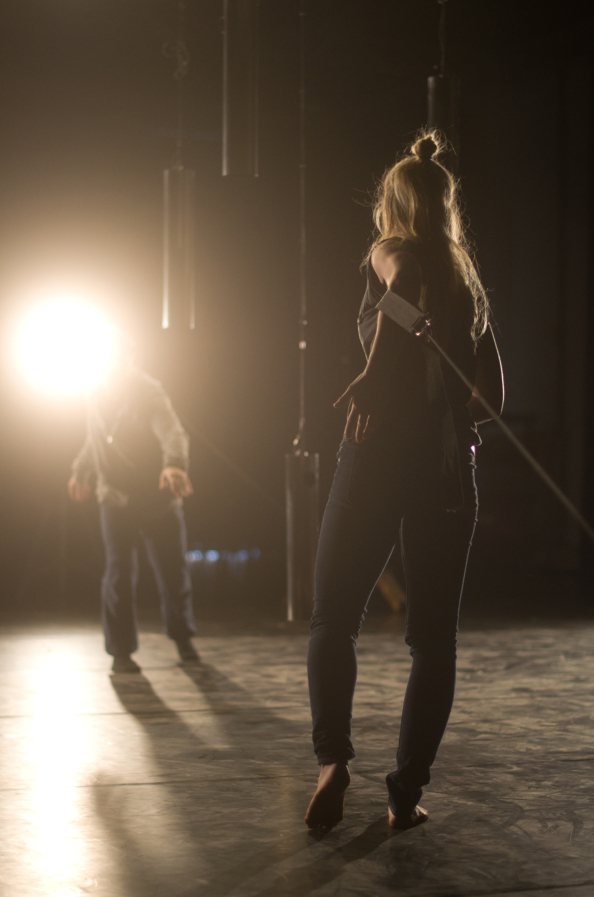 Klingende Stahlzylinder hängen von der Decke und werden über Gurte mit Seilen und Rollen durch die Luft bewegt. Sensoren innerhalb der Elemente reagieren auf diese Bewegung und konstruieren Klänge in Echtzeit.
