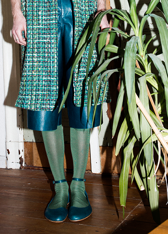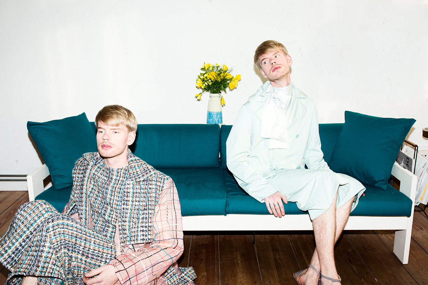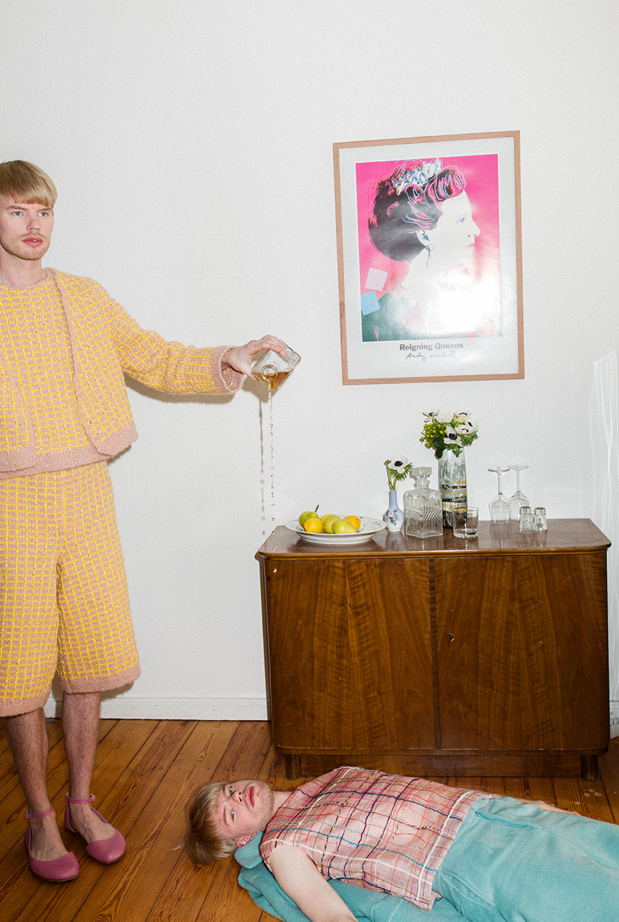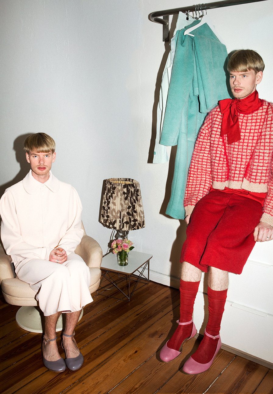 I wanted to create a symbiosis of the Queen’s universe and my own one. A festive collection for young men. But opposed to aspects like gender-bending or drag, I wanted to define the limits of my own femininity, not loosing the masculine side of things. Personally, I would feel uncomfortable in a dress, it would feel like a masquerade to me. I did not try to blur the lines of sexes – rather pointing them out – I like masculinity and I admire femininity, I wouldn’t want to give any of them up. One of the most important aspects of my collection and the main reason why I admire Margrethe II. of Denmark, is the renewal of old craftsmanship and tradition. I think monarchy is still relevant today, because it holds up culture, art and craft. The danish Queen combines old traditions with her own modern taste and thereby helps keeping rare crafts alive, and making them visible to the public.