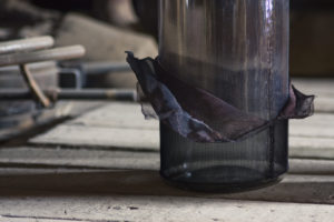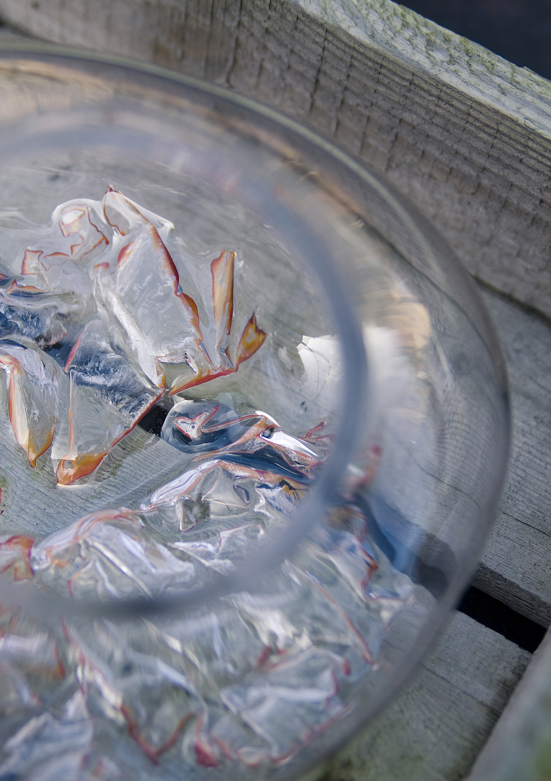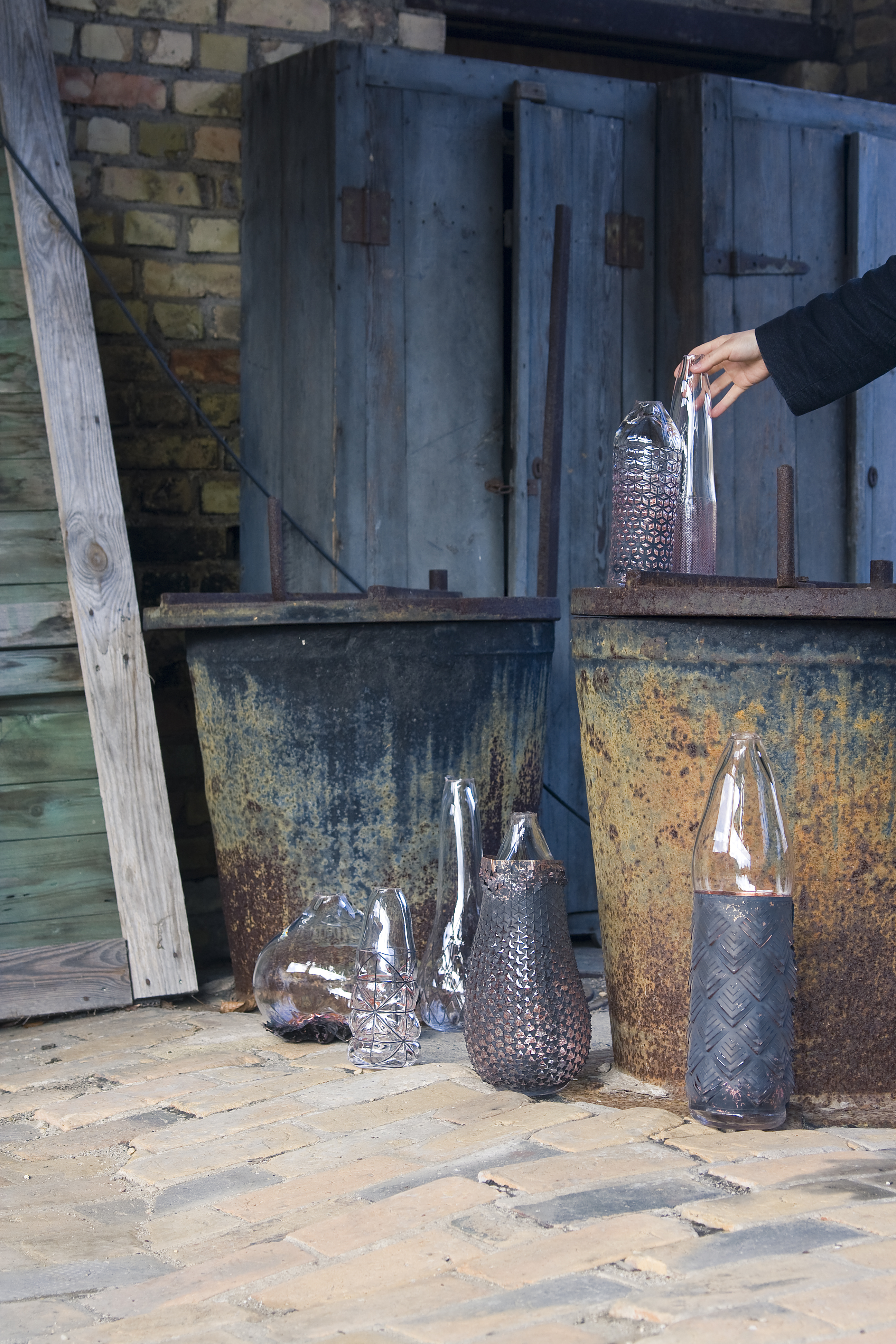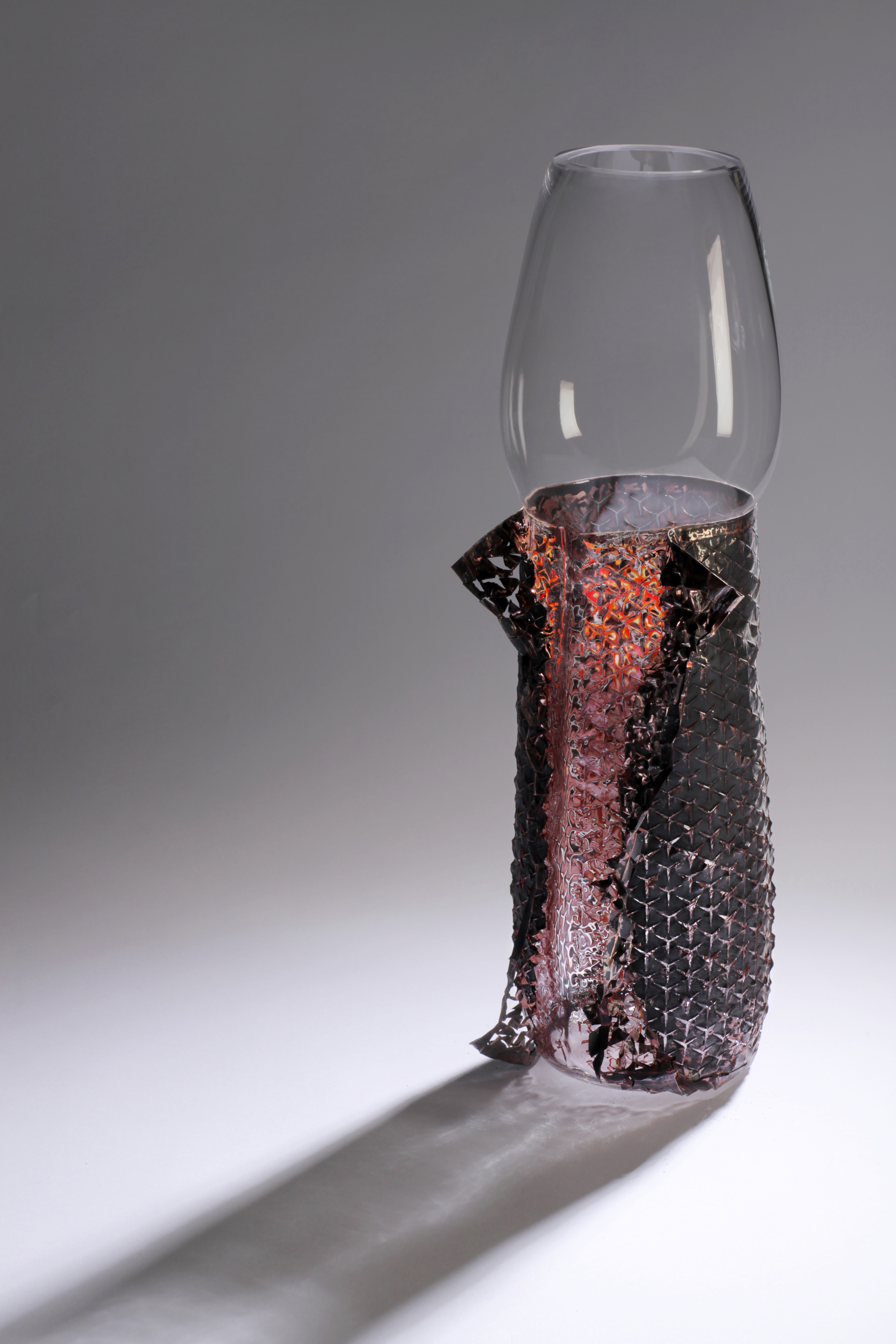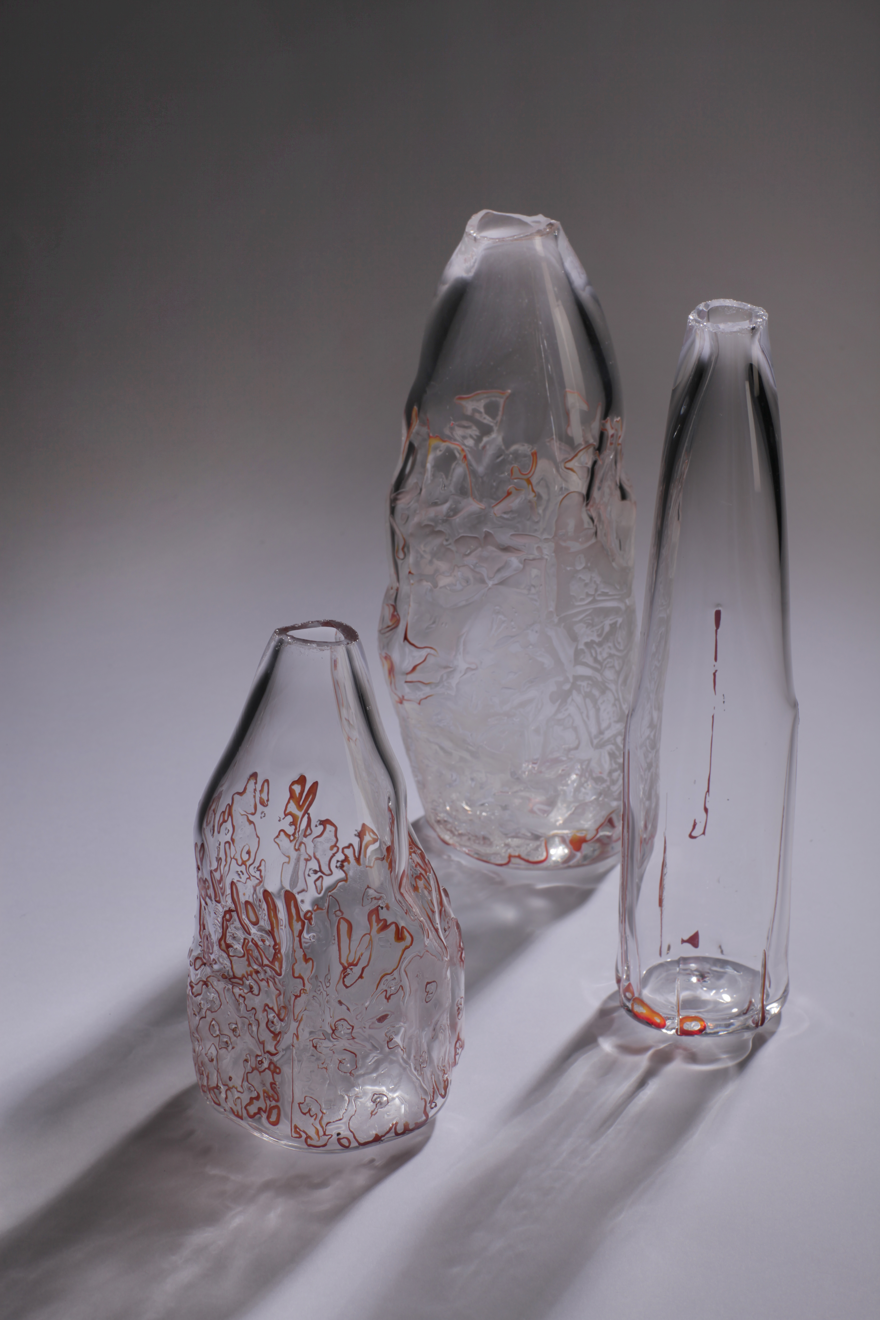 Diese Arbeit ist das Ergebnis einer experimentellen Suche nach einem Verfahren, das Spuren als Mehrwert in Objekten speichert und innerhalb klar definierter Produktionsprozesse eine serielle Herstellung von einzigartigen Objekten ermöglicht, die unsere Phantasie anregen. Durch die Freiheit meiner Herangehensweise, habe ich in diesem Projekt viel über Glas gelernt. Besonders spannend und geheimnisvoll ist die Verarbeitung des Werkstoffs, da man sein Verhalten nie vollständig kontrollieren kann. Diese Eigenwilligkeit macht Glas zu einem faszinierenden Medium, das durch seine unterschiedlichen Konsistenzen sowohl Spuren aufnehmen kann, als auch die Fähigkeit besitzt, sie in erstarrtem Zustand zu speichern. Formen aus Holz, feuerfestem Gewebe, Stein, Sand, Metallgitter, Blech und Netz dienten mir als Gestaltungsinstrumente, um dem Glas neue Eigenschaften zu verleihen. In ihrer Reaktion offenbarten sich Effekte, deren Kultivierung zu eigenständigen haptischen und visuellen Variationen von Glasobjekten führte.