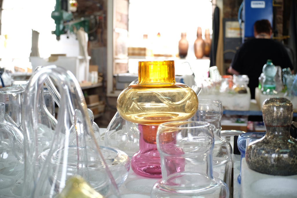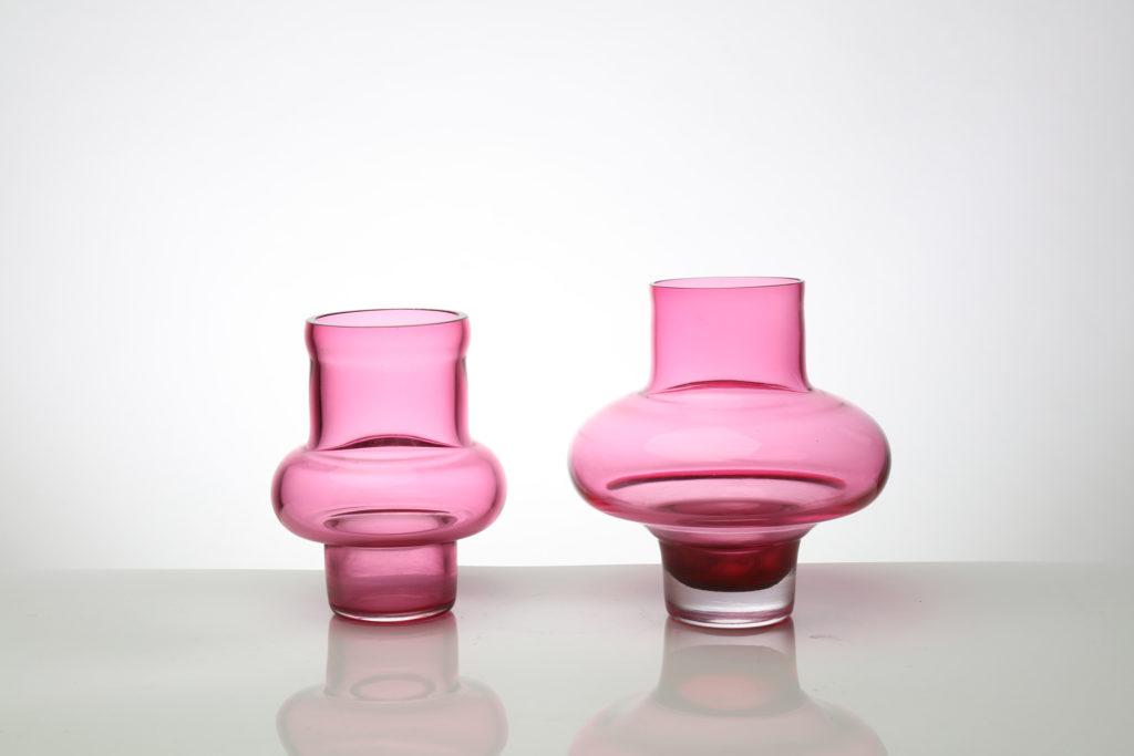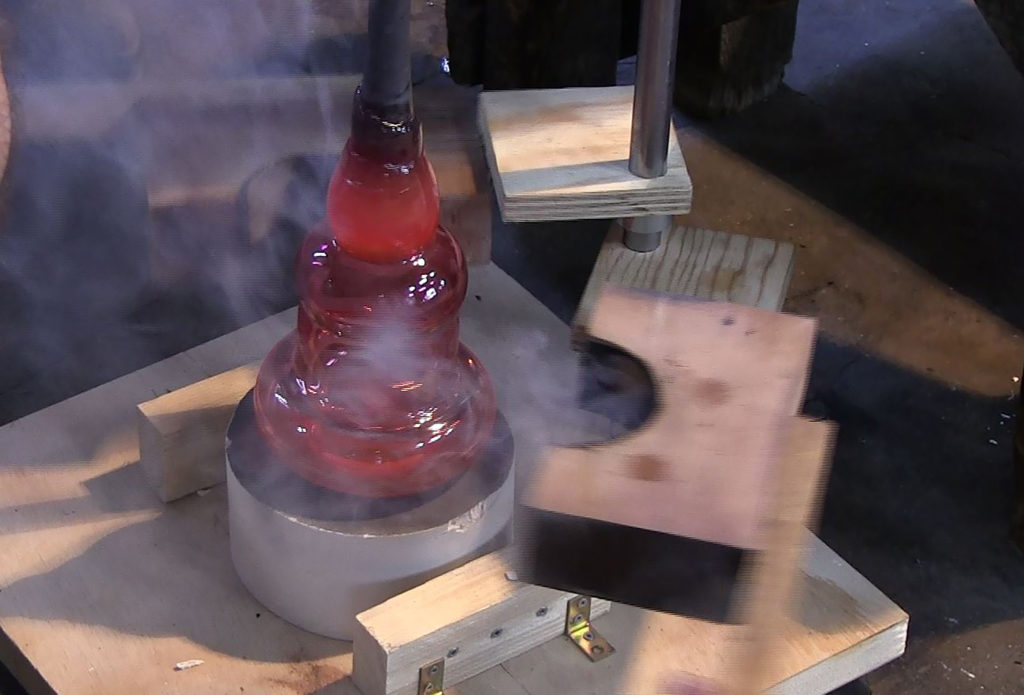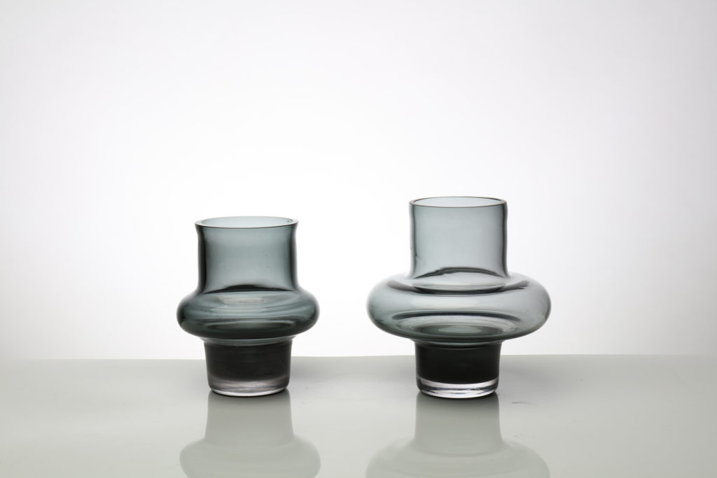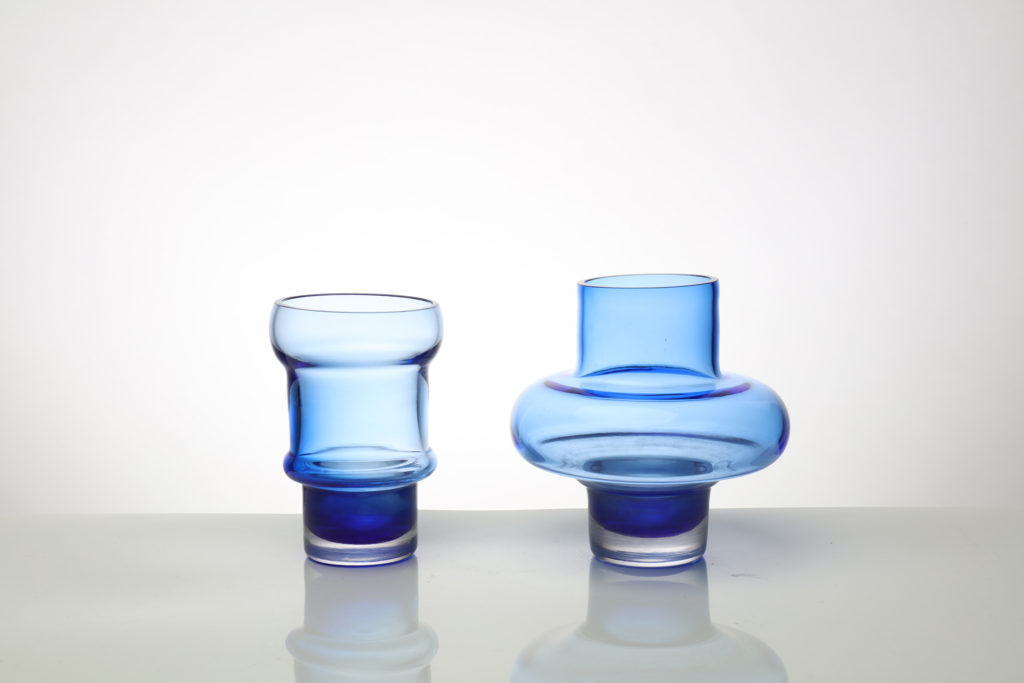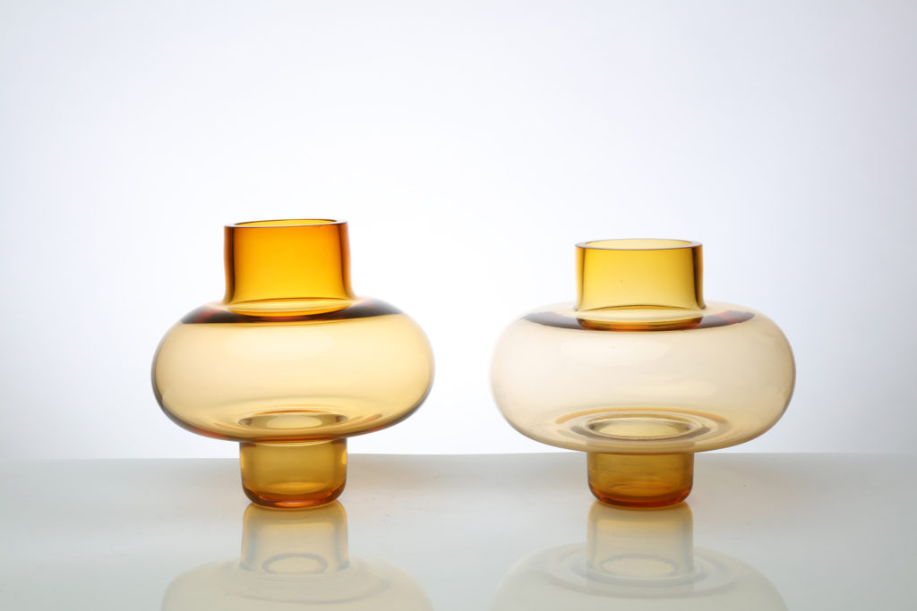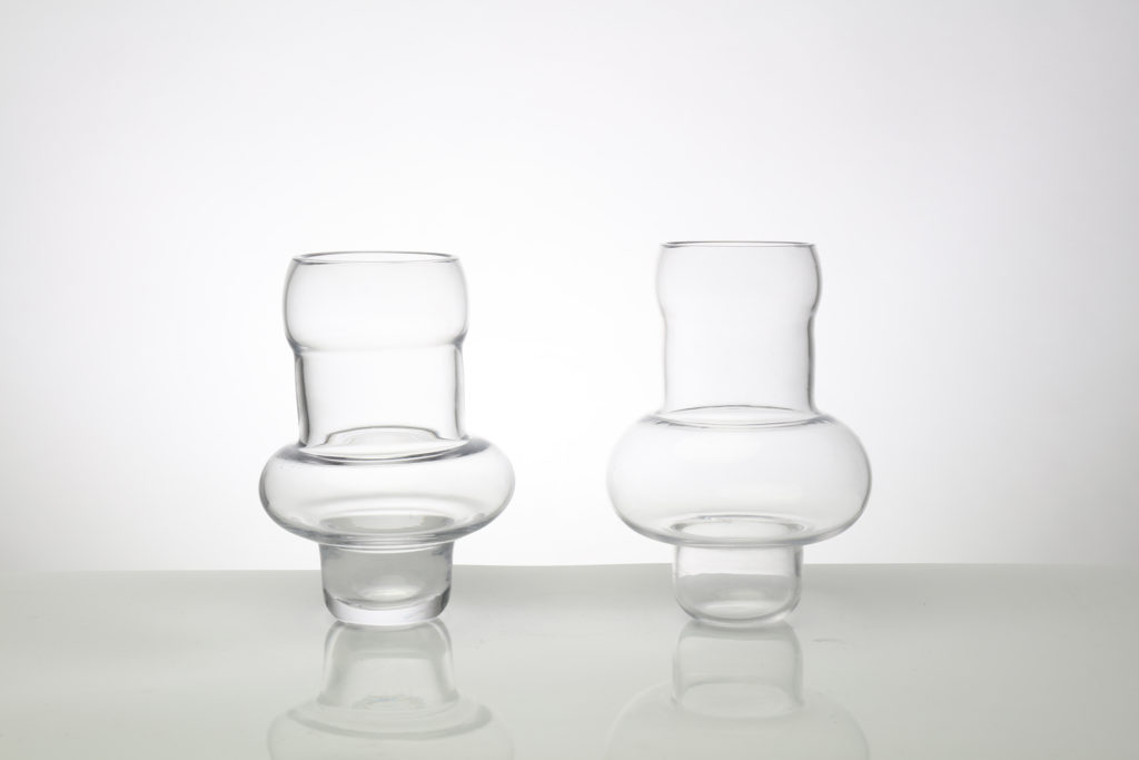 For glassblowing you normally need different moulds to make different vessels. With a height adjustable mould you can get different shapes out of one mould very quickly. Two parts are defined and two parts are unique every time. The defined parts of the vessels are mutually stackable.