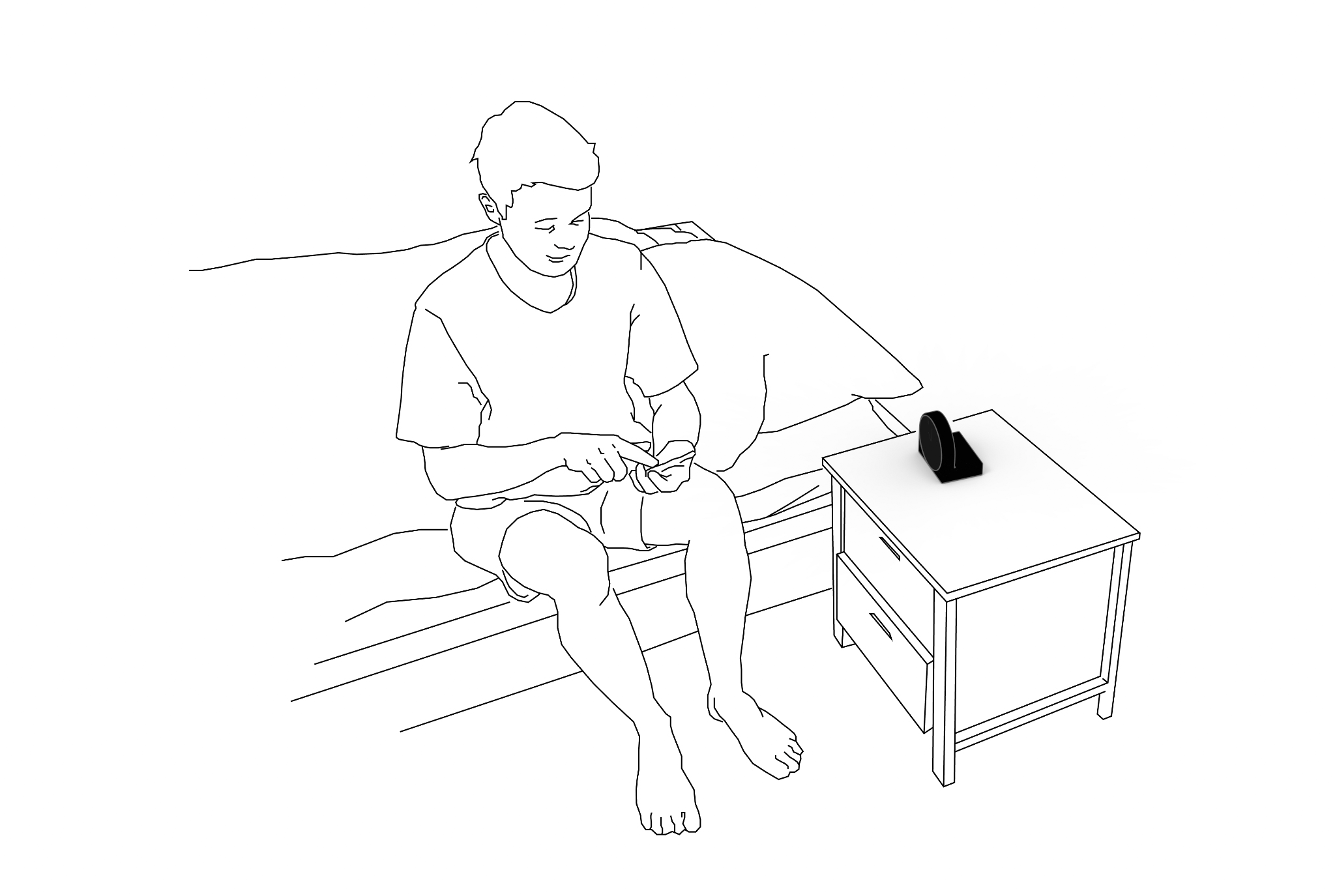 The overuse of our smartphones was how the project begin. This product has in itself every fonction that we need nowadays. We progressively remove all the fonctionnals objects around us that we used to have before getting phones. Everything goes into a smartphone : an alarm clock, a timer, a radio, visuals contents or reading contents, etc. How to then try not to use this device too much without faking that it doesn’t exist ? The time before sleeping was an interesting thing that I work with. That was all the work around it that brings me to this previous reflexions. How to put away a user from his phone before sleeping and thing about our smartphones habits too ? (as chargement during the night or will to let our phones on in the event of an emergency call.) The idea was to have a passive object that turns on only when we sacrifice our phone. The button is the phone ; the user put it away during the time that he uses the other product. Then he can concentrate on one activity.