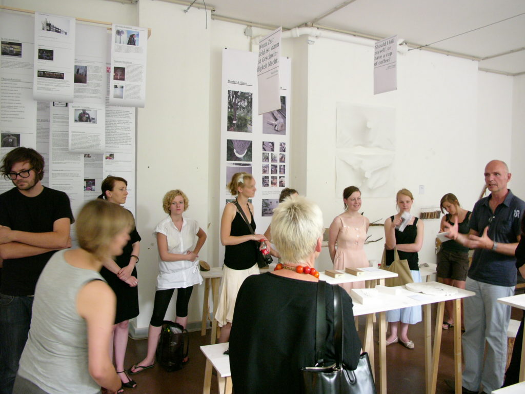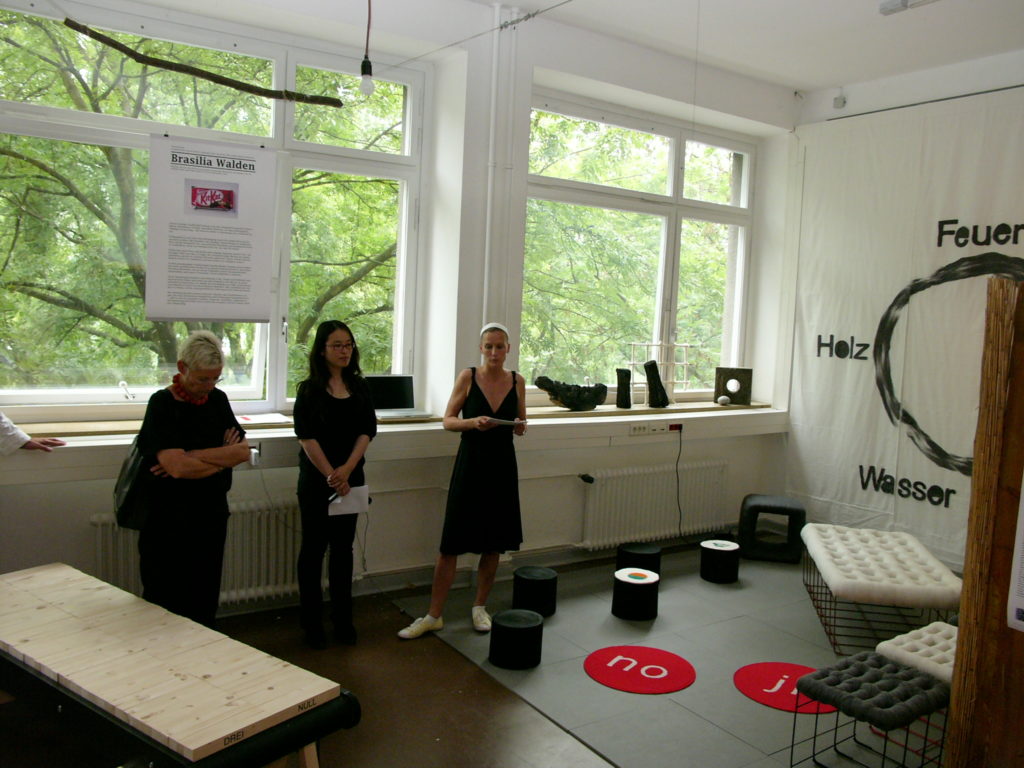 Die in der Ausstellung gezeigten Objekt sind unsere Reaktion auf die zu beginn des Projekts geführte theoretische Auseinandersetzung mit verschiedenen Themenbereichen. Sie schaffen Denkanstöße, werfen Fragen auf oder bieten alternative Sichtweisen auf unsere gewohnte Umgebung. Der Prozess war ein wichtiger Teil unserer Arbeitsweise, in dessen Hinter- grund unsere Ergebnisse eingebettet wurden. Um den Verlauf des Projekts und die Entstehung der Entwürfe Nachzuvollziehen, haben wir in der Ausstellung, auch Auszüge aus unserem Blog sowie Zitate und Arbeitsschritte aufgezeigt. Die Ausstellung zeigt damit eine Momentaufnahmen in einem Prozess der keinesfalls abgeschlossen ist. Vielmehr bildet sie einen Zwischenstand und Startpunkt von welchem ausgehend, jeder einzelne von uns weitergehende Denkweisen und Standpunkte zu Thematiken entwickelt.