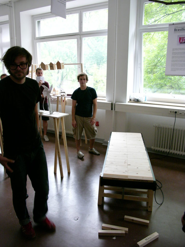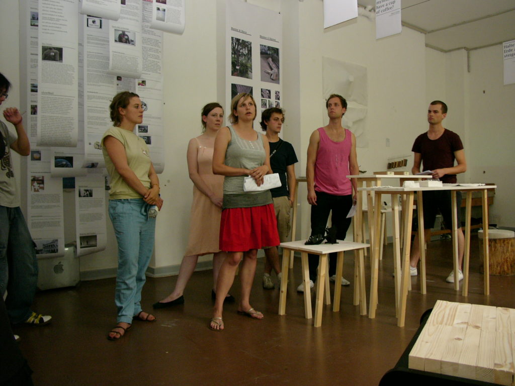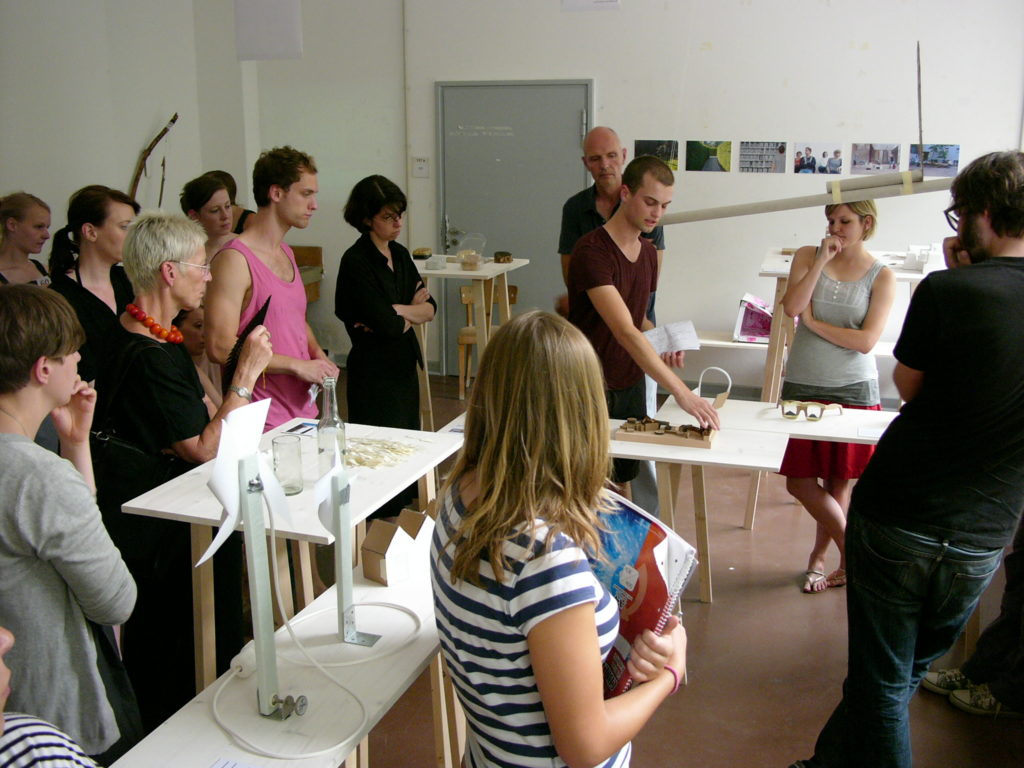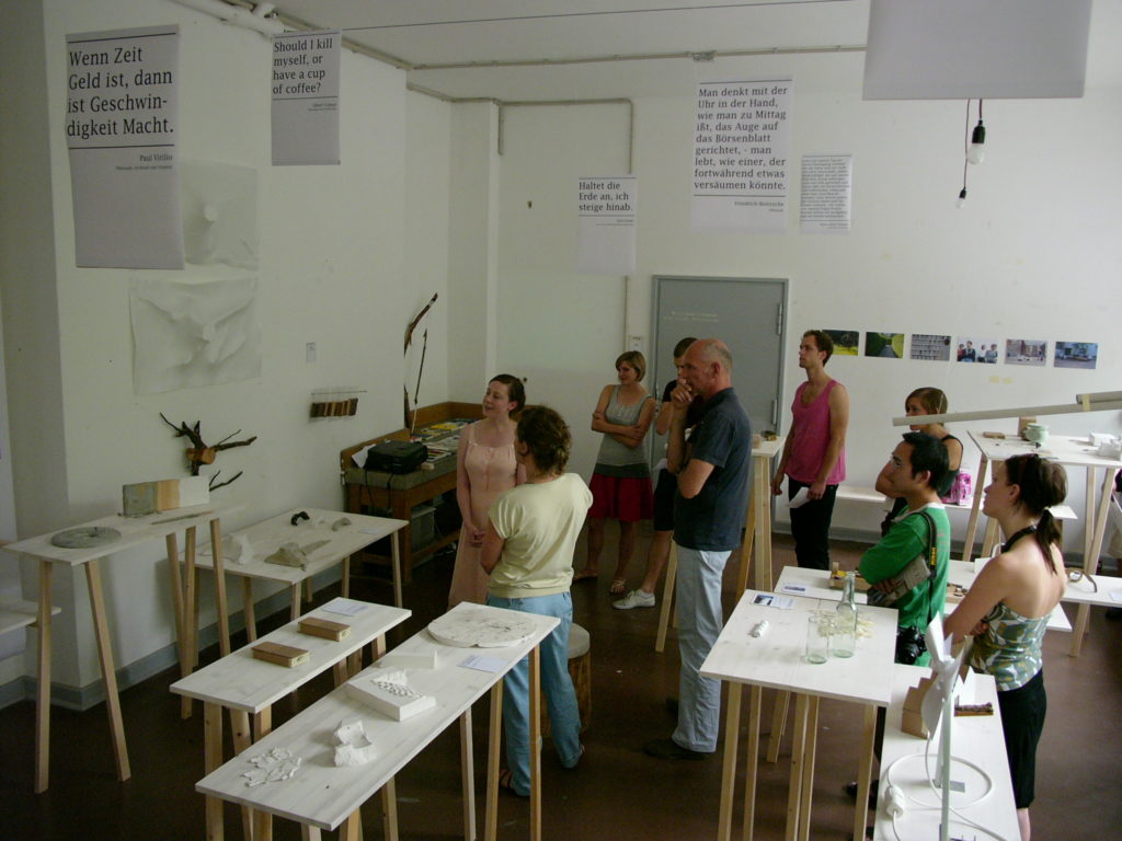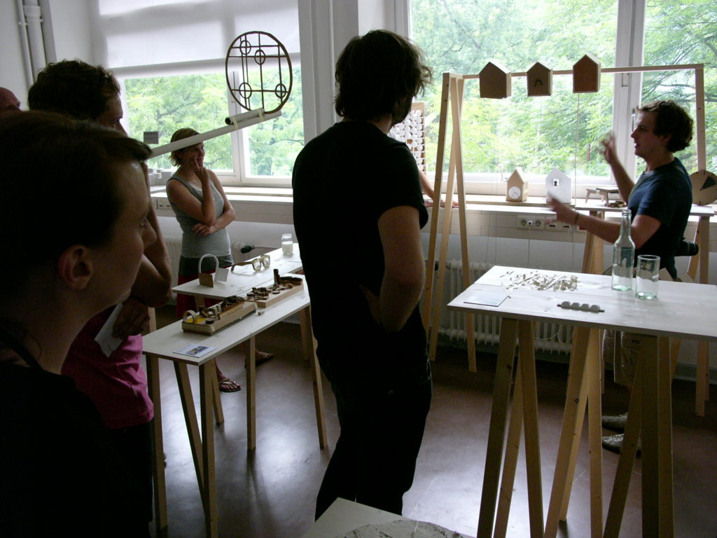 Die Planung und Entstehung der Ausstellung war Teil des Prozesses. Ein Konzept musste entworfen werden und somit die Ergebnisse benannt, eingeteilt und beschrieben werden. Dabei wurde das ein oder andere Objekt nochmals überdacht und neu interpretiert. Auch fand sich die Gruppe wieder zusammen, hatten sich im Laufe der praktischen Auseinandersetzungen kleine Teams, in wechselnden Konstellationen gebil- det. Auch das war überaus fruchtbar, lehrreich und inspirierend. Ein Mitglied hat eine Idee, der nächste setzt sie um und das wiederum bringt jenen auf solche Gedanken.