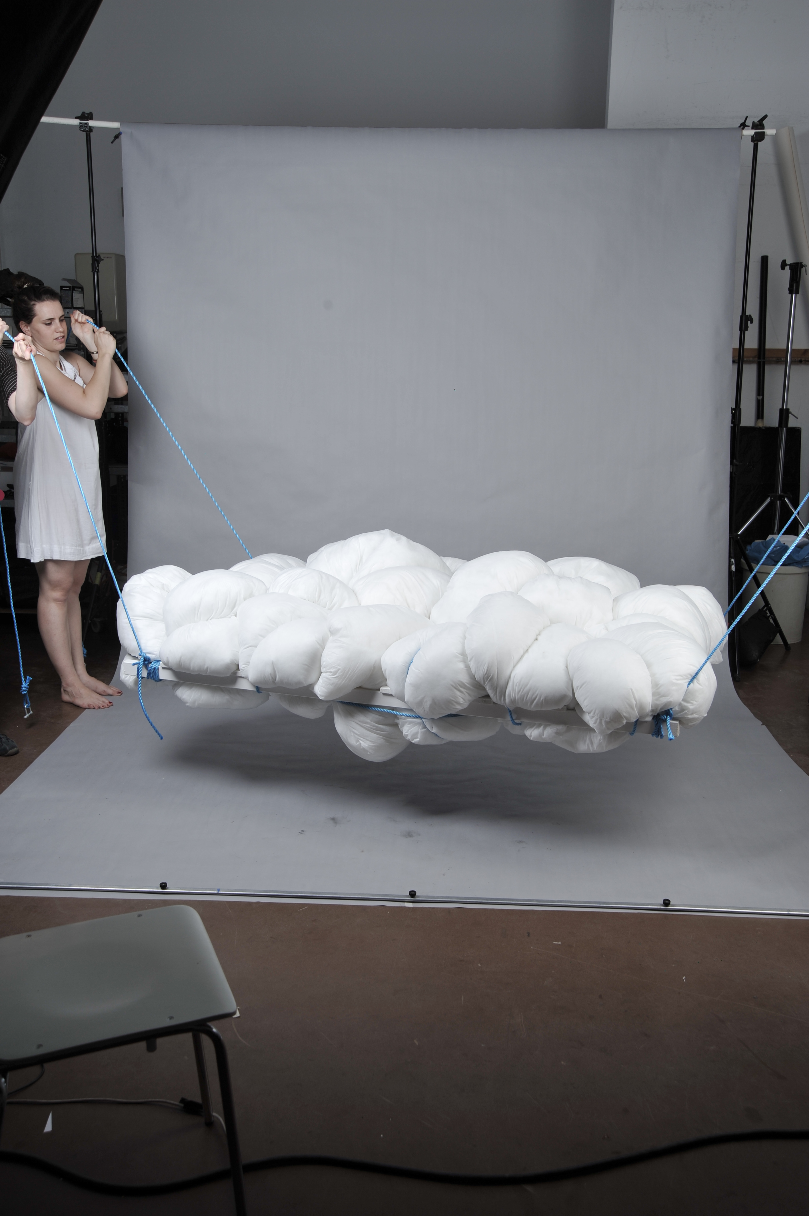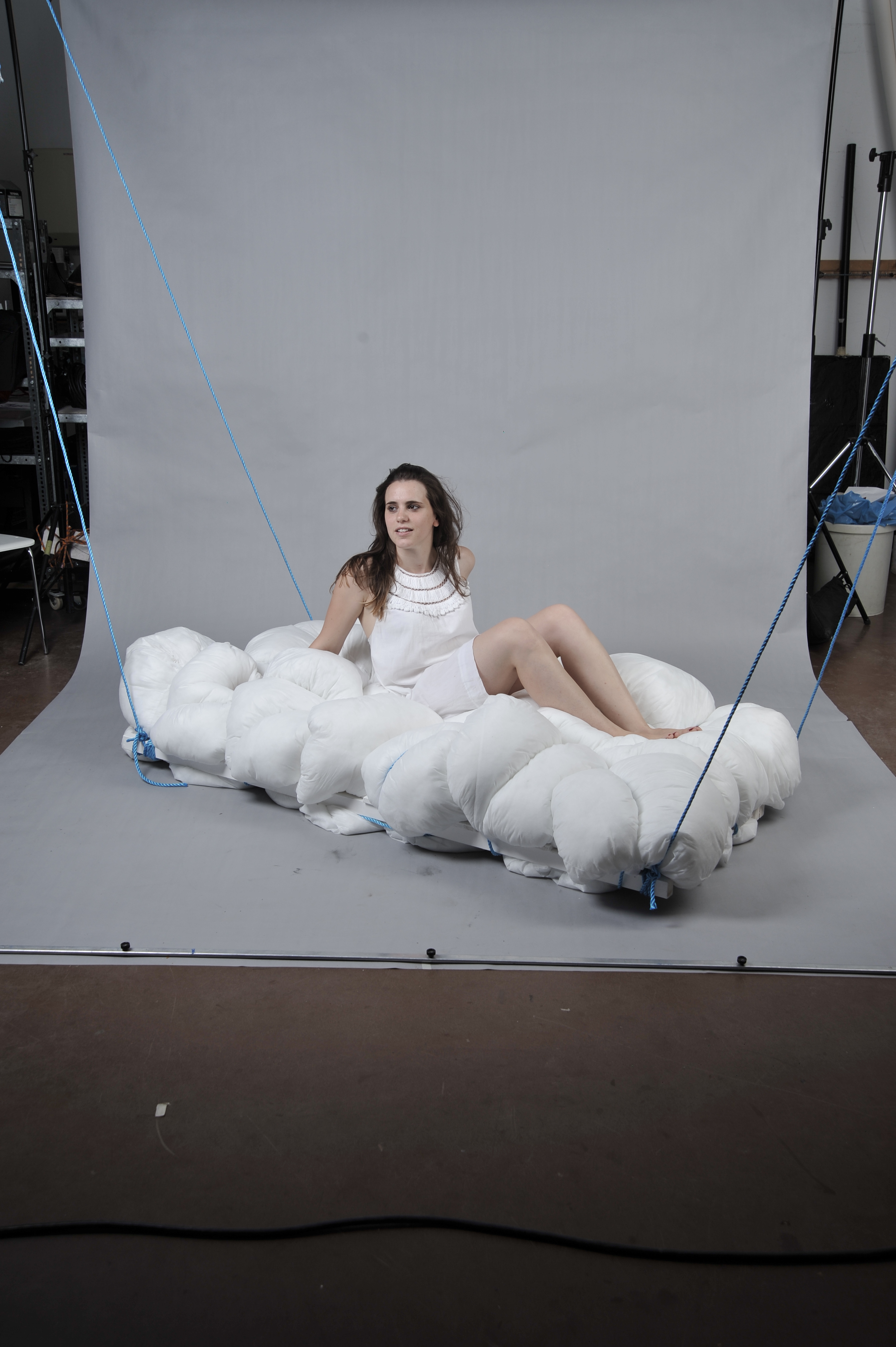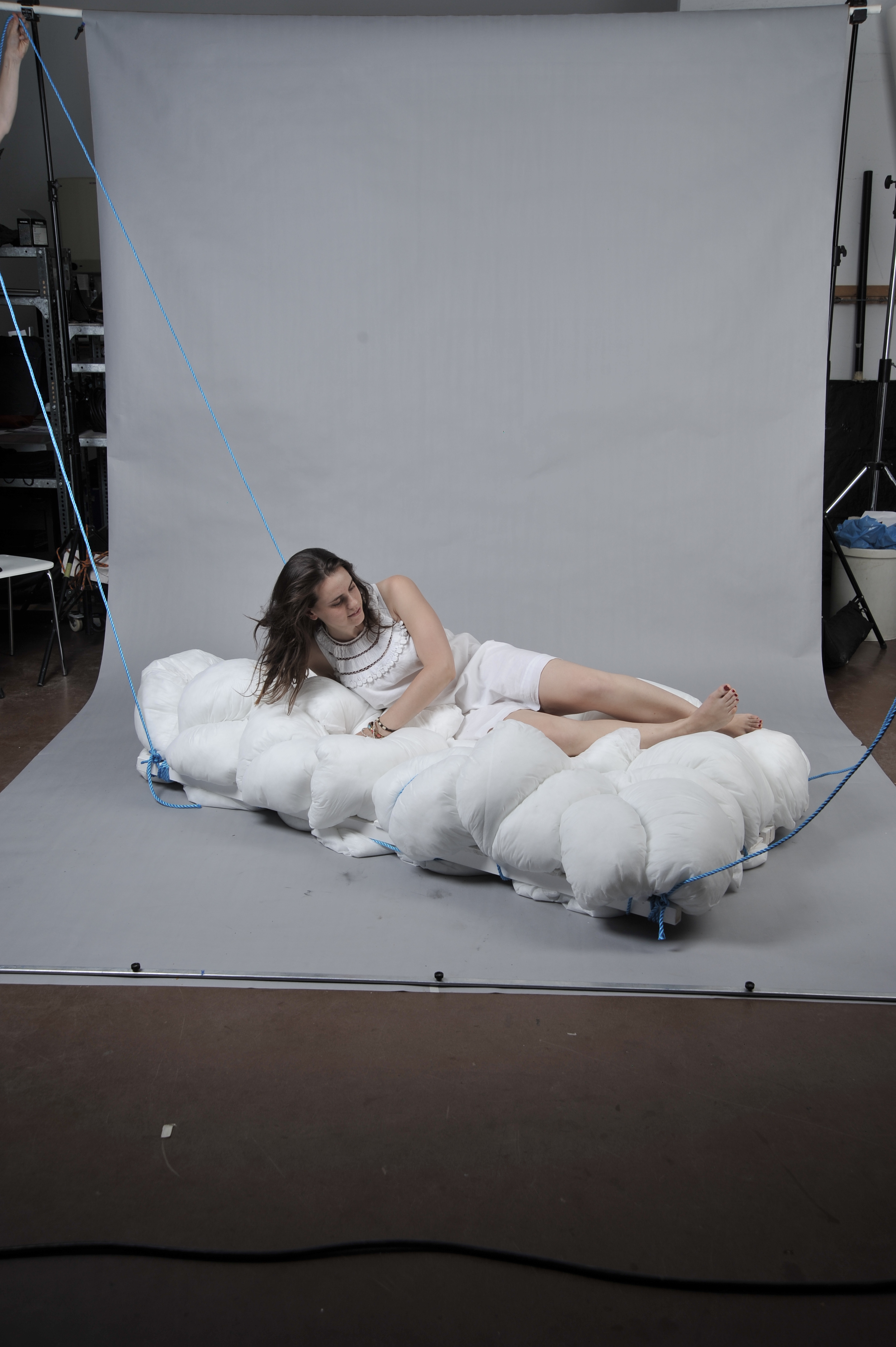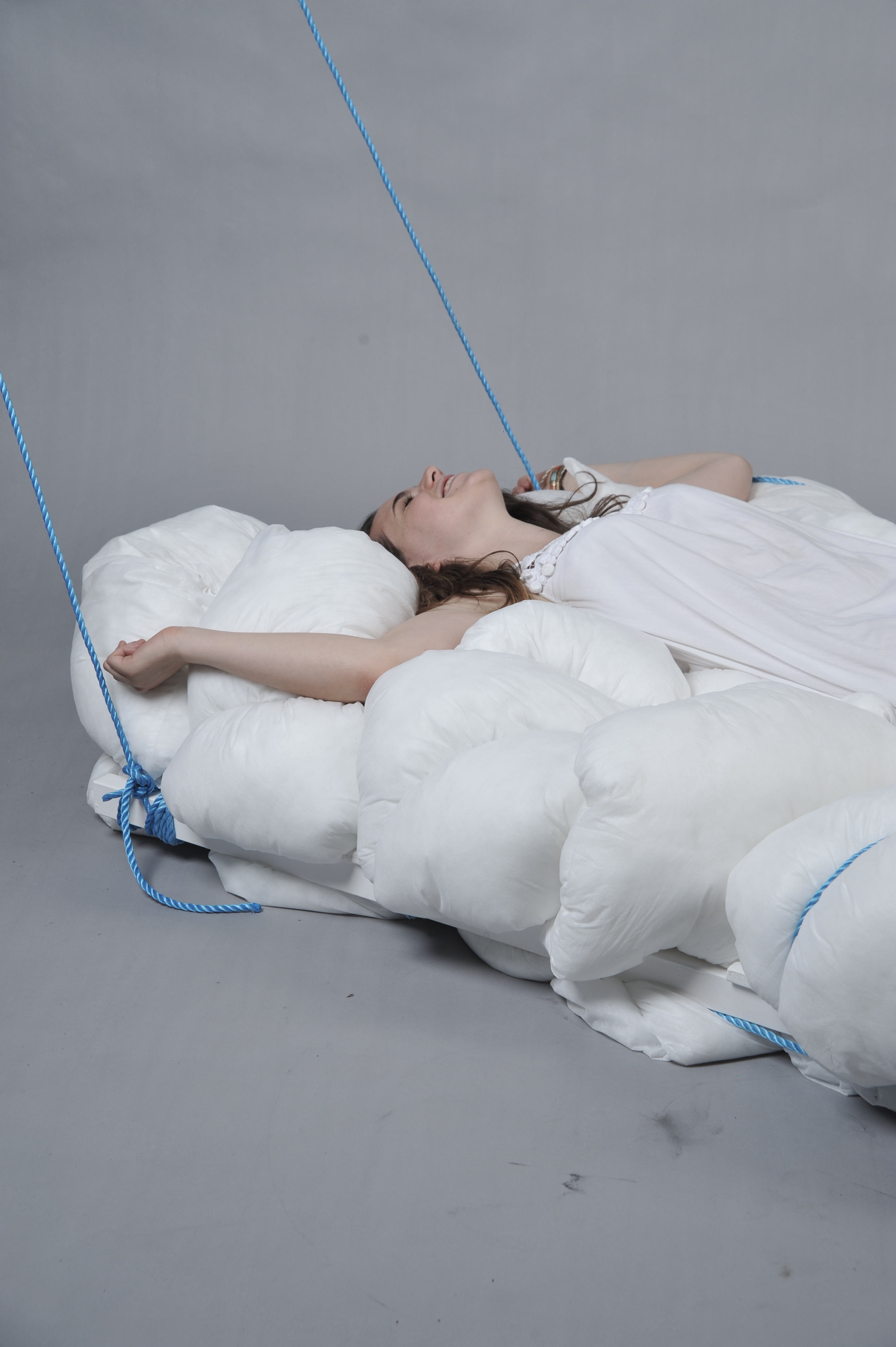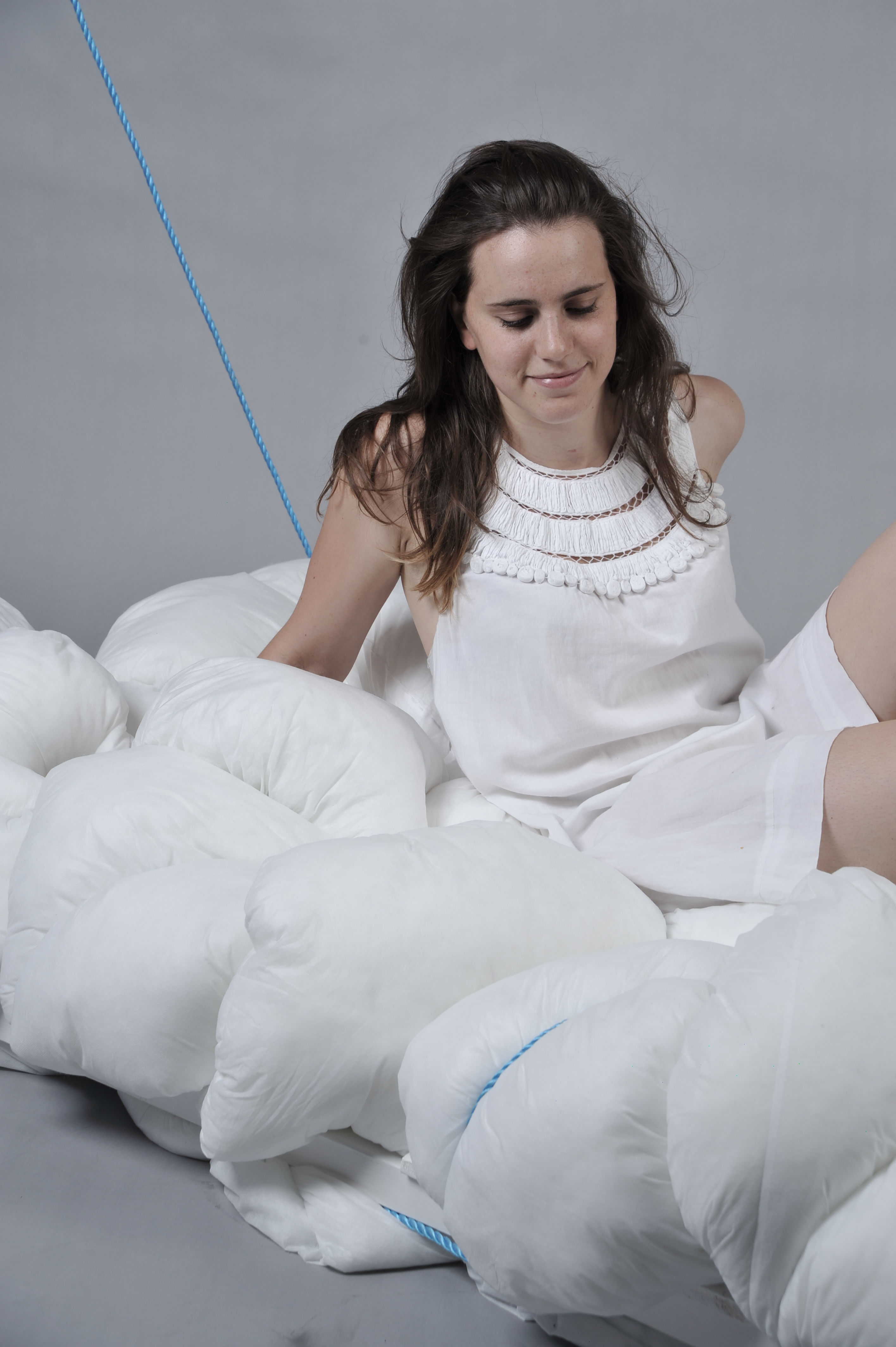 clouding [ von Maria Oggioni ] is when you think about a cloud, is when you think about the sensation to lie down on it, when you feel something fluffy, softy and swinging underneath your- self. –1)Beingonacloud,lightness.Itdoesnotofferaprecise pose, it is not a single position. It is mostlya particular state of being on something. – 2) Thinking in terms of softness and not in terms of formalism regarding the material: white pillows are kept together with one continuing rope only. In this way a clear shape is achieved that directly refers to the concept of the cloud: light, soft and fluffy.