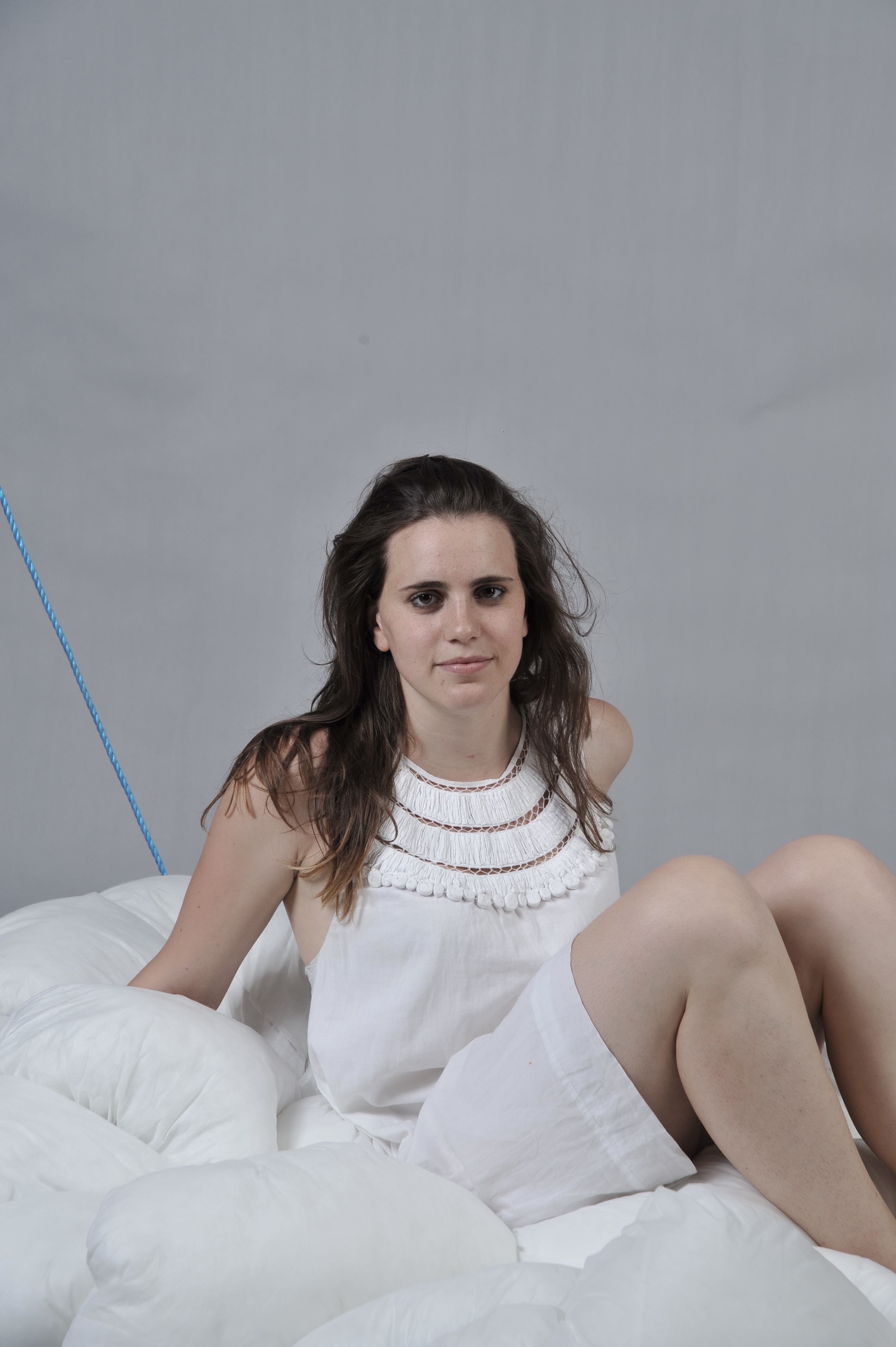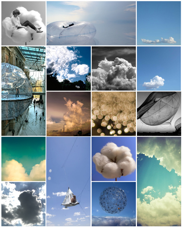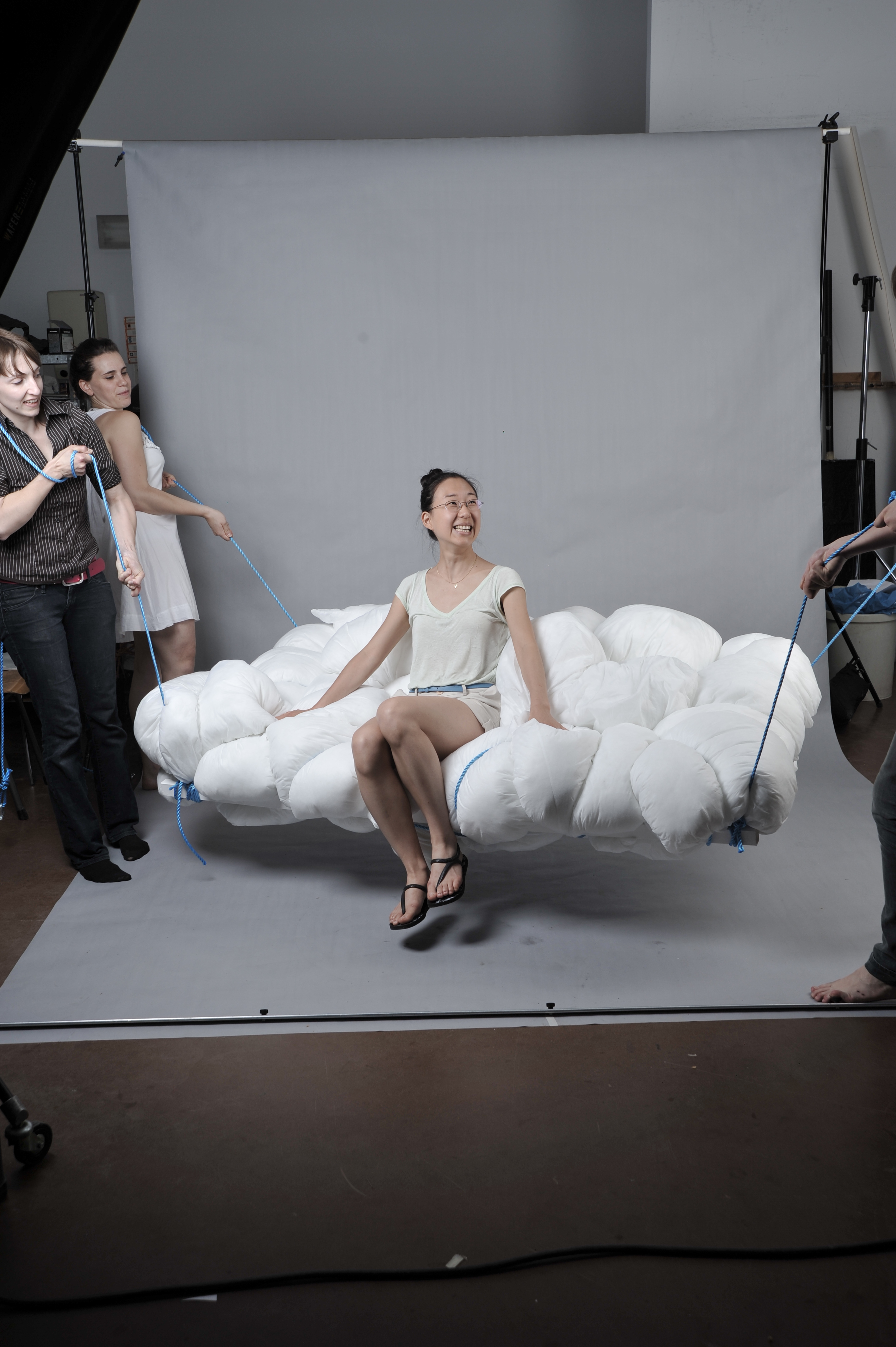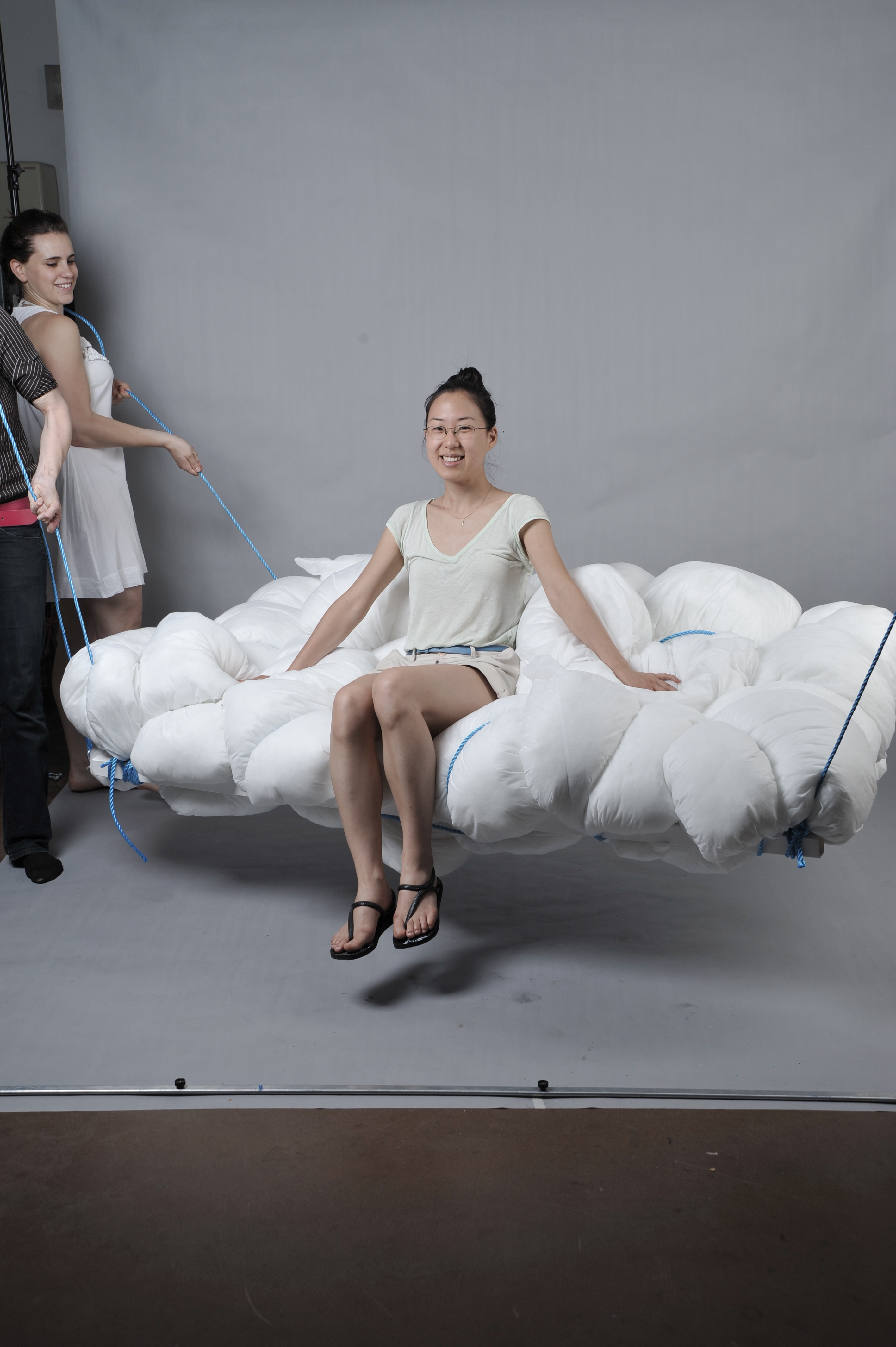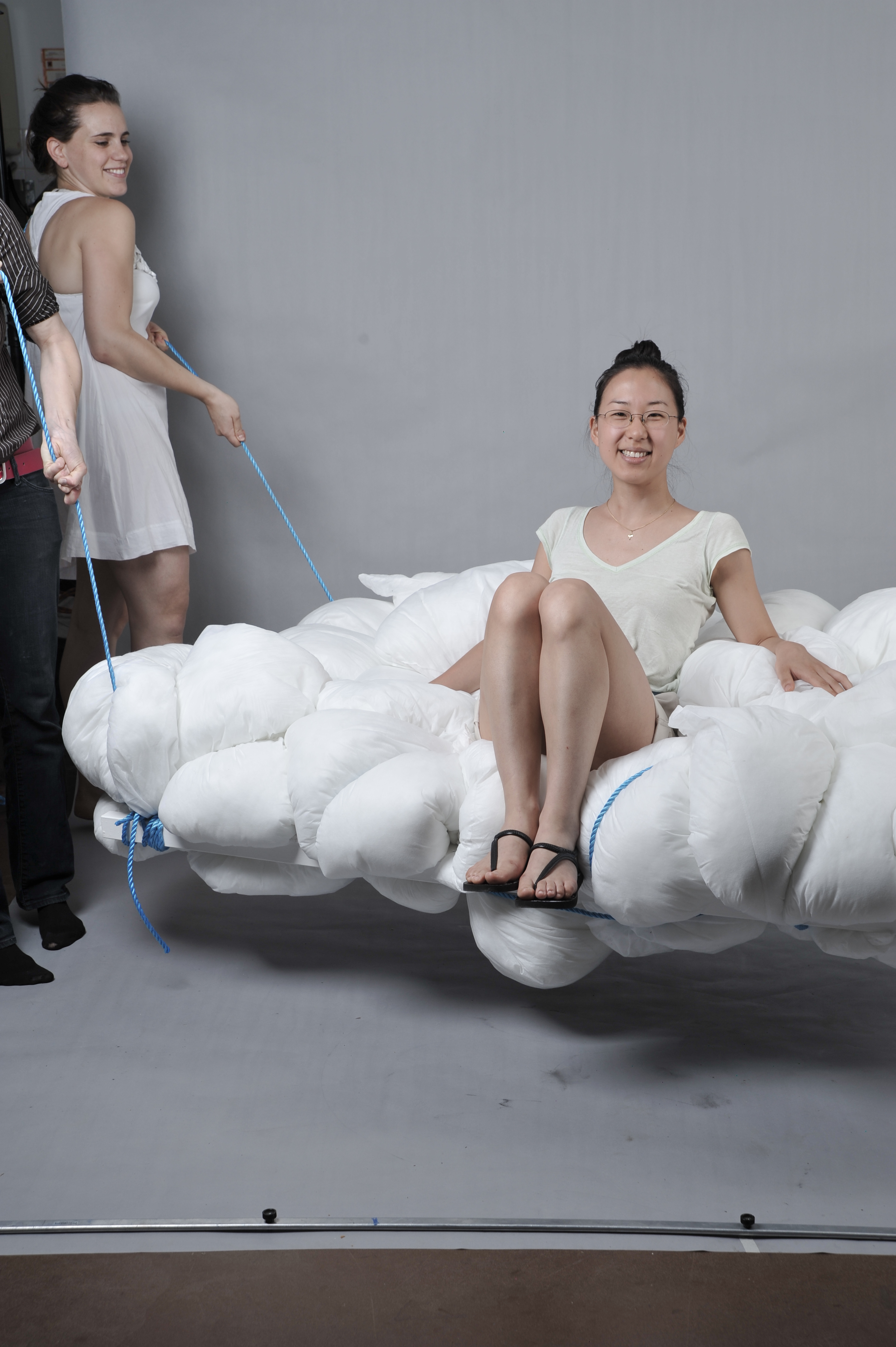 clouding [ von Maria Oggioni ] is when you think about a cloud, is when you think about the sensation to lie down on it, when you feel something fluffy, softy and swinging underneath your- self. –1)Beingonacloud,lightness.Itdoesnotofferaprecise pose, it is not a single position. It is mostlya particular state of being on something. – 2) Thinking in terms of softness and not in terms of formalism regarding the material: white pillows are kept together with one continuing rope only. In this way a clear shape is achieved that directly refers to the concept of the cloud: light, soft and fluffy.