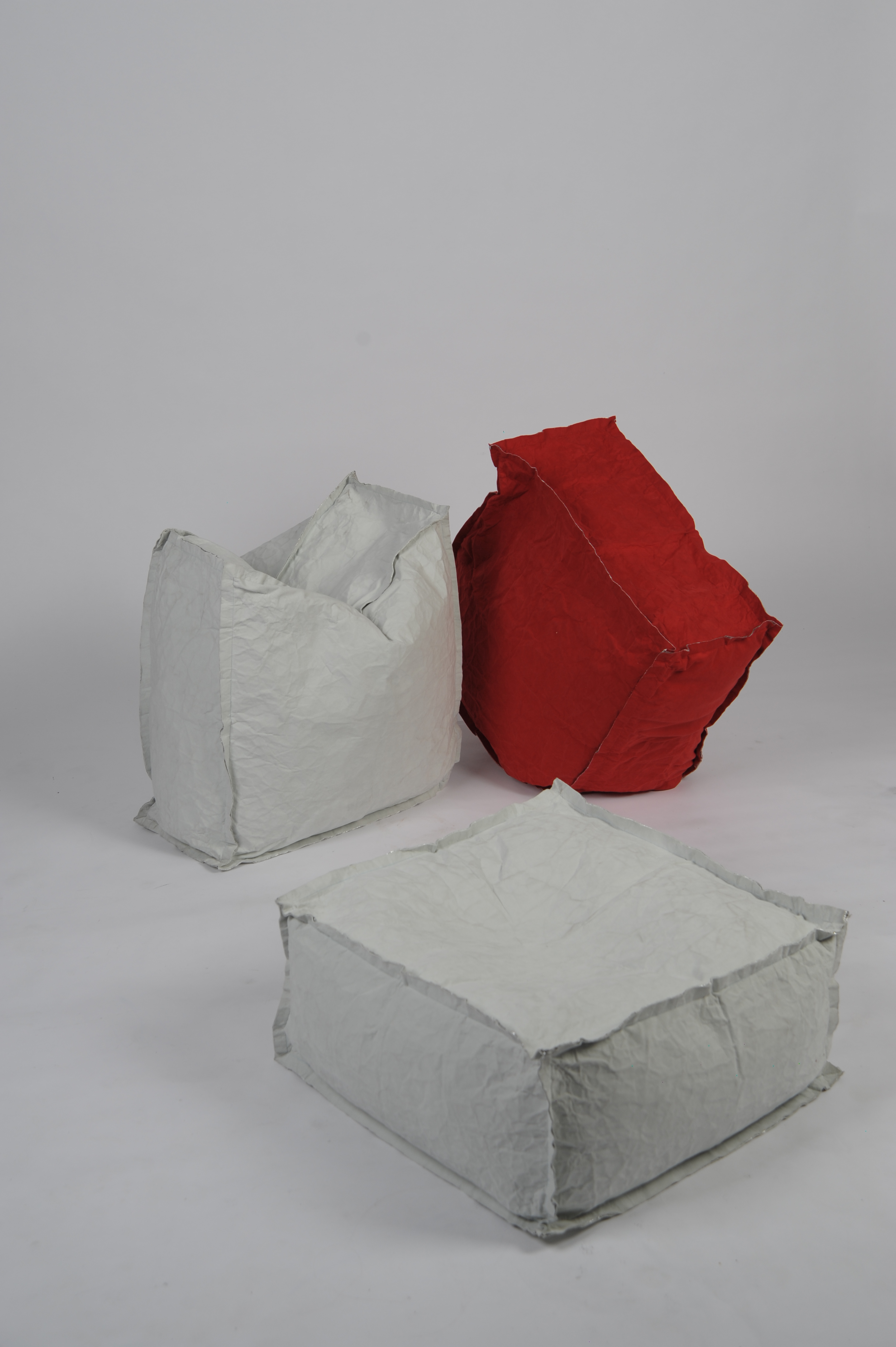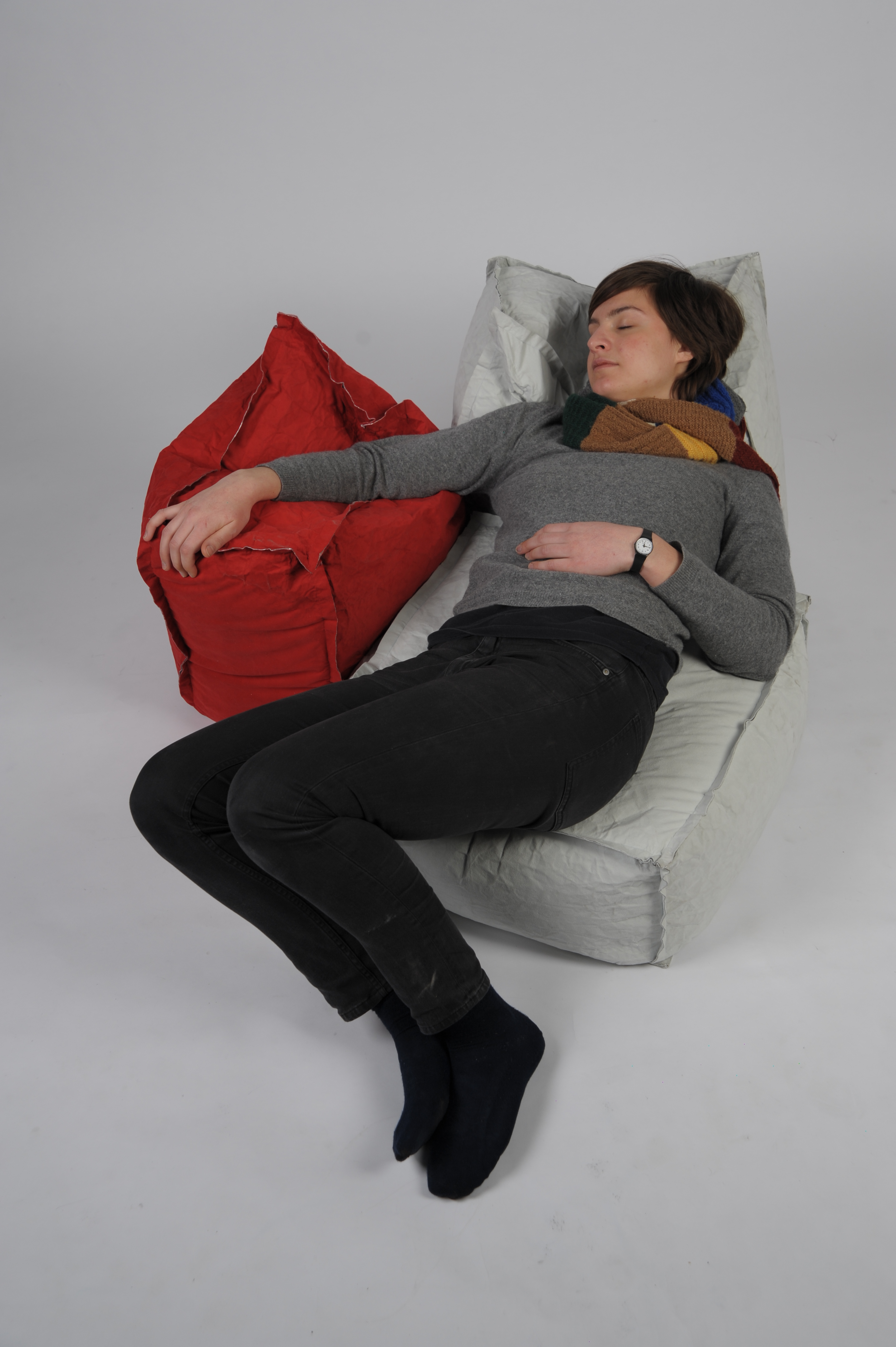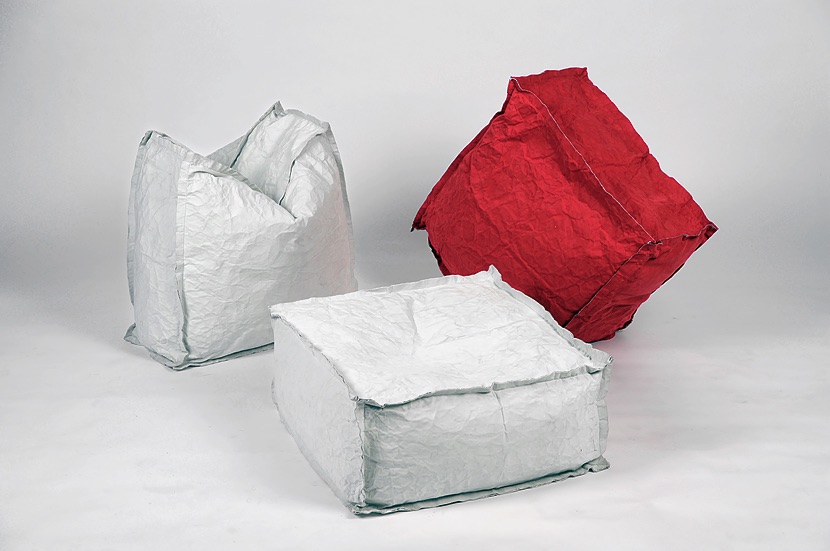 Alcantara® is classically known as a soft material with a plain surface that creates soft edges by folding. It is usually not deformable without heat or other ways of fixing. For the shown product Alcantara® was laminated to metal foil. This turns Alcantara® into a more firm and structured material with crumpled edges that play with light and shadow. When deformed it stays in the desired form and keeps its qualities until it is changed again. That makes every cushion unique.