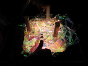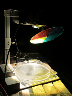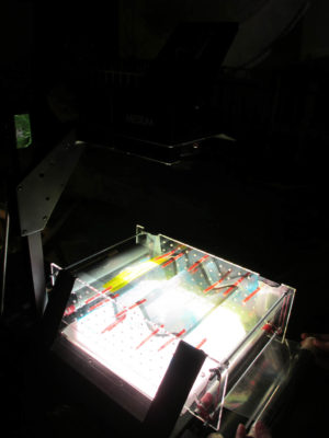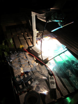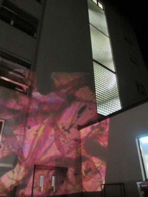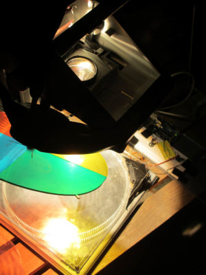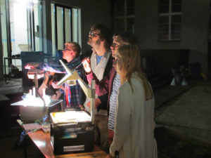 This project is about the creation of participative dynamic motion on buildings without using digital means. For that reason we used overhead projectors that had been hacked in a one week course with student from the industrial design department at the University of the Arts Berlin. The first performance was premiered at the Bauhaus Dessau during the anual light festival happening in end of august. The festivals audience was invited to create own motion graphics on the facade of the Meisterhaus using one or all projectors at the same time. This was big fun on on one hand and also ver educative about colourmixing and grphical grid effects.