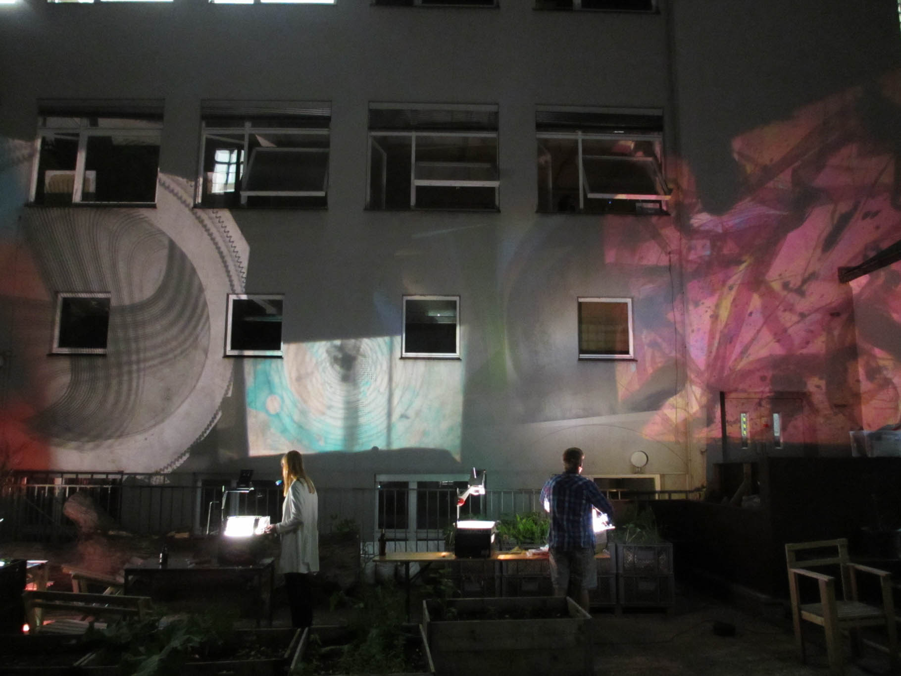 This project is about the creation of participative dynamic motion on buildings without using digital means. For that reason we used overhead projectors that had been hacked in a one week course with student from the industrial design department at the University of the Arts Berlin. The first performance was premiered at the Bauhaus Dessau during the anual light festival happening in end of august. The festivals audience was invited to create own motion graphics on the facade of the Meisterhaus using one or all projectors at the same time. This was big fun on on one hand and also ver educative about colourmixing and grphical grid effects.