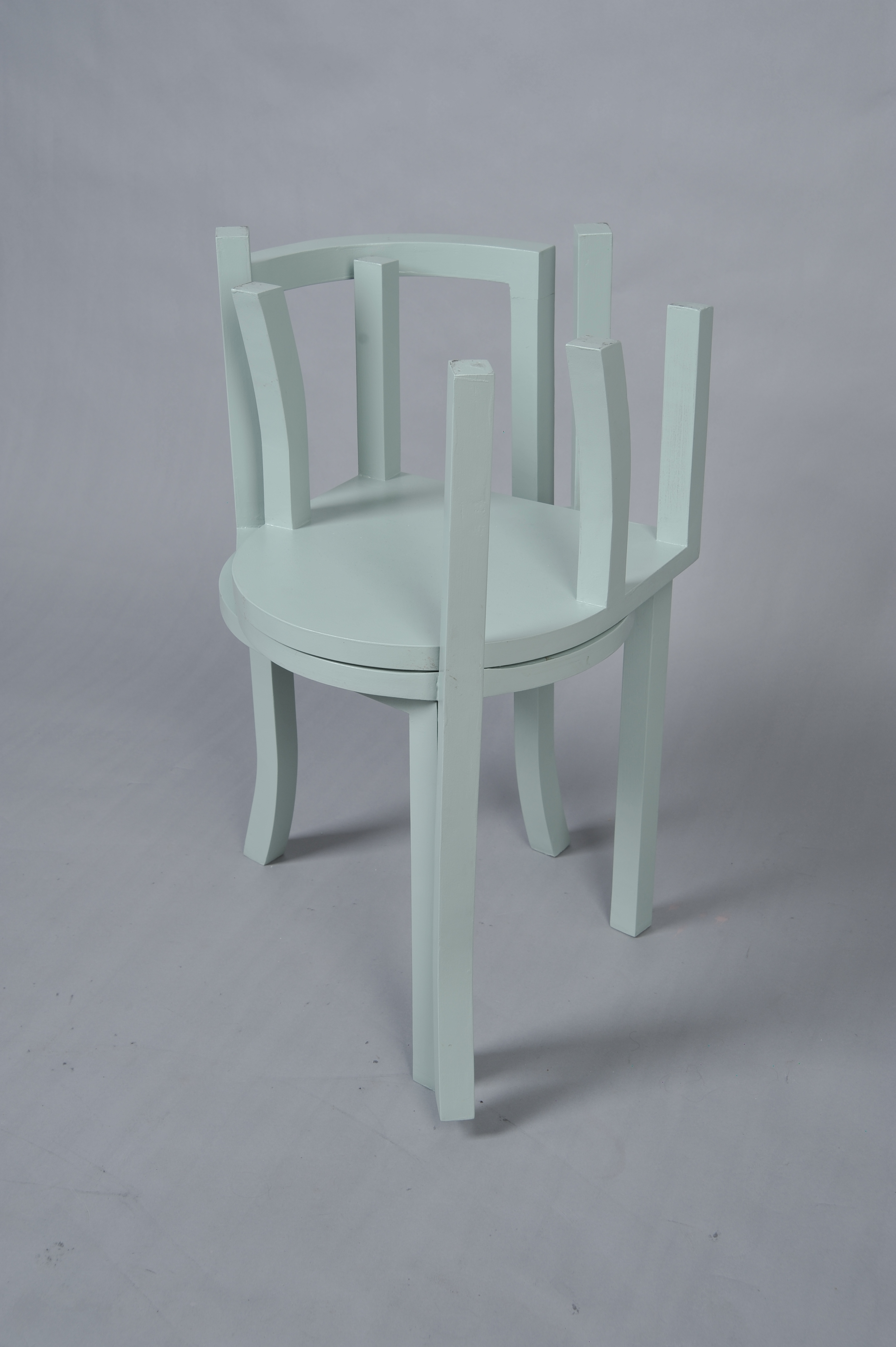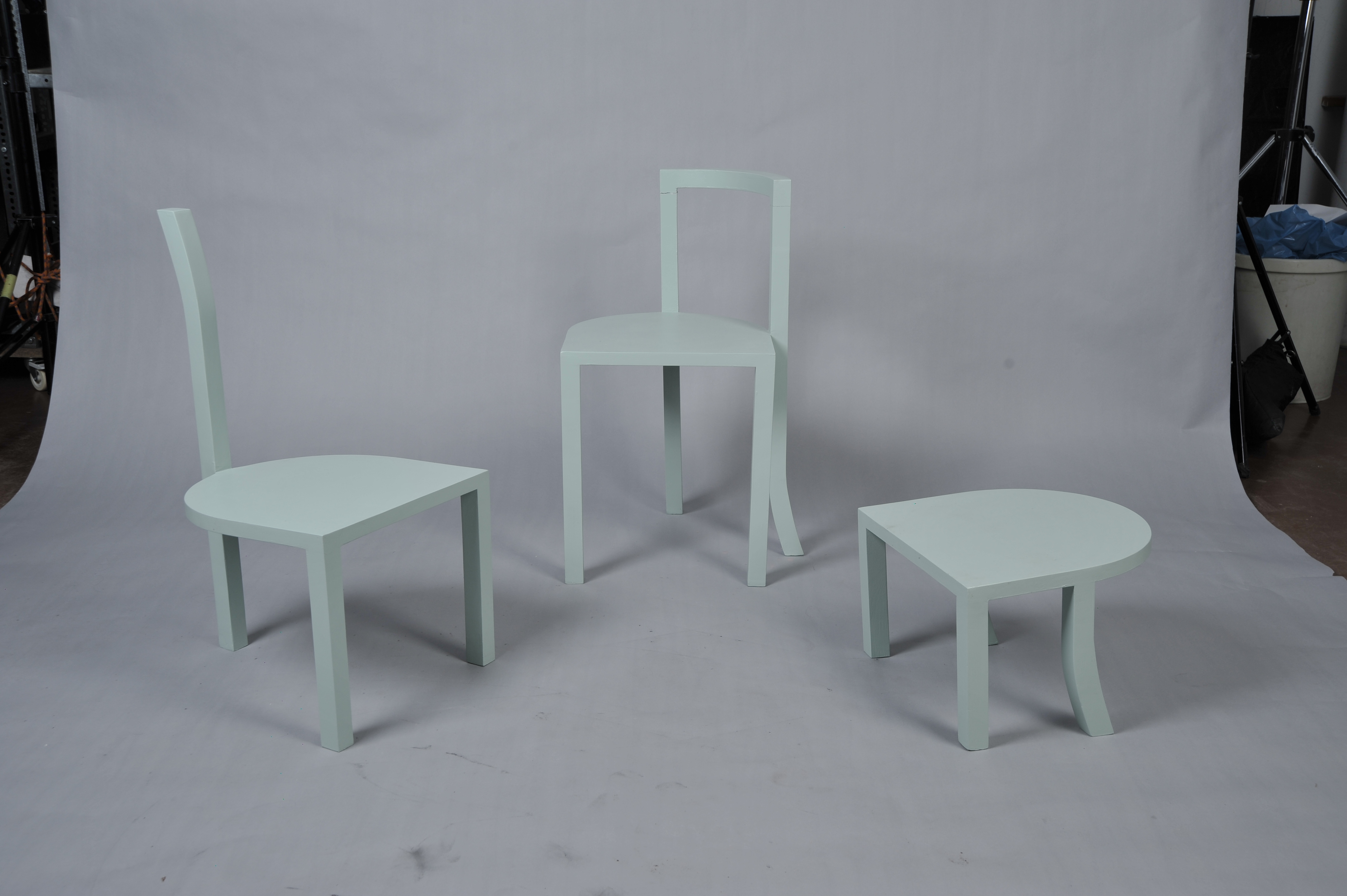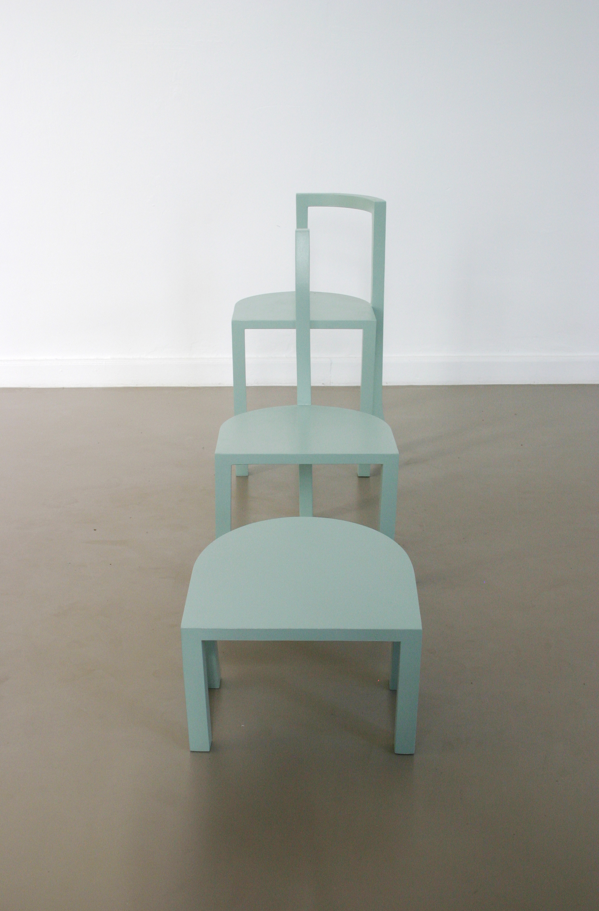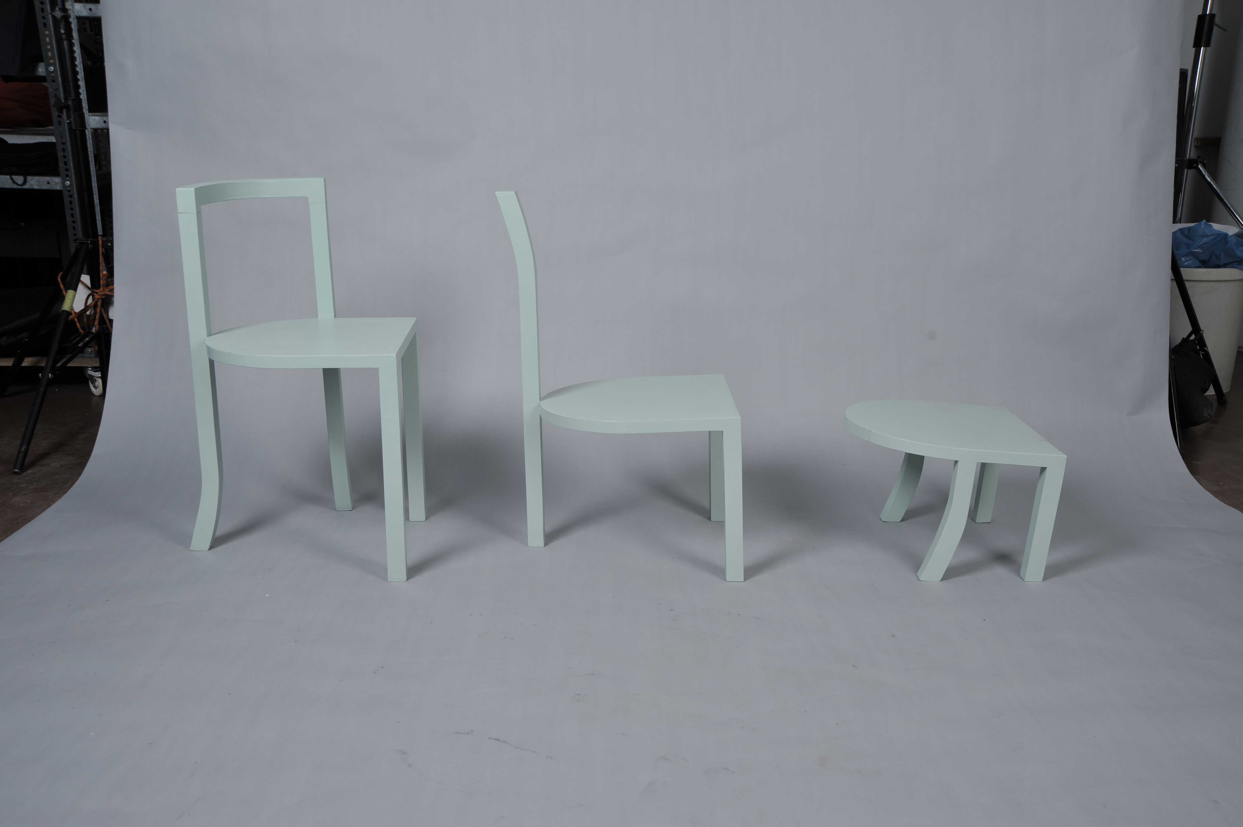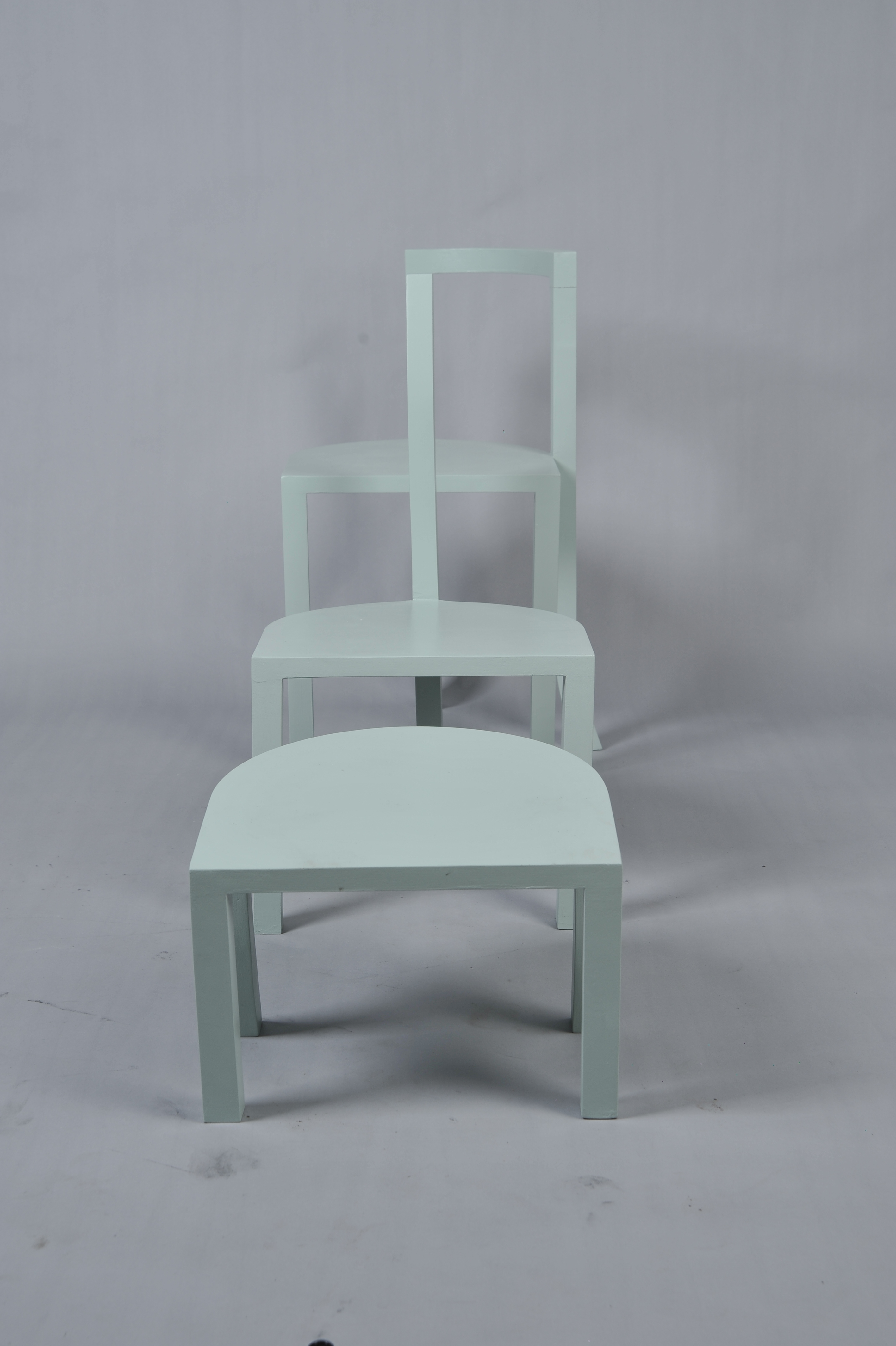 rela•mutieren [ von Stephanie Hornig ] inspiriert von Komple- mentierungen (Abb.I), Rollenspielen (Abb.II) und deren Ver- wandtschaften (Abb. III), die sich durch Deklinationen und Mu- tationen definieren – 1) The quick brown fox jumps a) wie in der Typographie wird der Standard verändert (Abb.IX, Abb.X) um neue Stile, Funktionen und Positionen zu erkundschaften b) die Hauptmerkmale des Ausgangspunktes (hier: der Frankfurter Stuhl, Abb.VIII) werden dekliniert; dadurch entsteht ein neuer Charakter – 2) die durch Modifizierung und Vererbung erstellte Beziehung kann zu unterschiedlichen Erscheinungbildern der gesamten Gruppe führen a) Komplementierung (Abb.IV) b) Har- monie (Abb.VI) b) Konversation (Abb.VII) – 3) das Verhalten und die Beziehung der Gruppenmitglieder zueinander wird über das Gesamtbild (siehe 2.) in individuelle Rollen und Sitzpositionen umgewandelt – 4) die hier angedeuteten Positionen verspielt, weise und neuigierig (Abb.V) können weiter dekliniert, mutiert, vererbt und definiert werden.