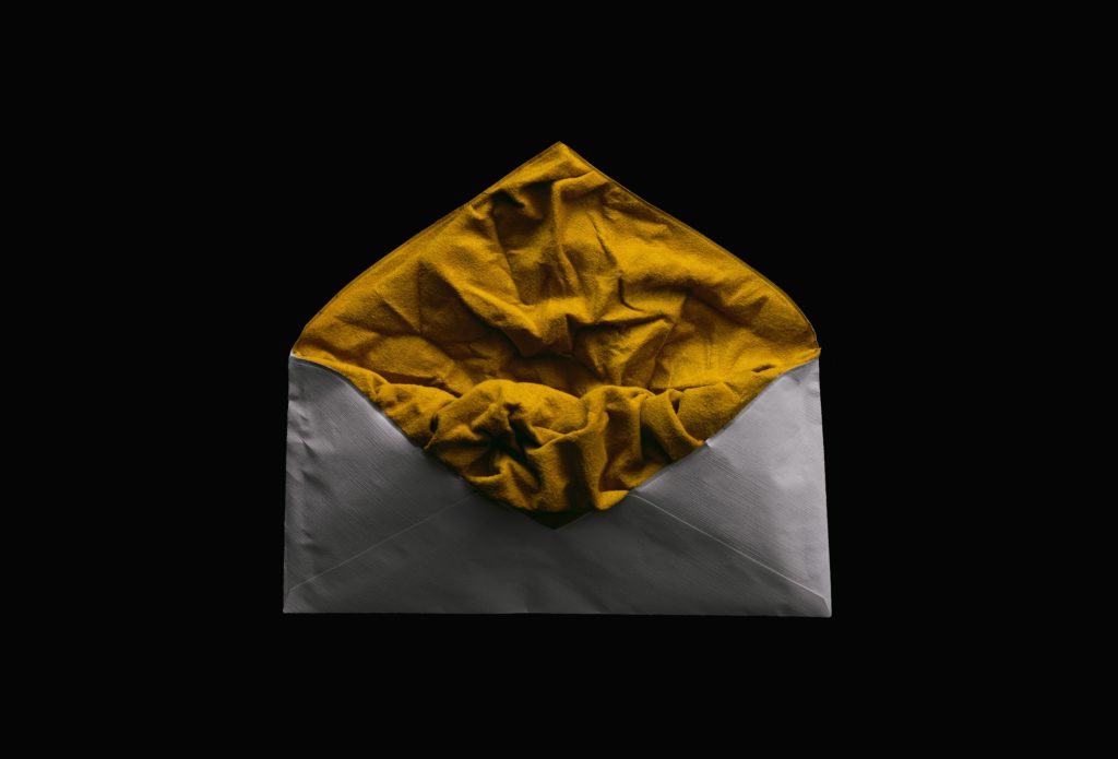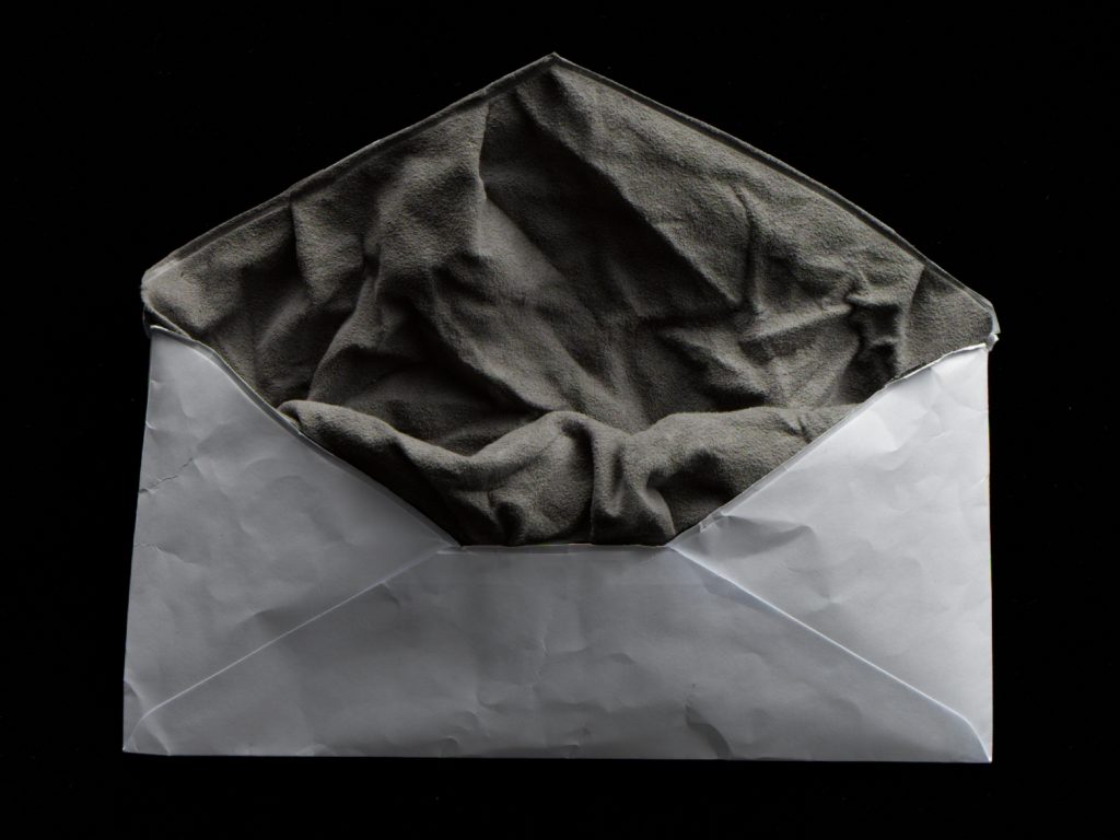 A typical paper envelope is padded with Alcantara®. In the moment of opening an abundance of creased Alcantara® unfolds. The soft material is steamed and dried while being