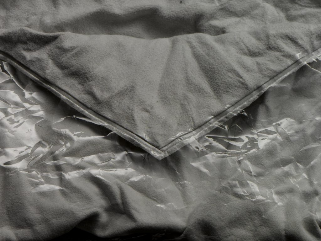 crumbled in order to magnify the arrangements of folds in the final product. No additive material is used to fix the connection. An ultrasonic welding machine is used to melt Alcantara® into the porosities of the paper envelope. The unique composition of