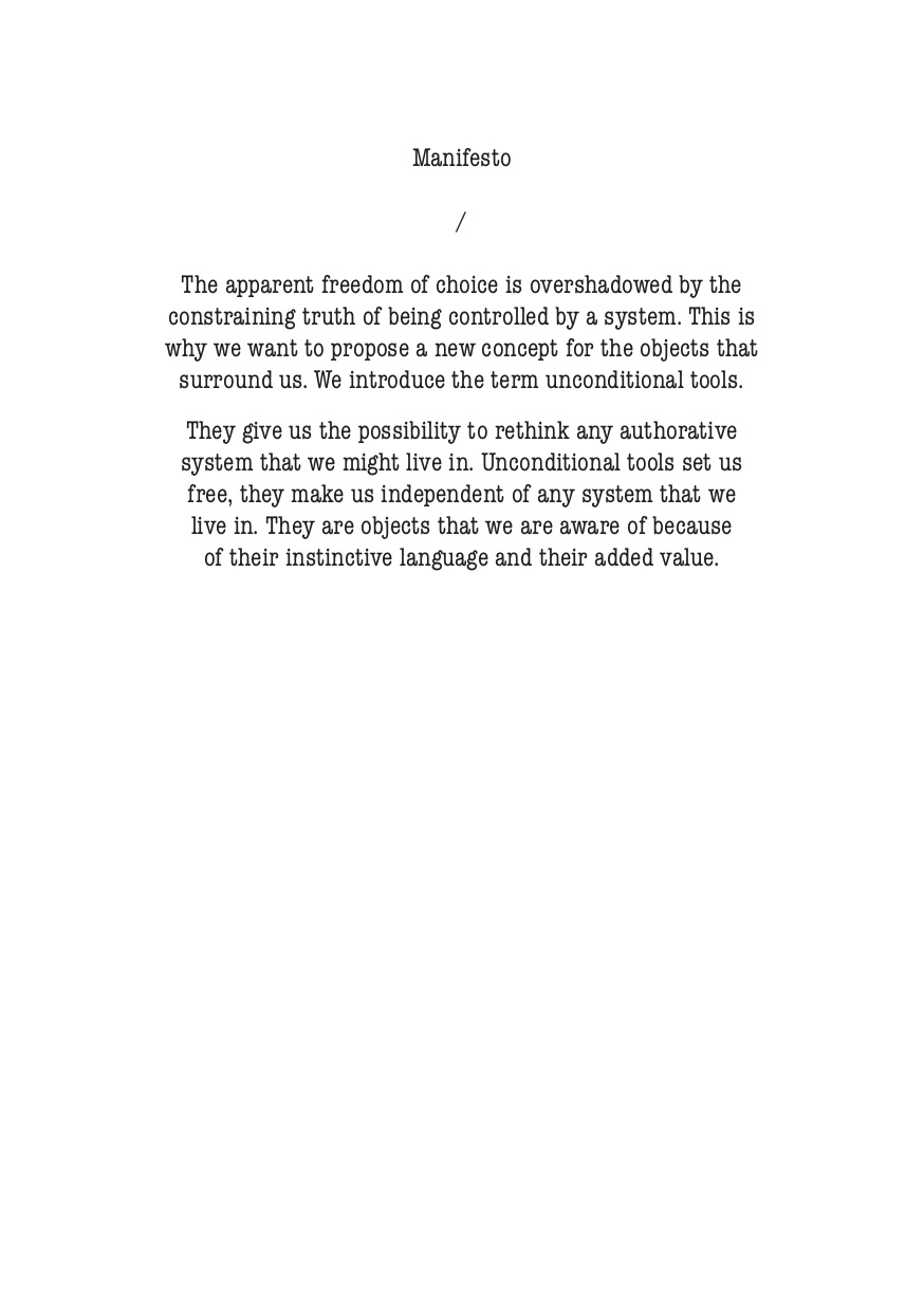 The apparent freedom of choice is overshadowed by the constraining truth of being controlled by a system. This is why we want to propose a new concept for the objects that surround us. We introduce the term unconditional tools.