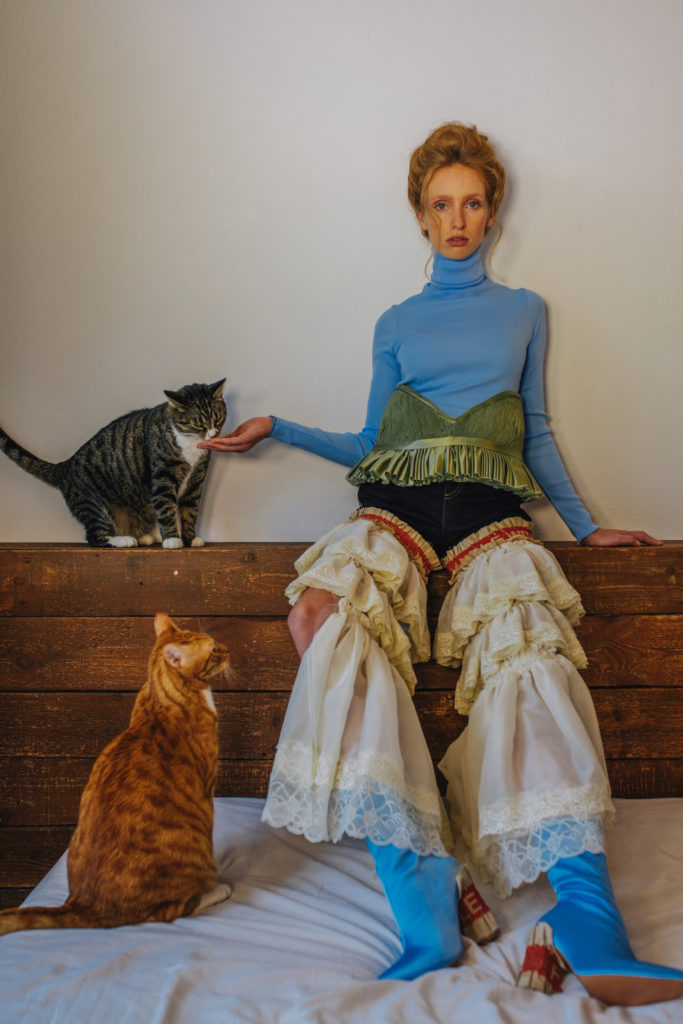 FRAGILE HANDLE WITH CARE tells a story of rich, hysterical women from the 19th century. The collection combines clothing for people with and without disabilities, Victorian fashion and a snappy petting zoo.