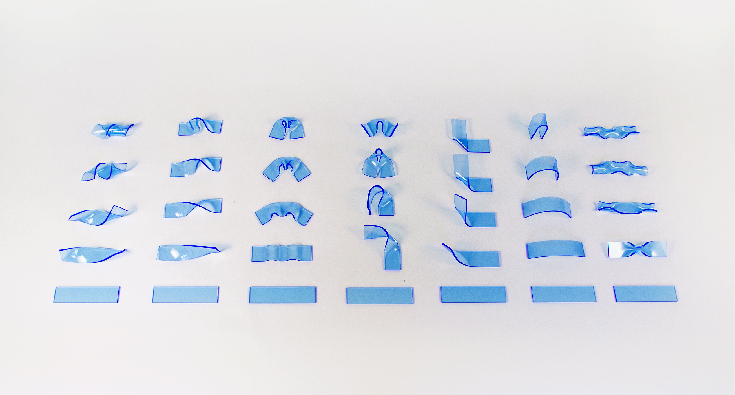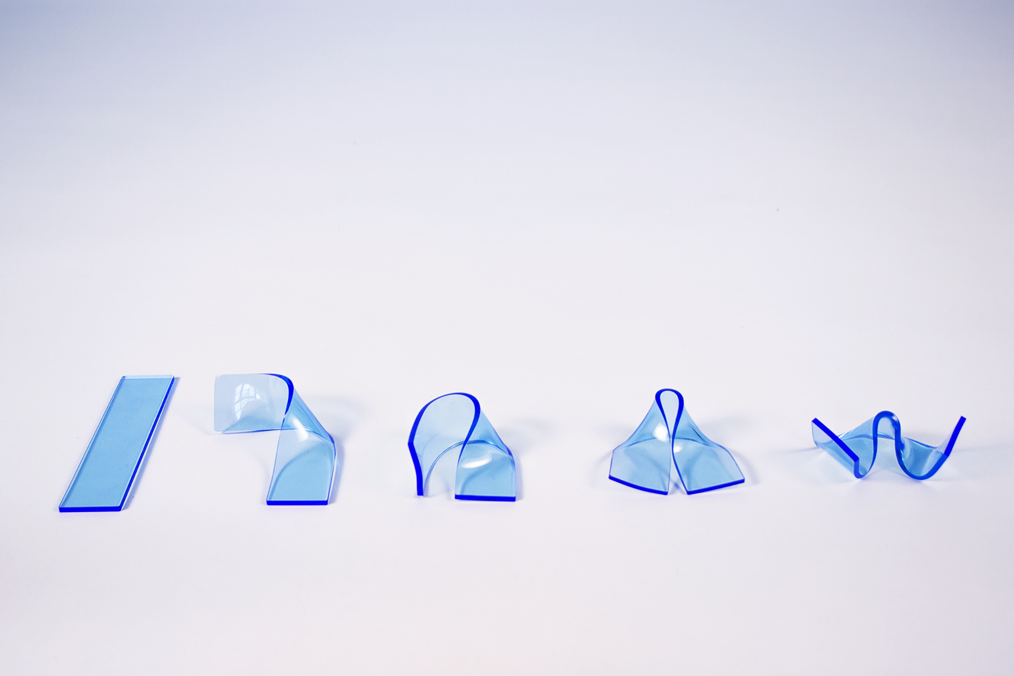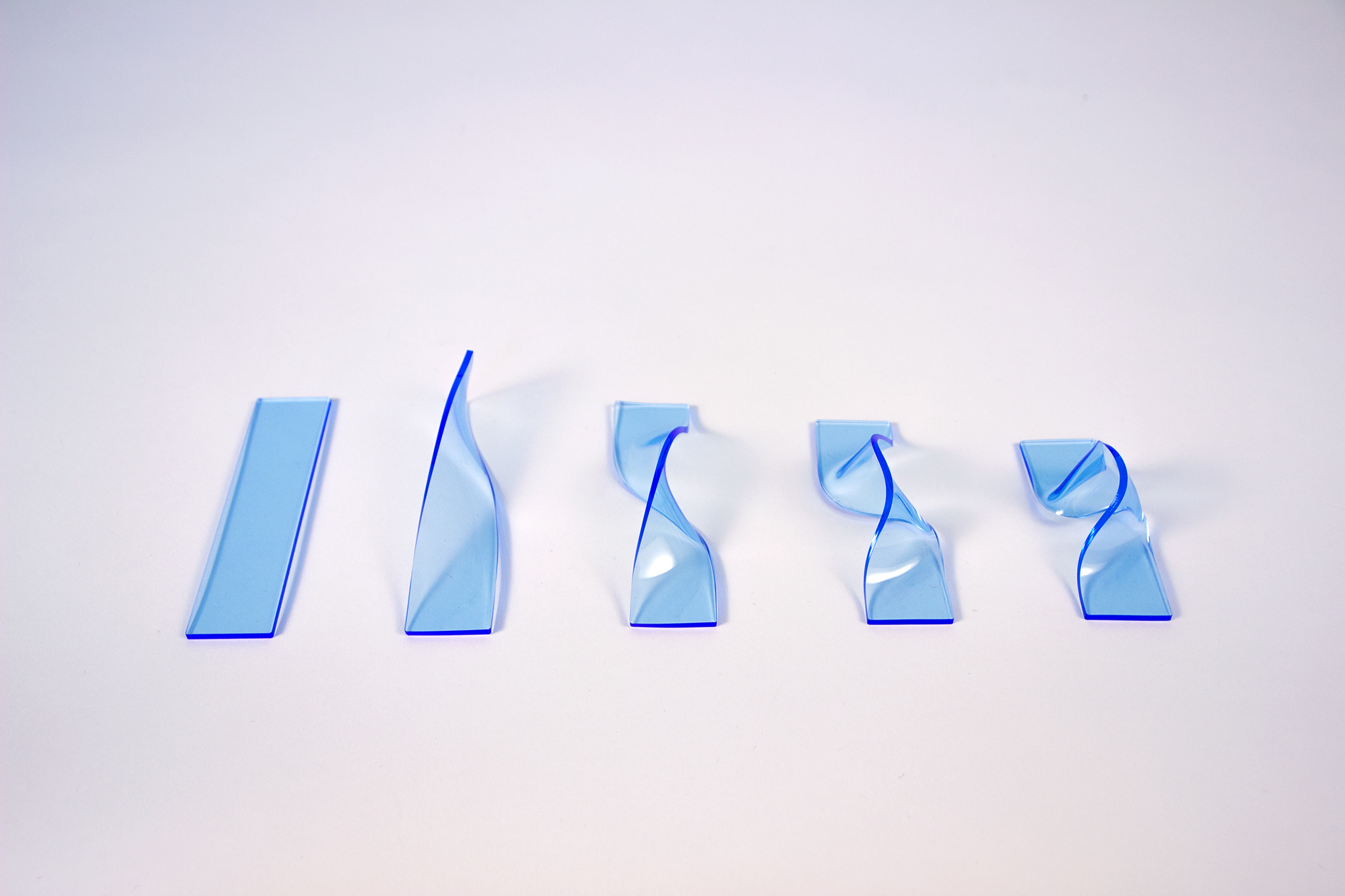 Die im Prozess entstandenen Formen und deren Entstehung waren oft nicht mehr ganz nachzuvollziehen. Darum entschied ich mich für eine Serie an Experimenten, anhand von gelaserten Acrylglas-Streifen mit den Maßen 30 x 120 mm. So sollte jede Verformung in fünf Schritten von der planen Fläche zum endgültigen Zustand gezeigt werden.