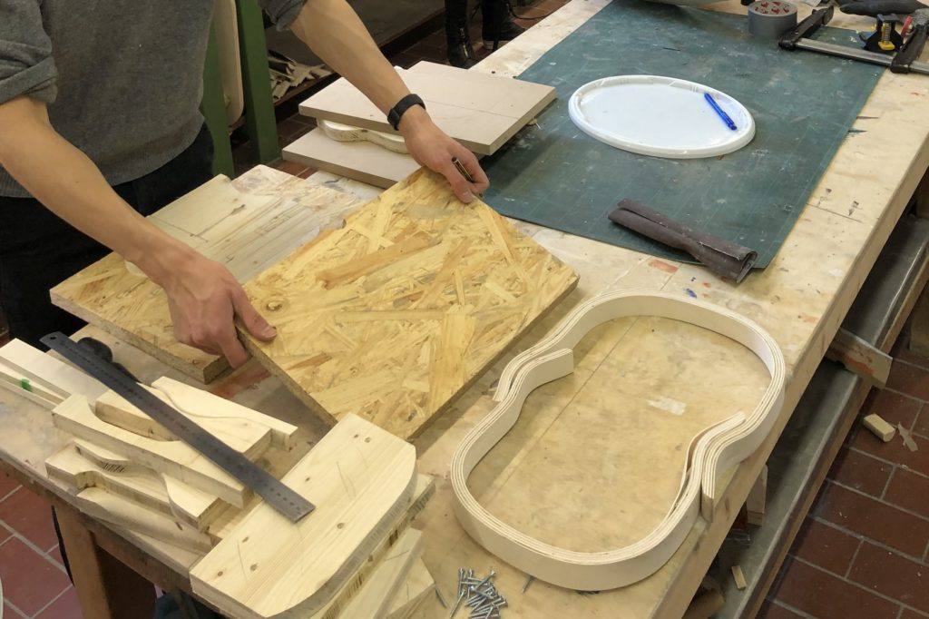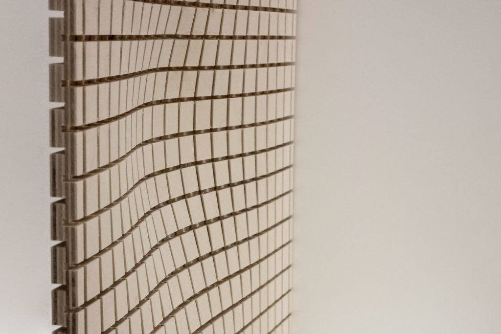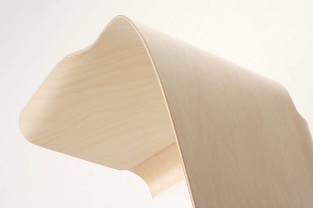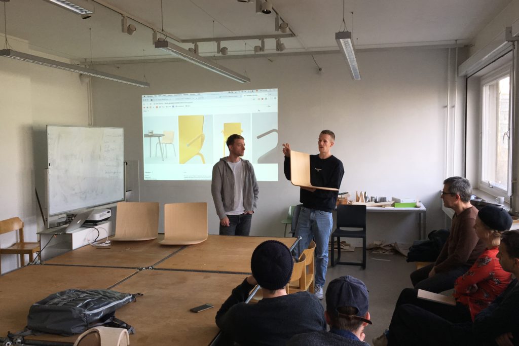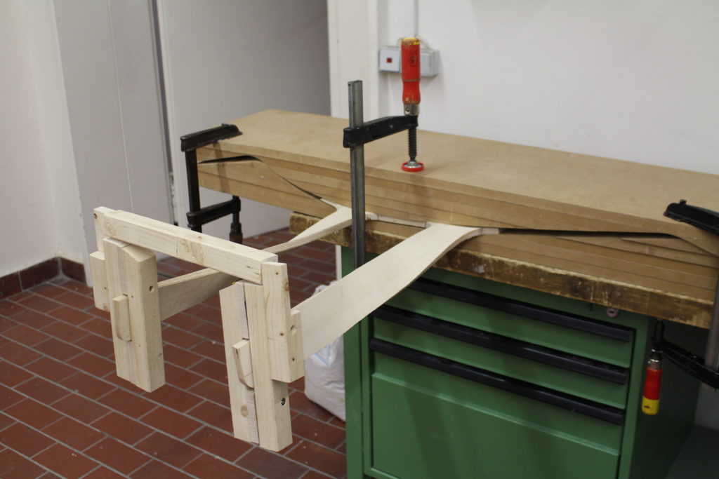 und Parameter der Formholzherstellung vermittelt und anschließend in einem individuellen Entwurf die Möglichkeiten des Plattenwerkstoffs UPM Grada experimentell erforscht. Wesentlich war dabei die Entwicklung neuer Umformprozesse.