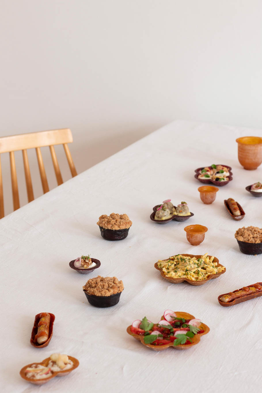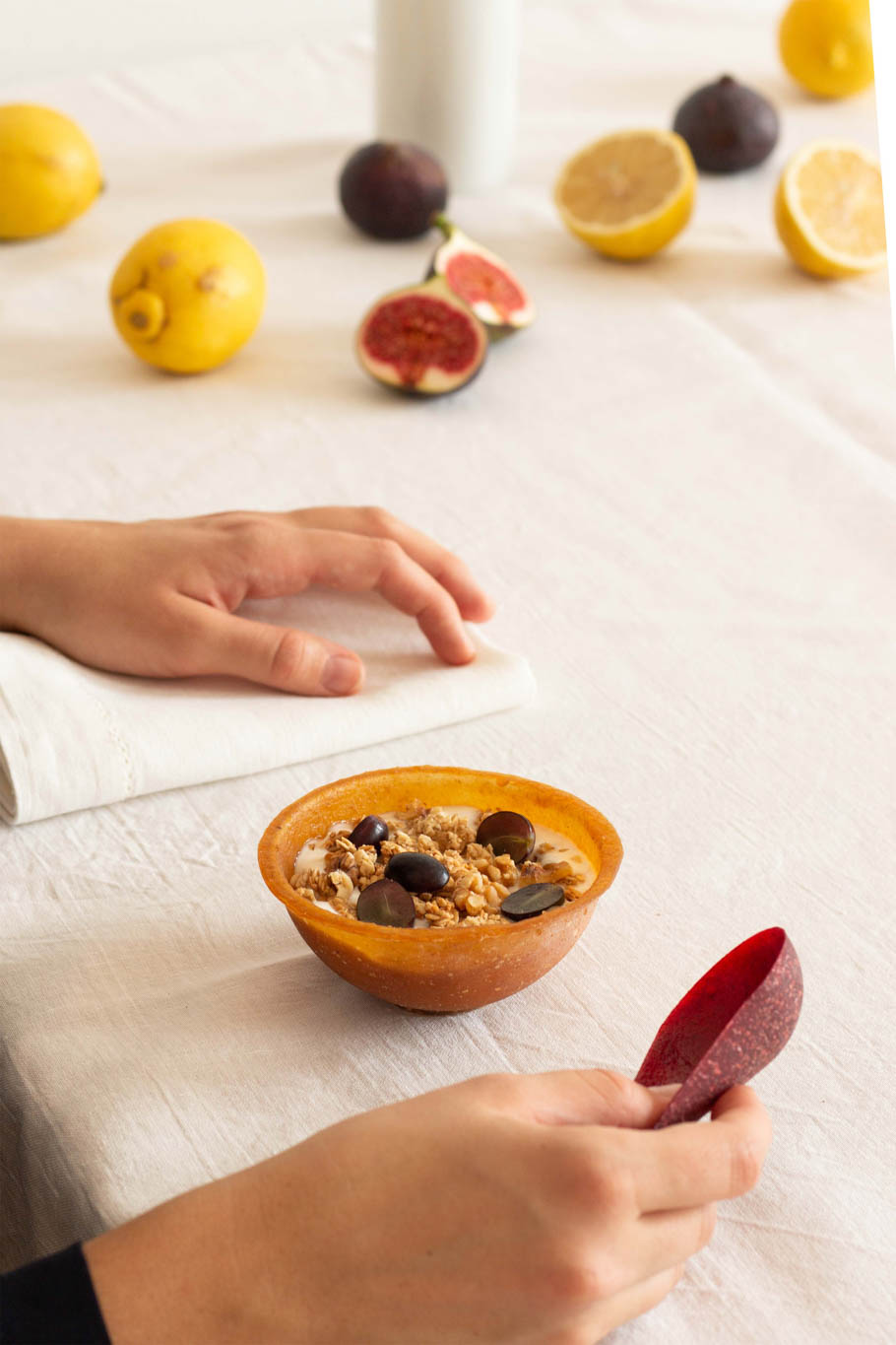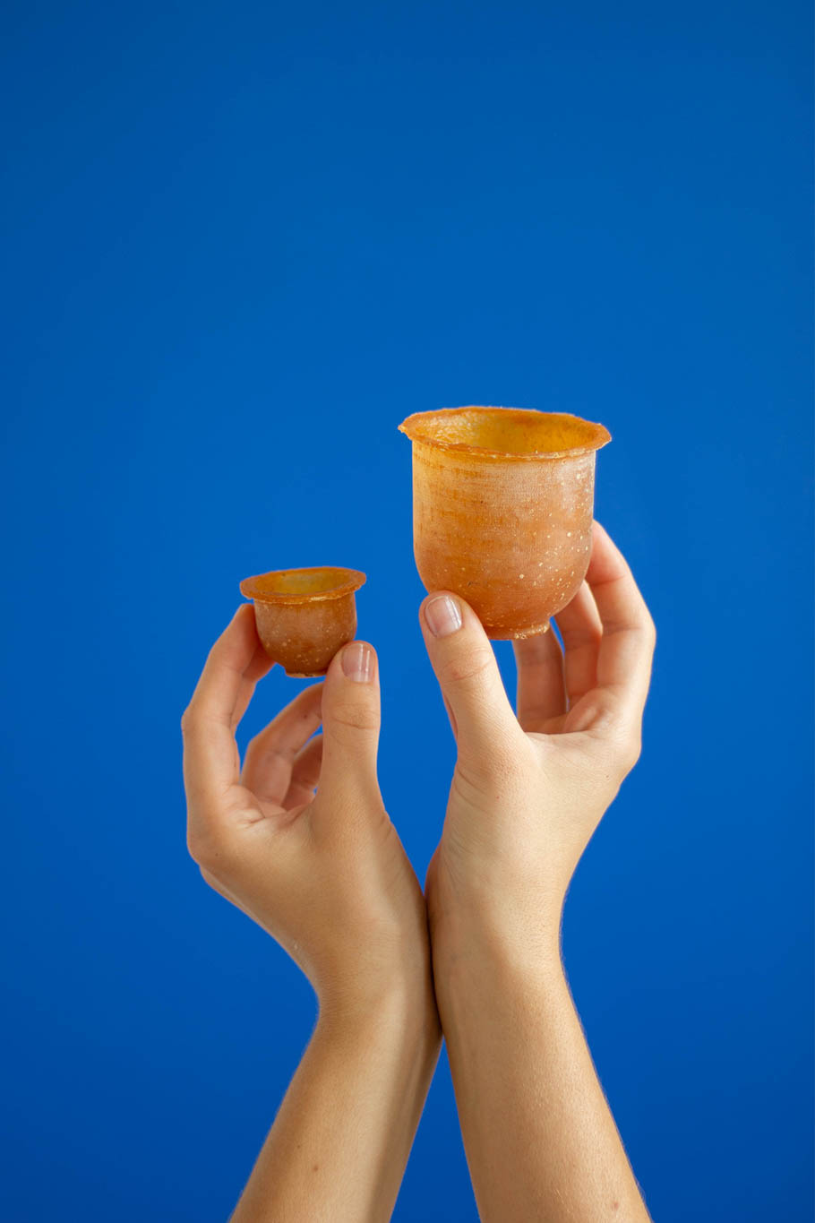 ISSO is a series of eatable bowls, plates, cups and cutlery, made of dried fruits and vegetables, that become part of a meal. Eating with food, means to eat with your hands, but at the same time eat without using them. You make the utensils and plates part of the ceremony, eat them with your meal and in the end nothing is left. You can get ISSO in many different types and sizes, depending on how big your meal should be. But the taste is as important as the shape.