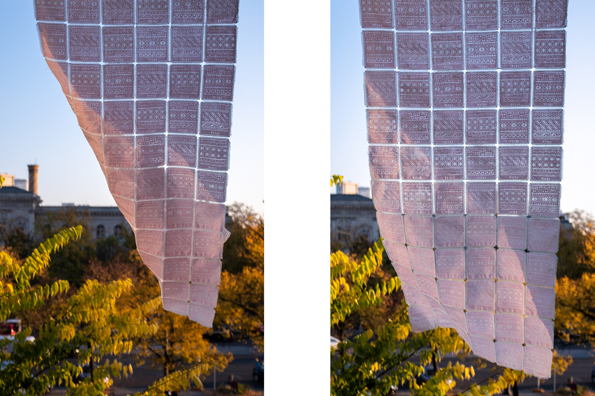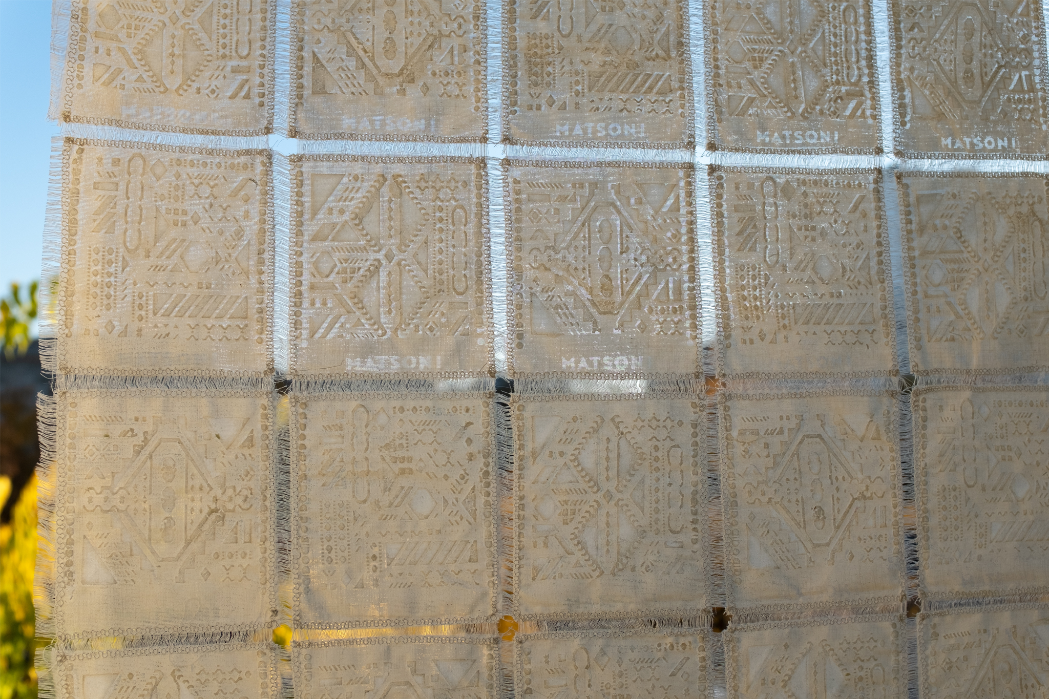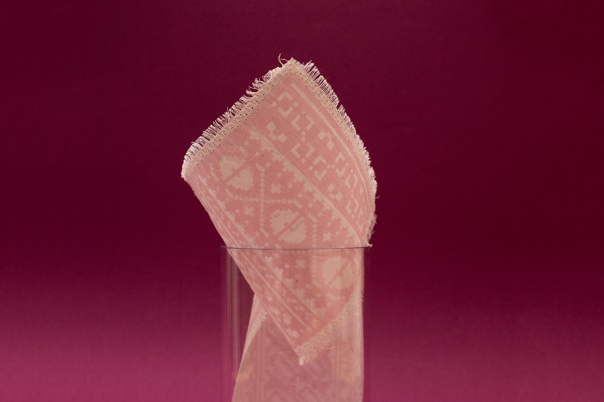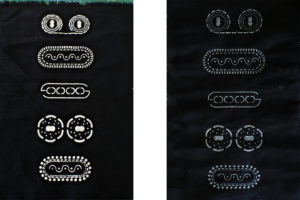 Inspiriert davon trage ich die Sauermilch, die als Starter-Kultur für einen neuen Produktionszyklus wieder benutzt werden kann, in bestimmten Formen auf Stoffe auf. Die Formen werden als Grafik oder Ornamente präsentiert, welche die beinhalteten Bakterien visualisieren. Der in Quadrate eingeteilte Stoff wird als Einheit für den Kultur-Speicher gemessen, den man leicht abschneiden und daraufhin wieder als Starter-Plattform für neue Sauermilch benutzen kann.
