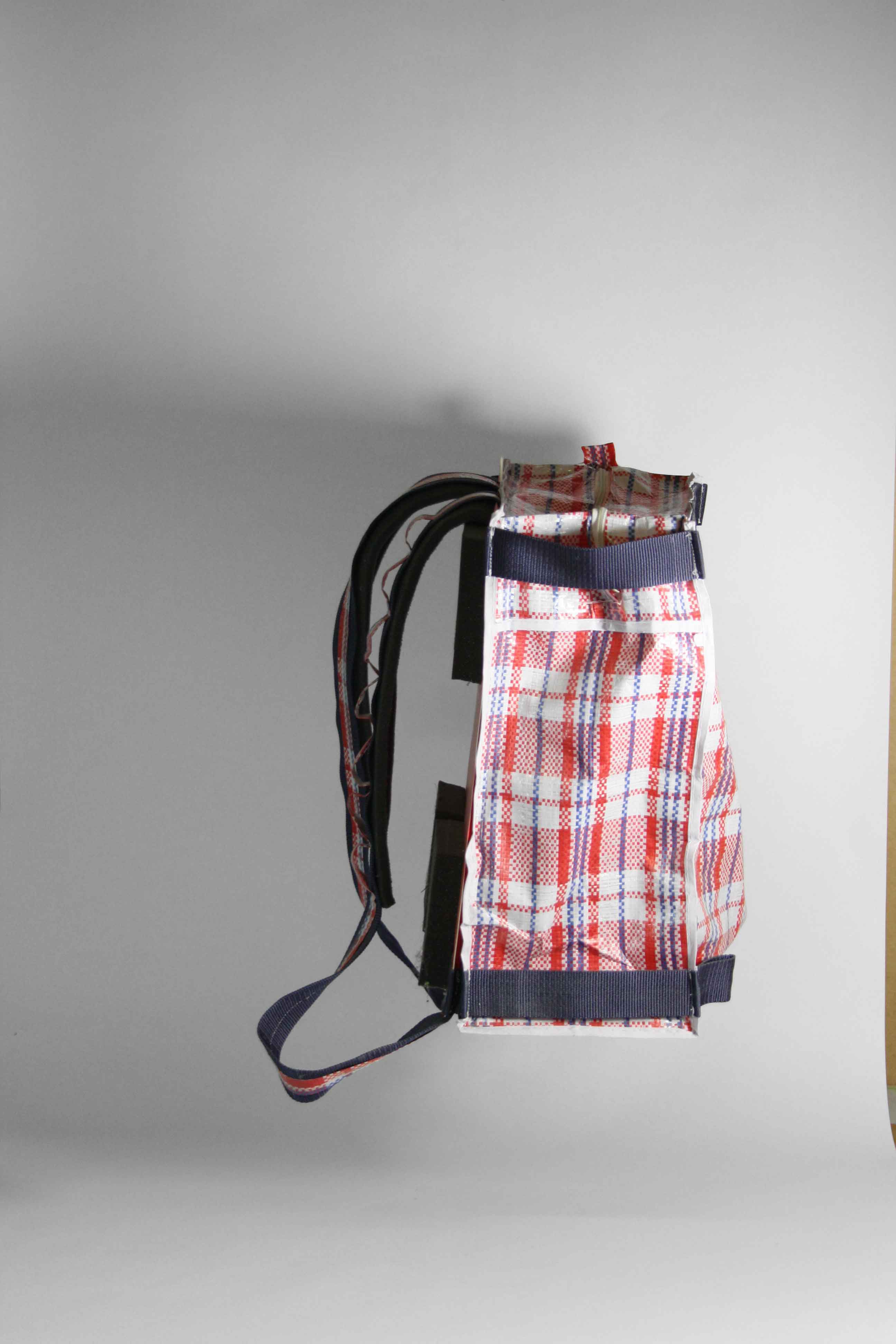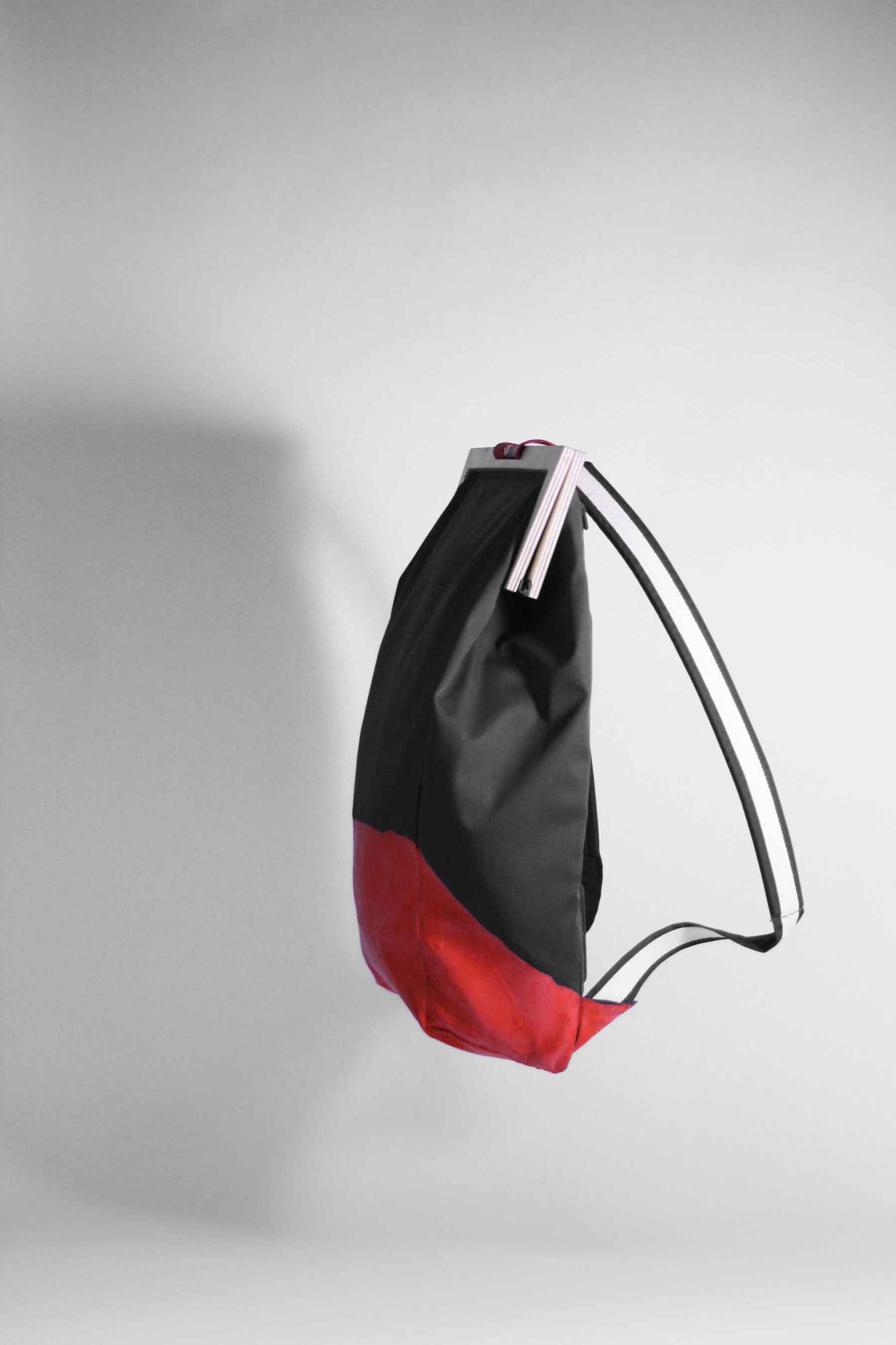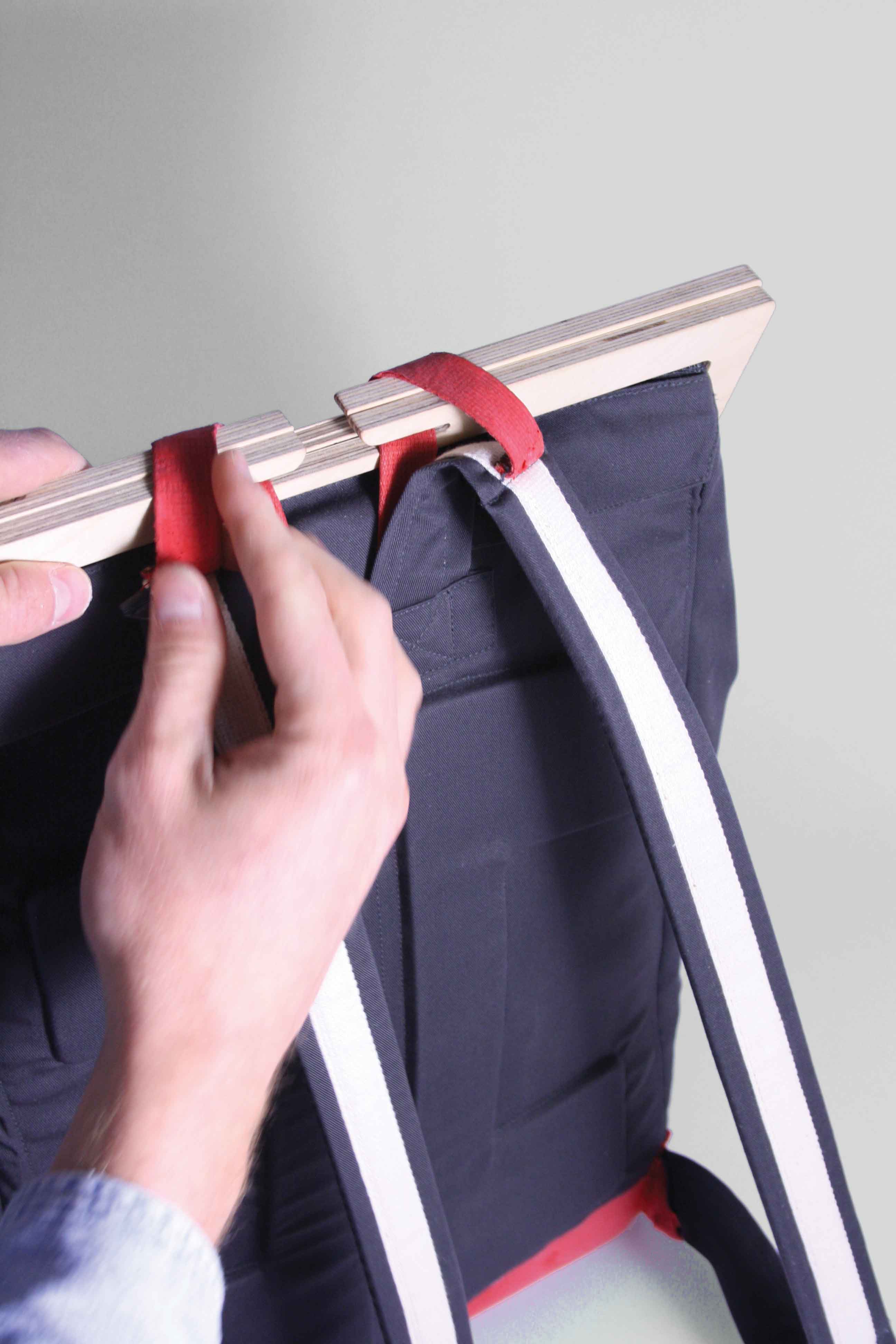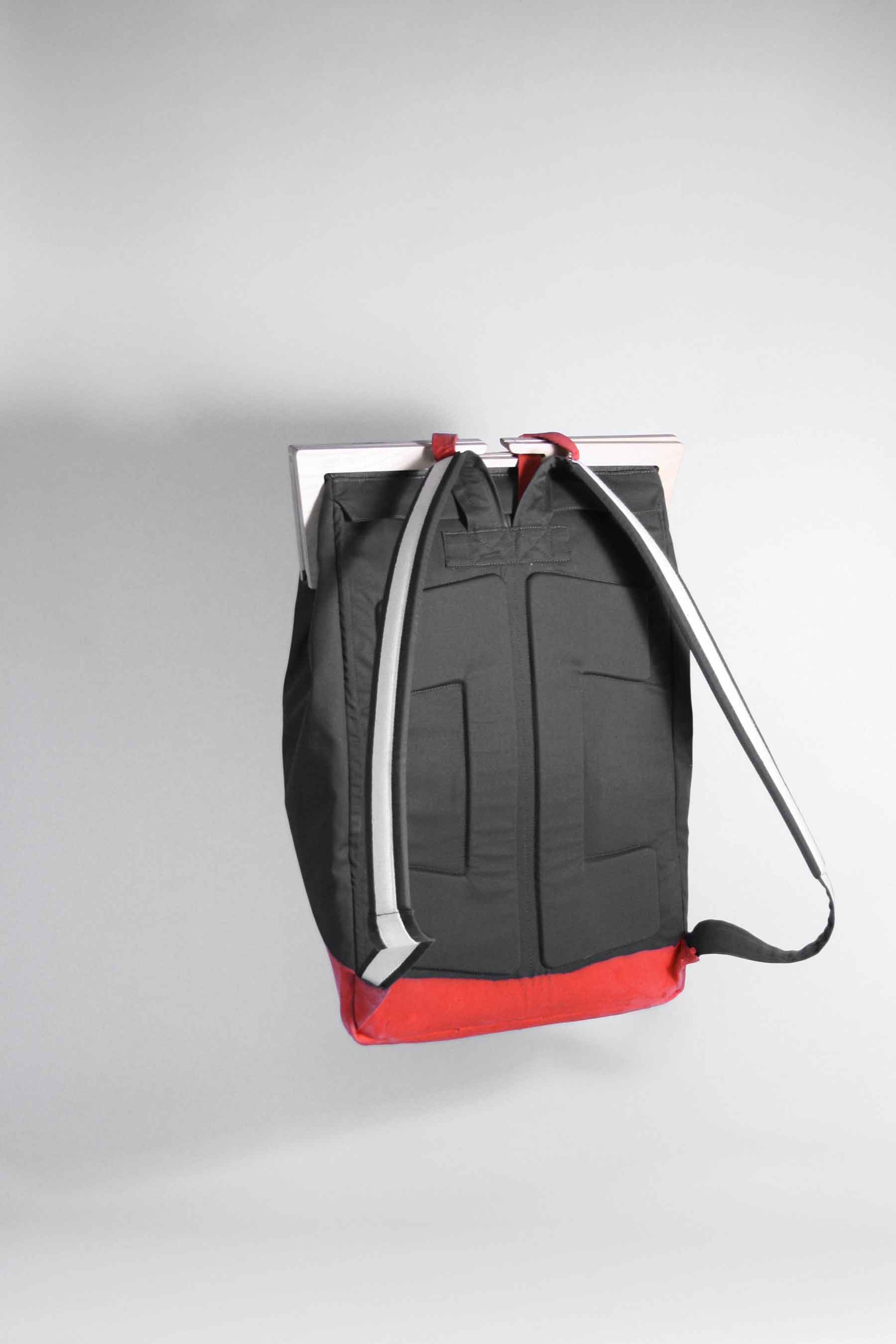 The bottom is dipped in liquid latex which closes the seams and offers a maximum of resistance against everything you`re affraid of. The inside nicely arranged with compartements for all your gadgets. We put a self-sufficient laptop case on the outside, right under the shoulder straps.