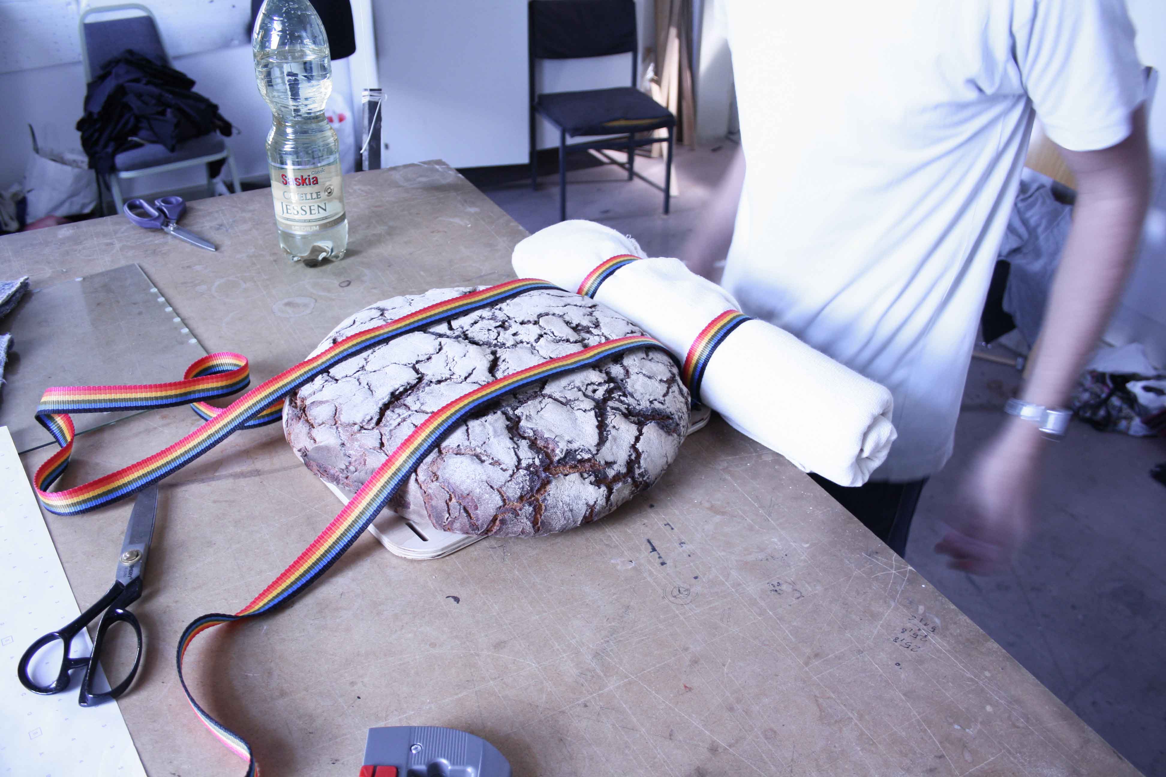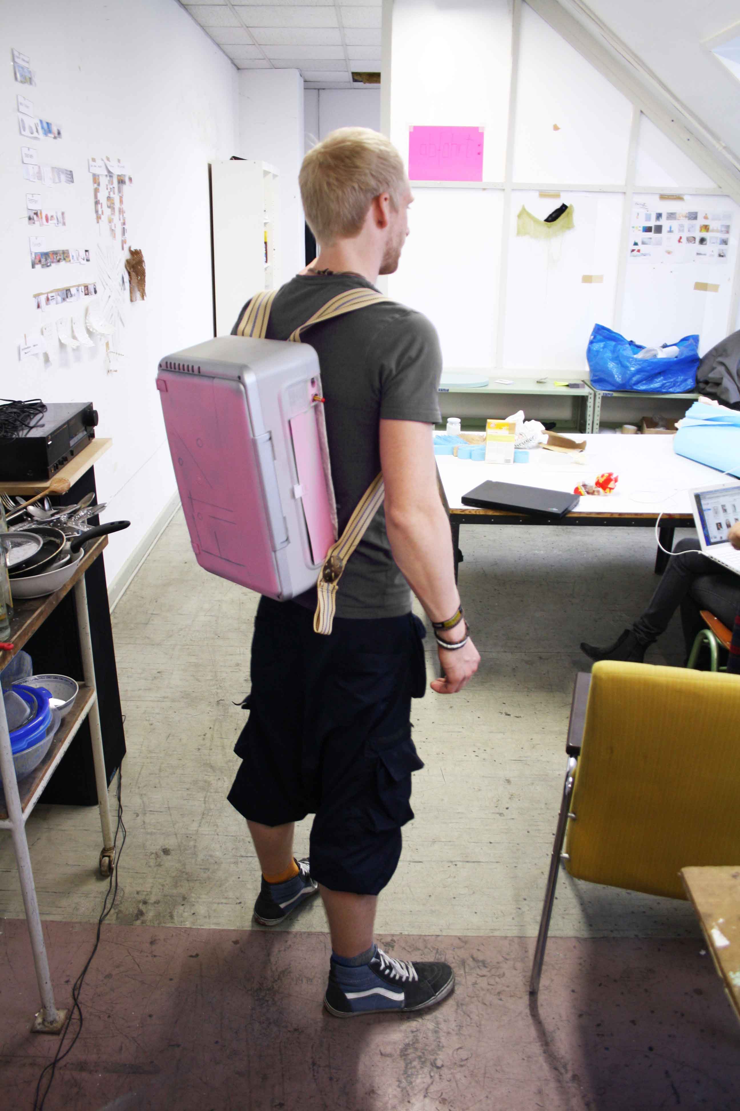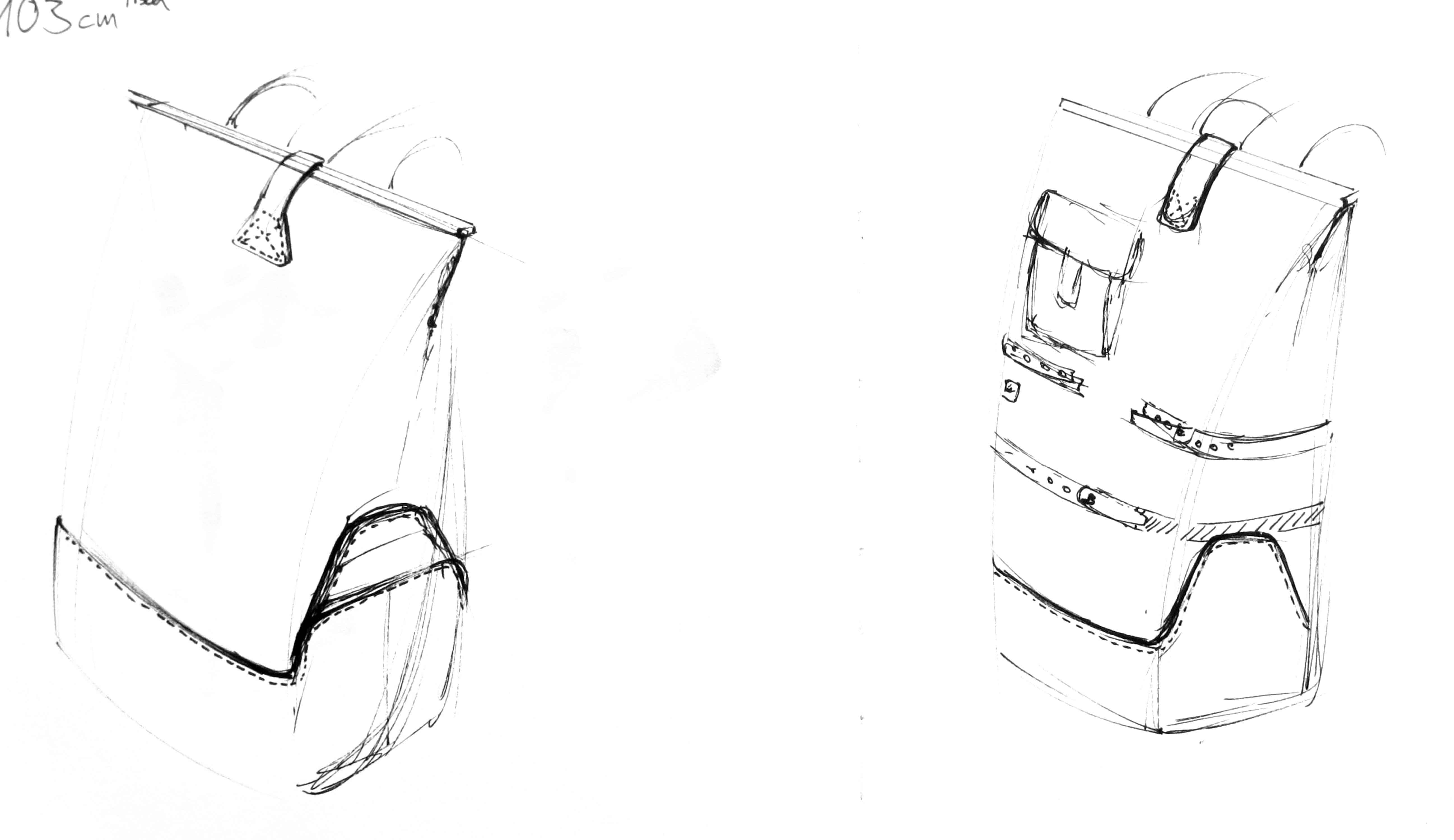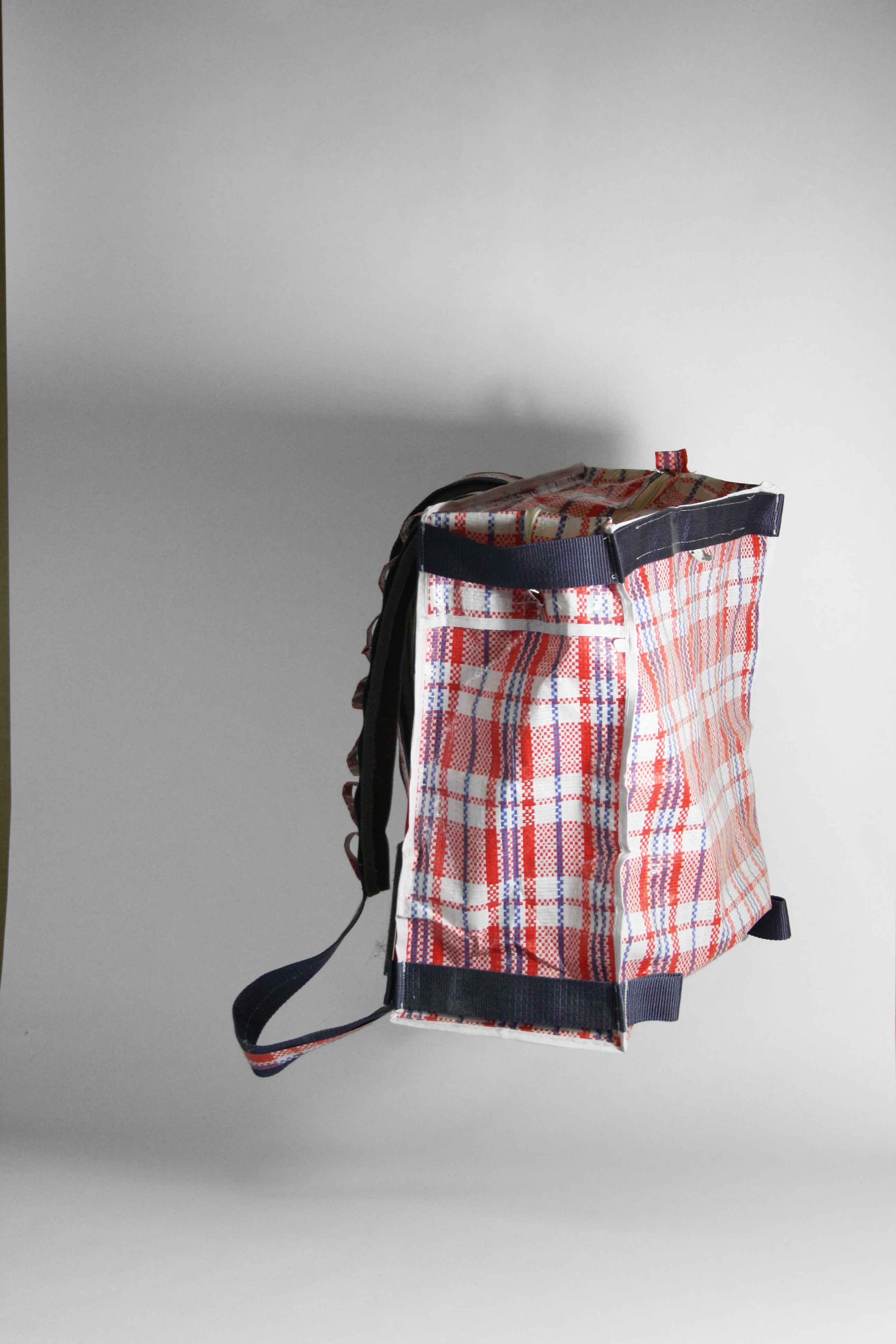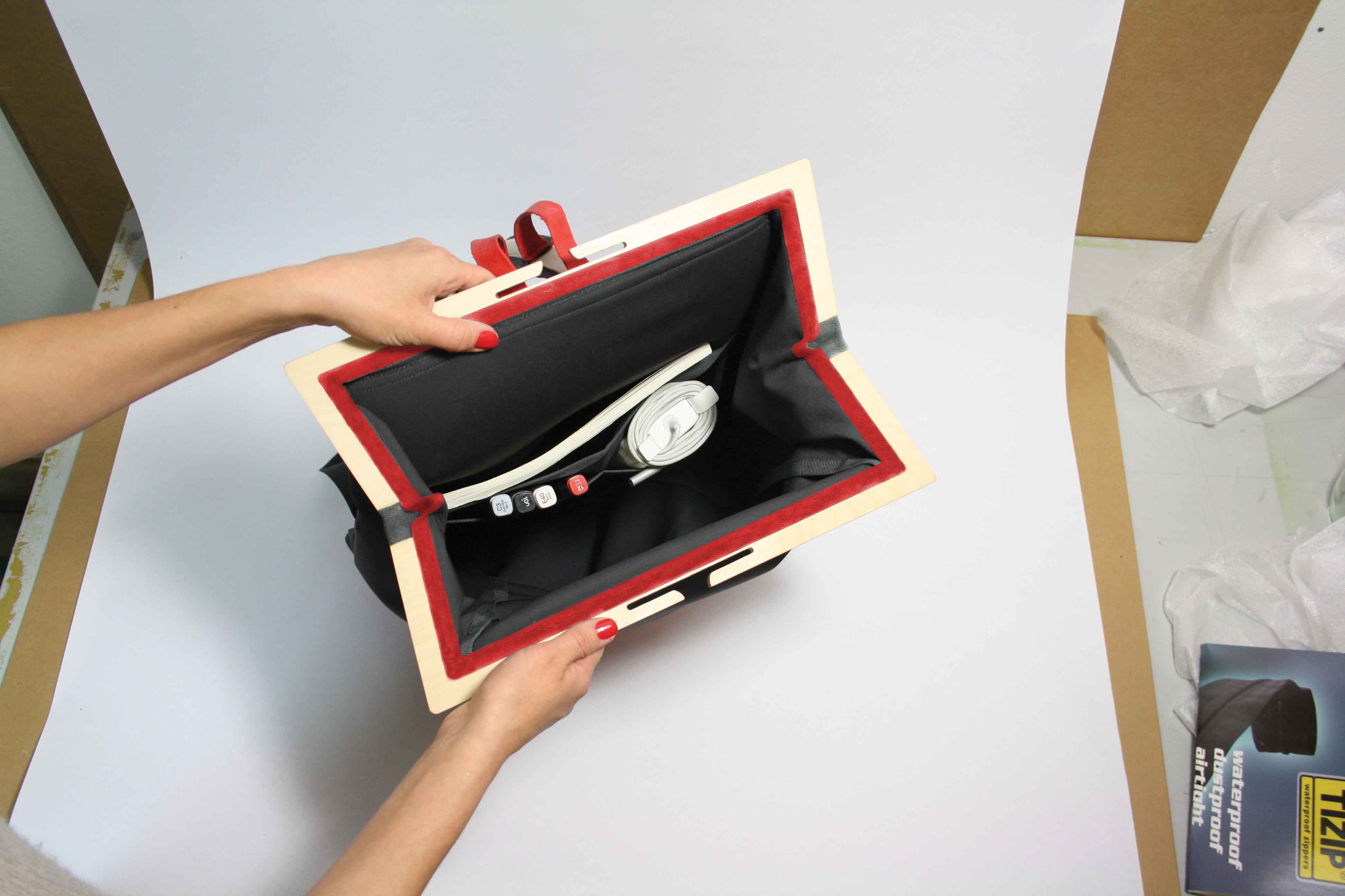 The bottom is dipped in liquid latex which closes the seams and offers a maximum of resistance against everything you`re affraid of. The inside nicely arranged with compartements for all your gadgets. We put a self-sufficient laptop case on the outside, right under the shoulder straps.