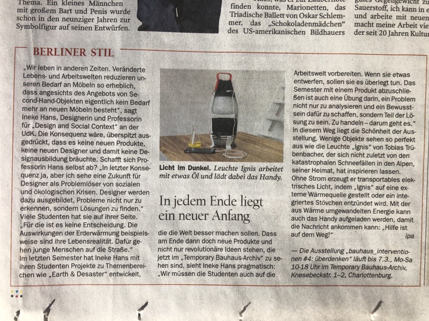 Design & Social Context presents the outcomes of their New Grounds projects as INTERVENTION #4: RETHINK in Bauhaus Archiv, Berlin. The exhibition is discussed in the Tagesspiegel of 16 Feb. 2019.