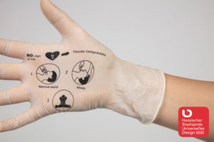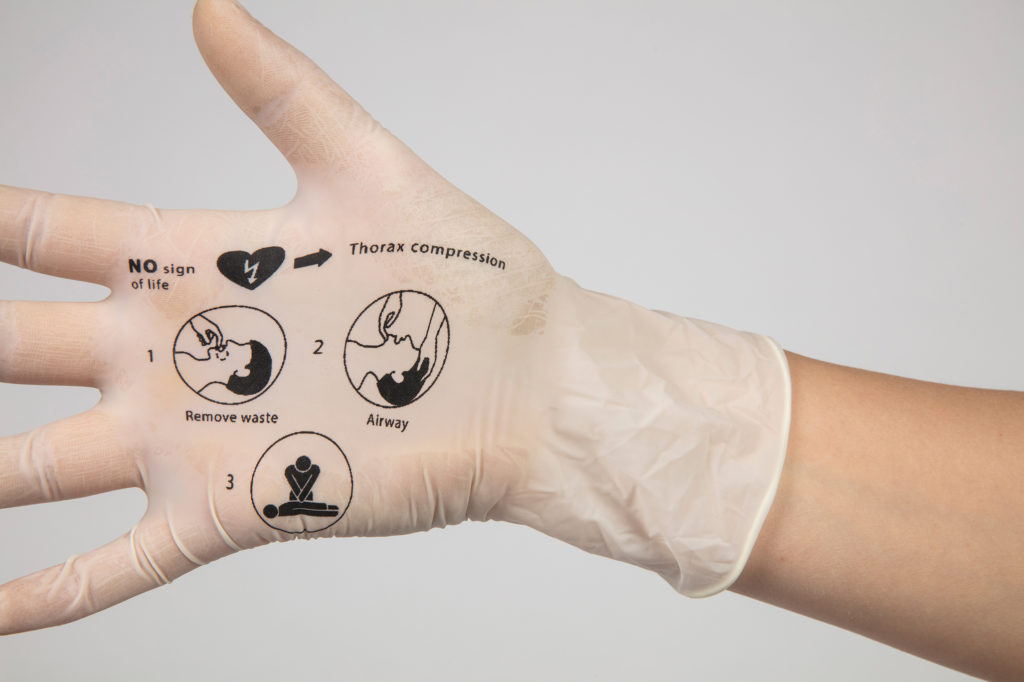 Printed latex gloves guarantee self-protection and provide the needed instructions of how to act well in an emergency situation. The first aid gloves support people to take the right steps and actively help.