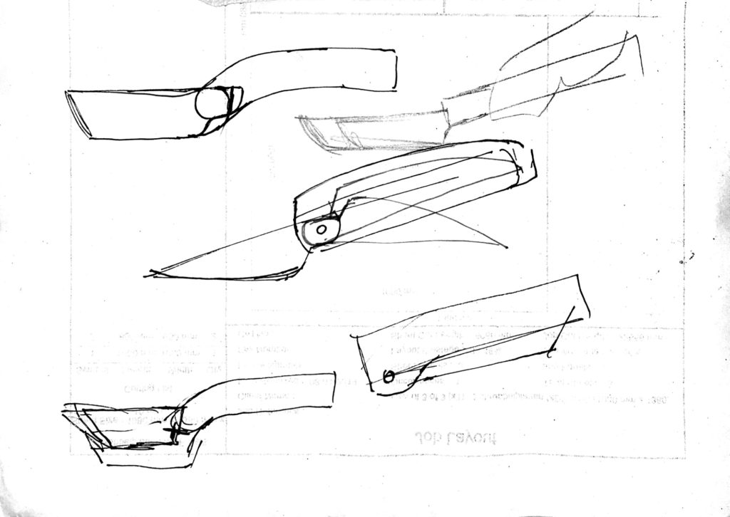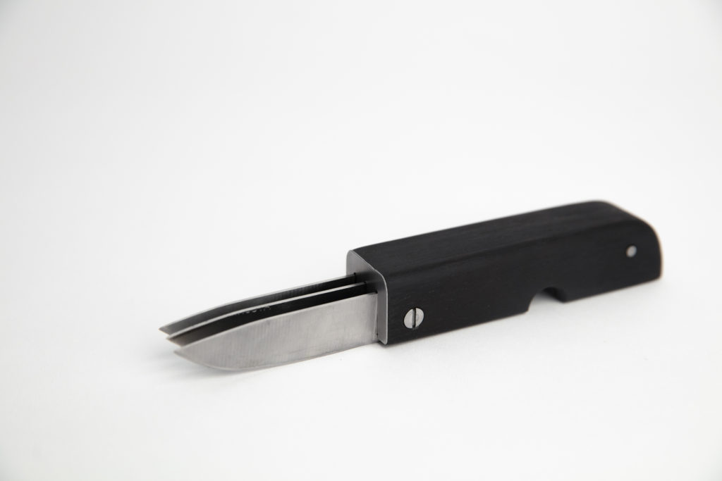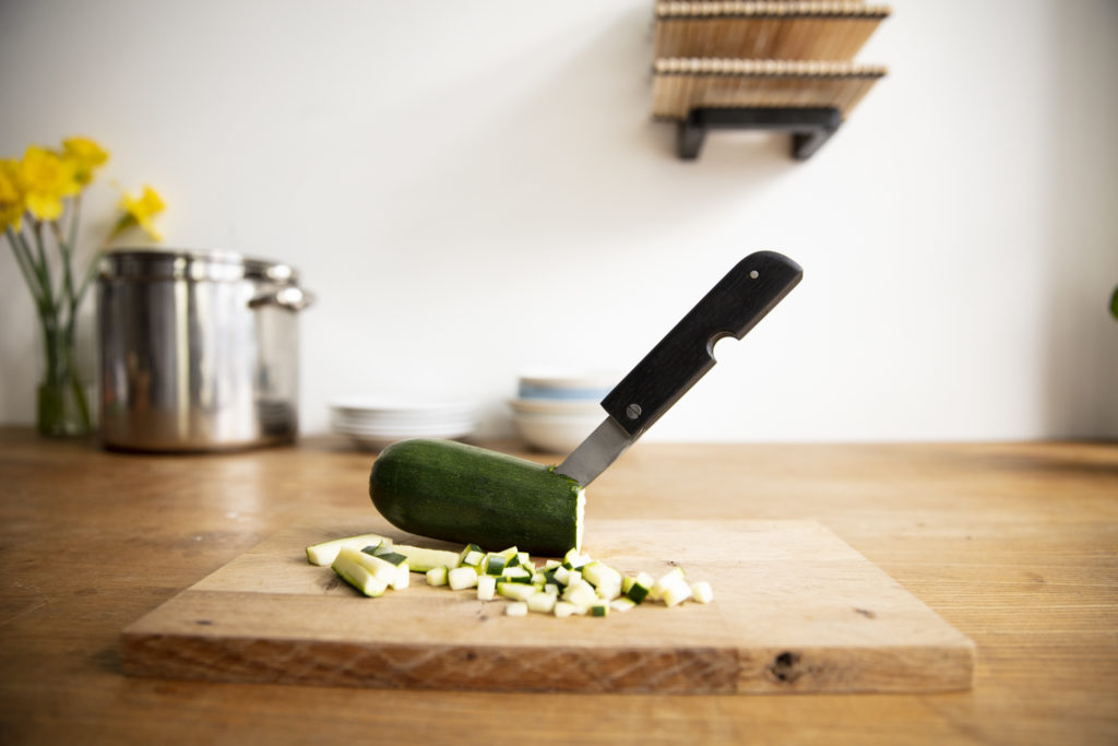 The cutting device is a three bladed folding knife. The three individually usable blades allow a double function. First all three blades are used to slice the vegetable into stripes. Afterwards a single blade is used to cut the stripes into dices.