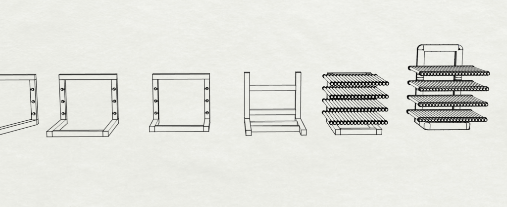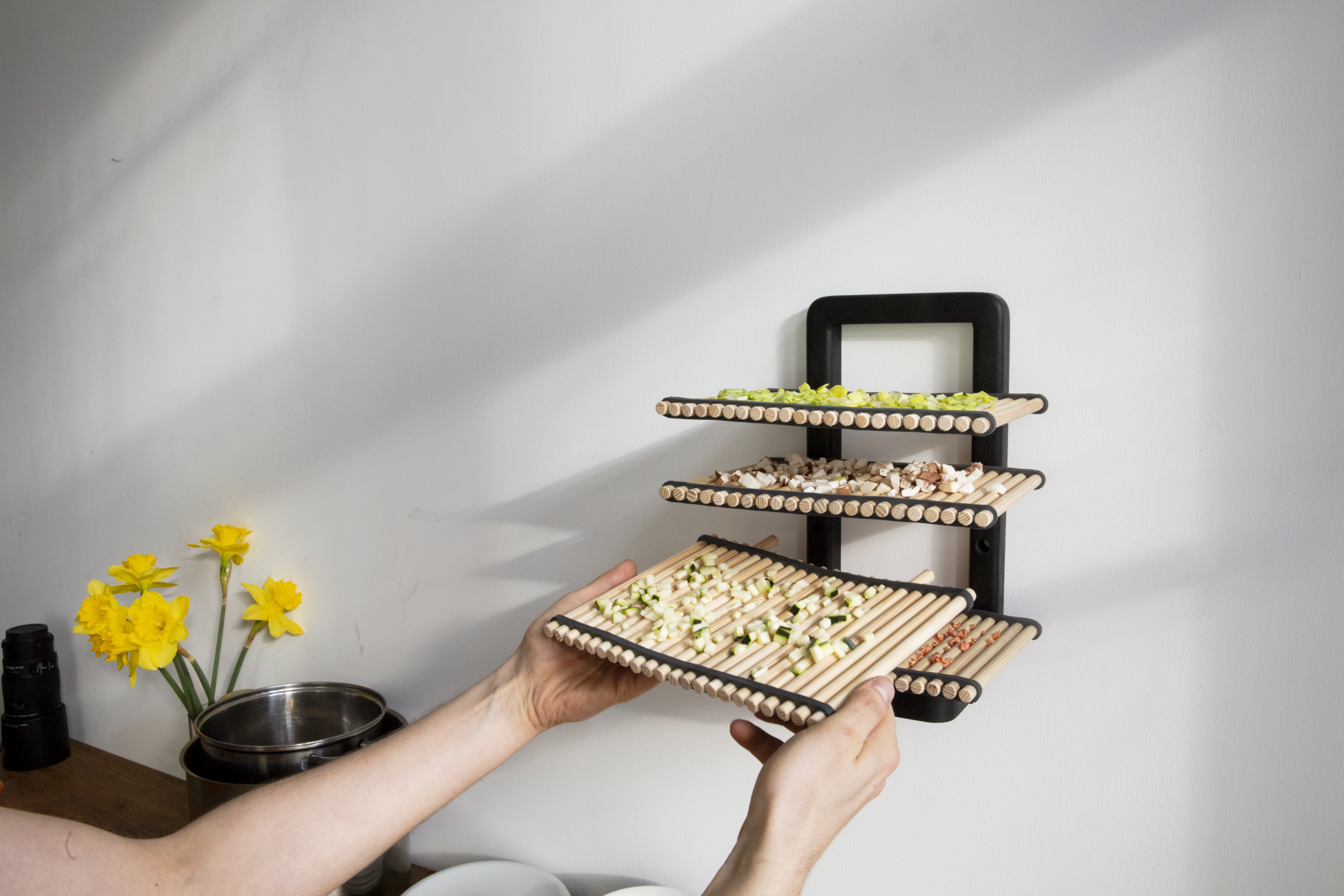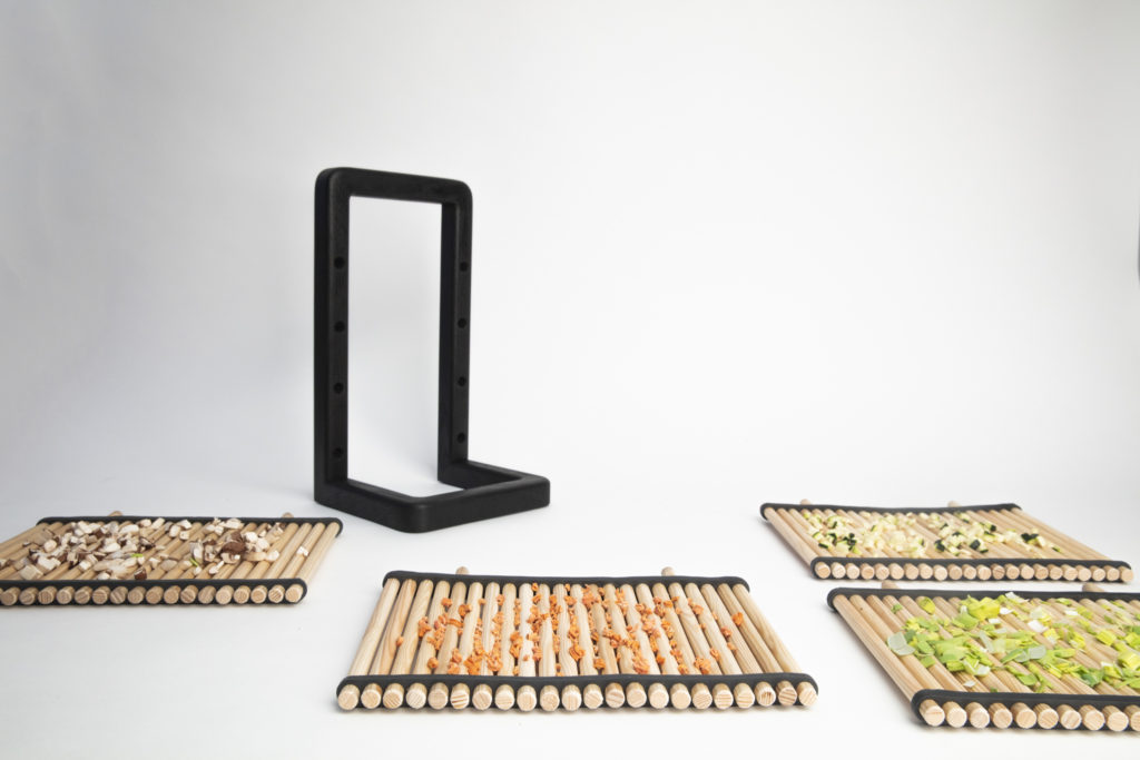 Vitaminimalism is a set that allows us to dice and dry vegetables that we do not manage to consume before they get bad. This is an old method of conservation that also preserves the essential vitamins. The drying rack only uses the antibacterial and moisture balancing material properties of conifer wood and the natural room airflow.