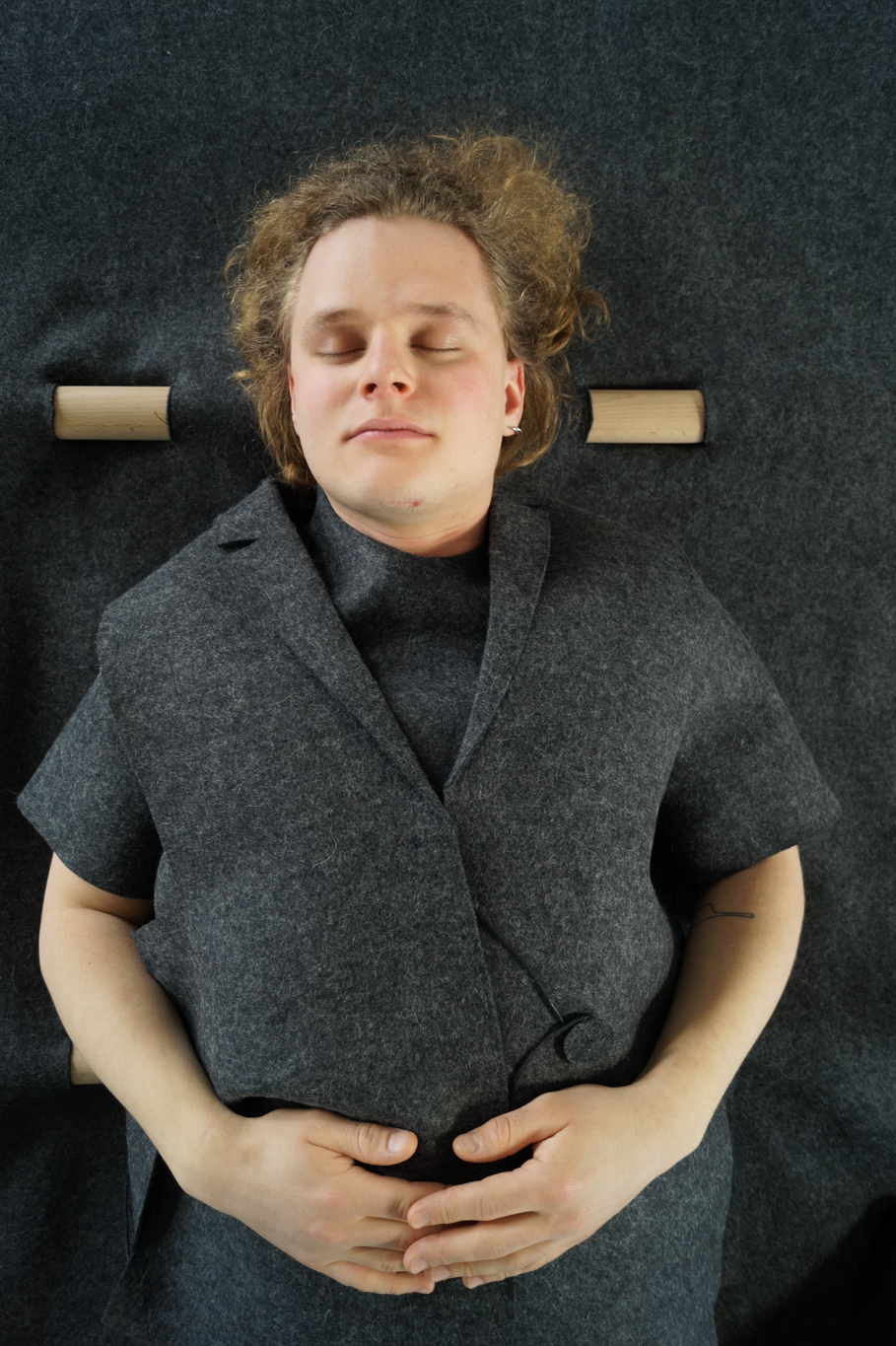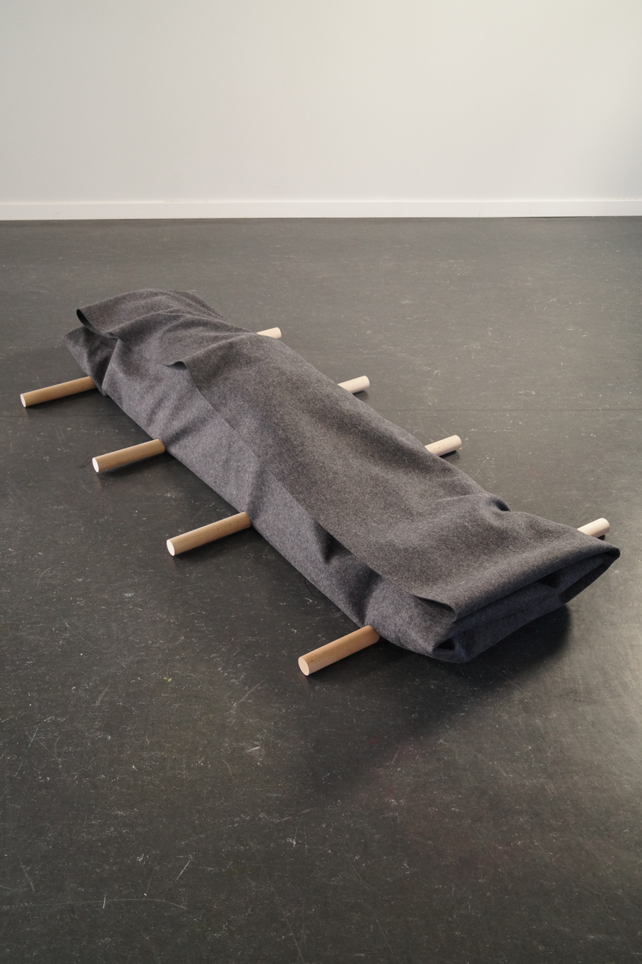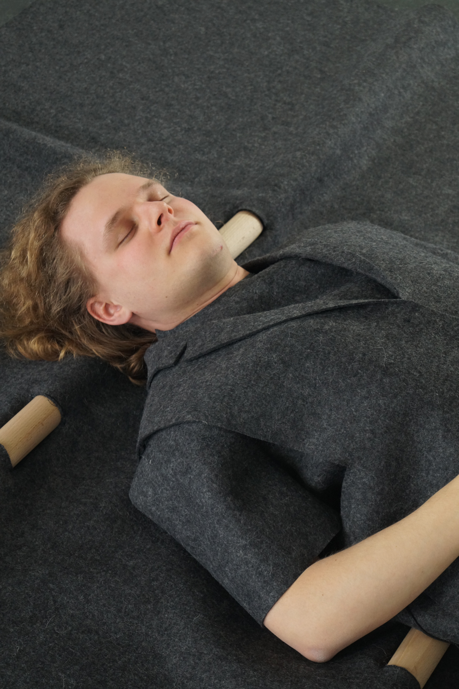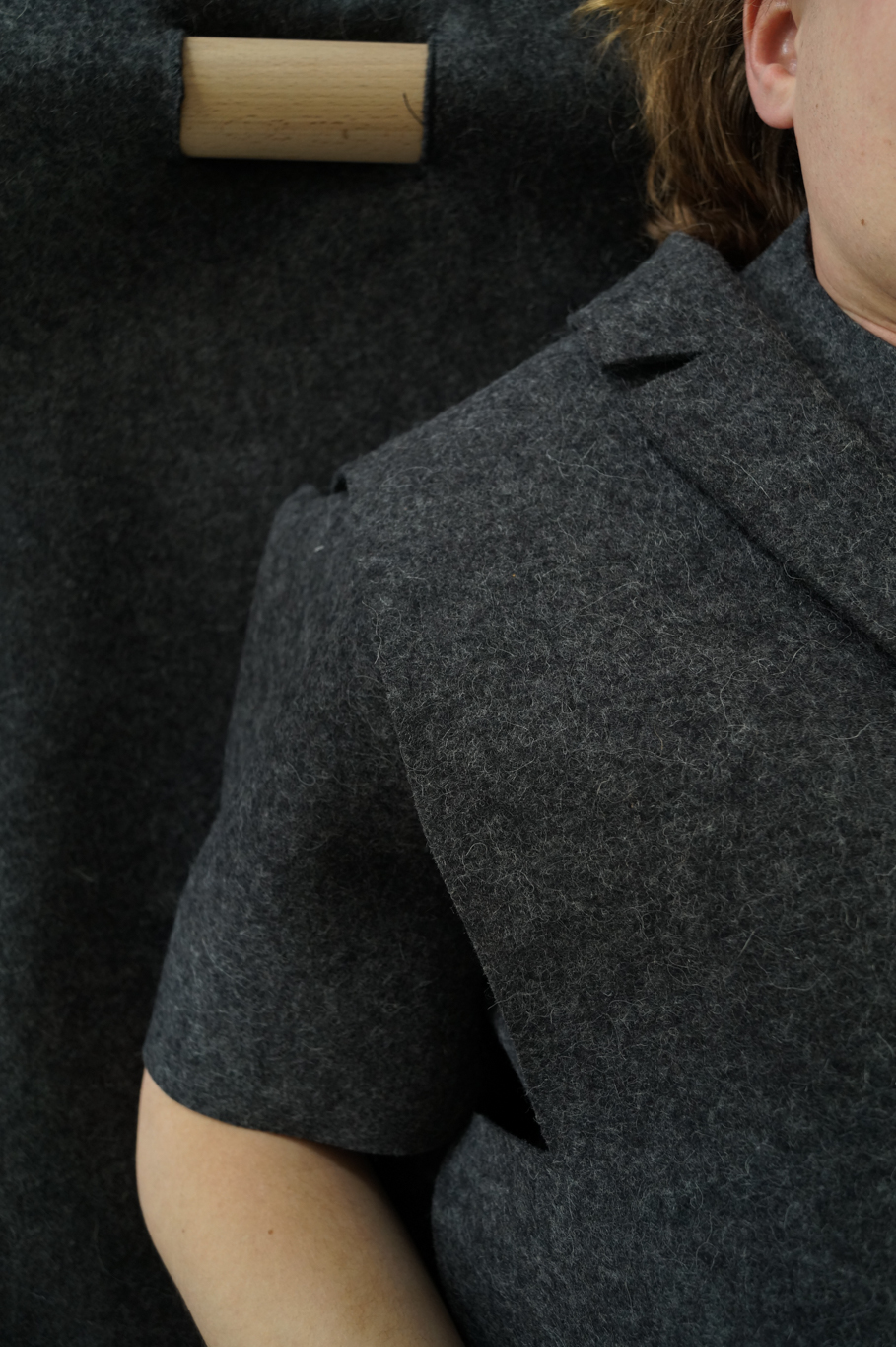 Die zweite Sillhouette wird durch einen Anthrazit melierten Filz dominiert. Auch dieser hat ein Symbolische Funktion von Schutz. Die Trage besteht in diesem Fall aus Buchenstäben, die durch die vertikalen Öffnungen im Textil geschoben werden können.