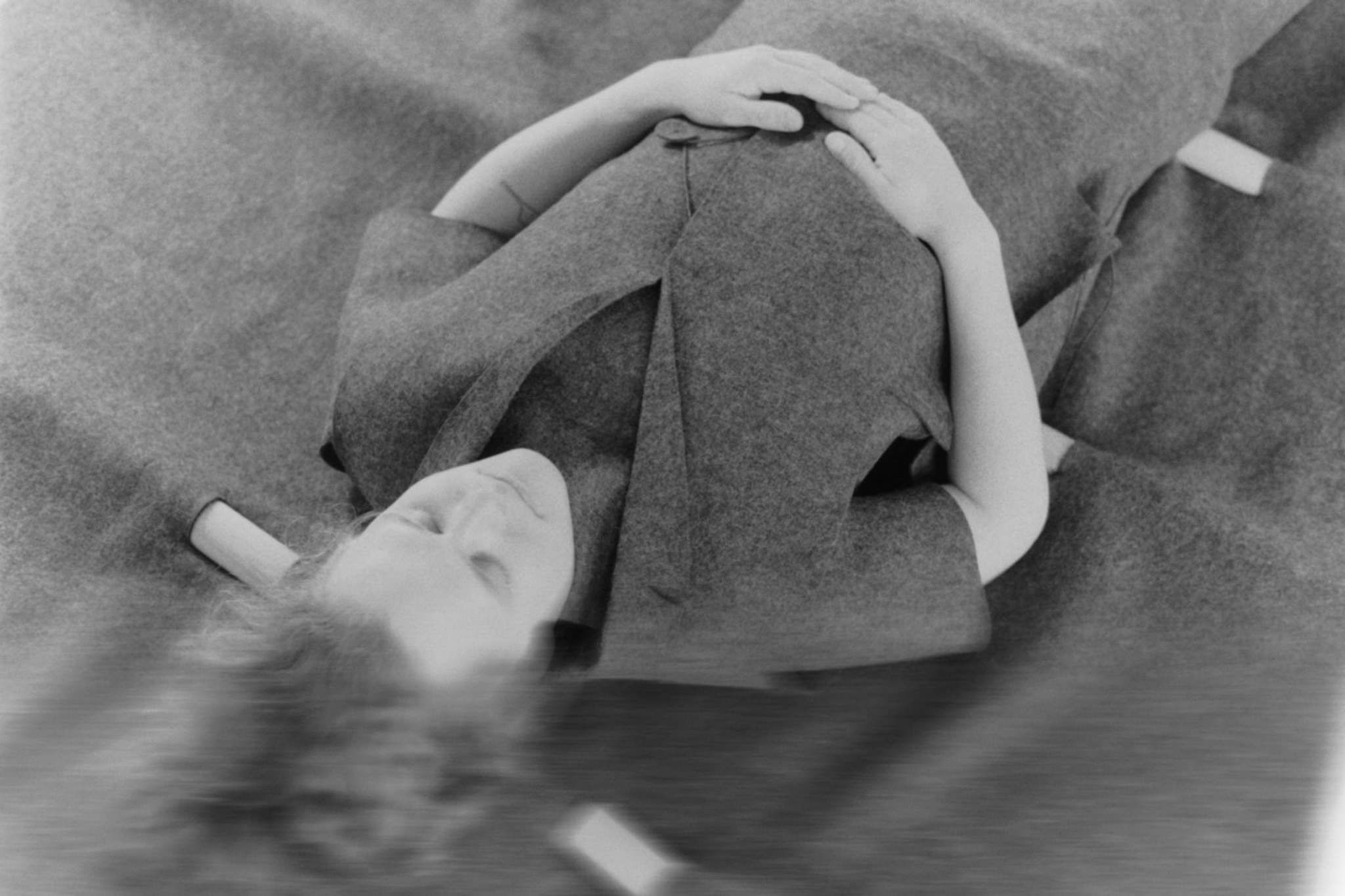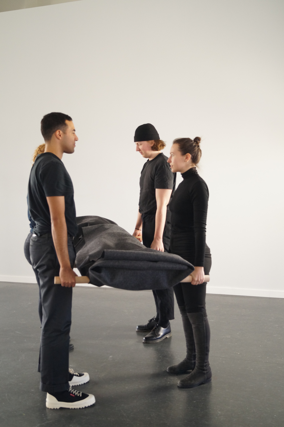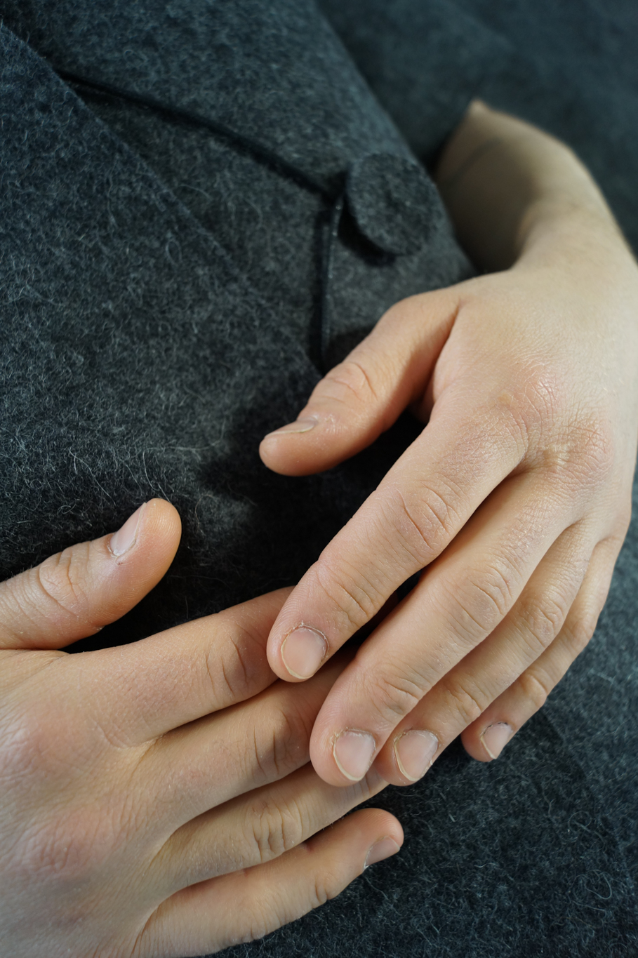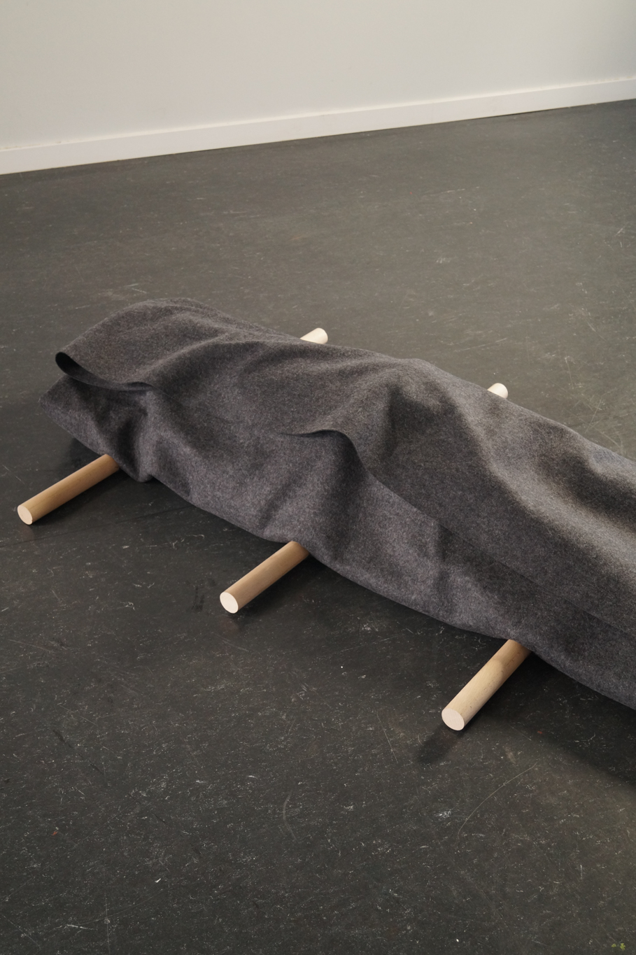 Die zweite Sillhouette wird durch einen Anthrazit melierten Filz dominiert. Auch dieser hat ein Symbolische Funktion von Schutz. Die Trage besteht in diesem Fall aus Buchenstäben, die durch die vertikalen Öffnungen im Textil geschoben werden können.