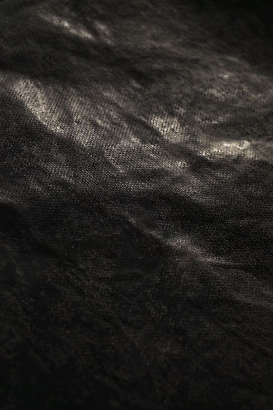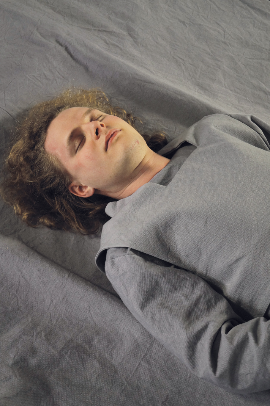 Die erste Silhouette besteht aus einem blau-grau gefärbten Baumwollstoff. Hierbei dient die Farbe Grau als Bruch mit der klassischen Beerdigungsfarbe Schwarz und ruft trotzdem eine gewisse Seriosität hervor. Außen wurde das selbe Material mit Wachs beschichtet. Dies hat sowohl die Symbolische als auch Praktische Funktion des Schutzes des Leichnams. Die Kiefernstäbe, die als trage fungieren, werden nur durch Tunnel in der äußeren Lage des Textils gehalten. Sie können nach belieben mit beigesetzt werden oder vorher entfernt werden.