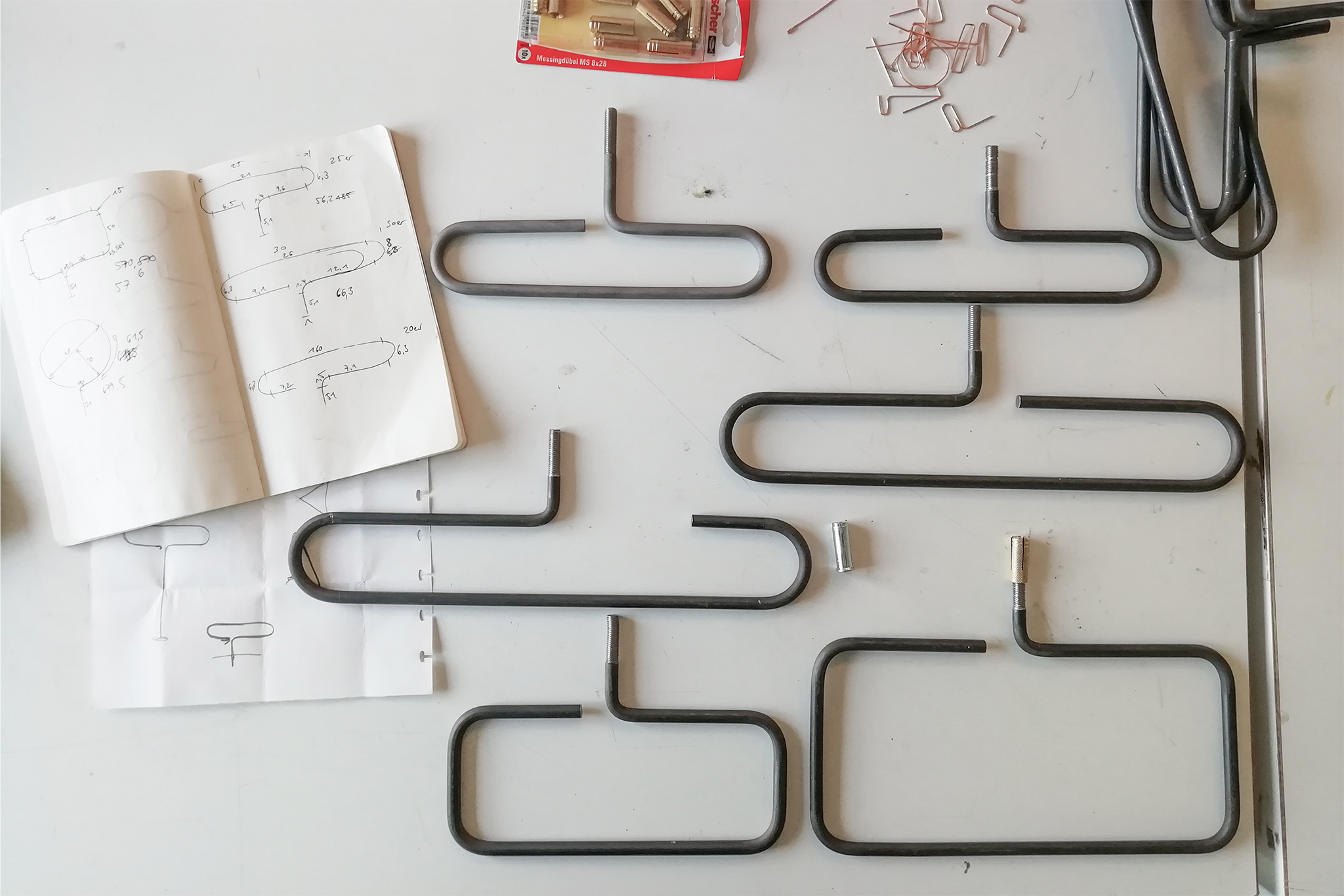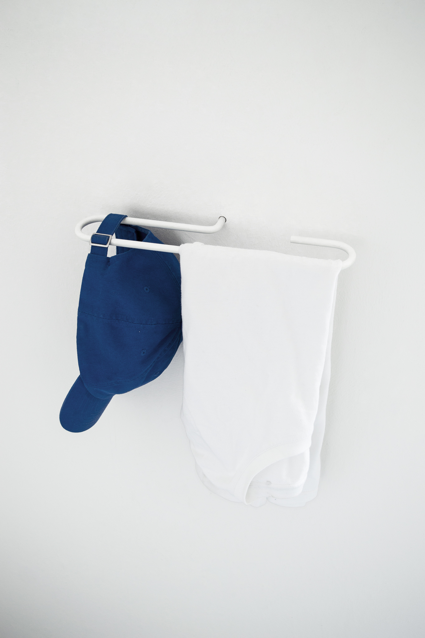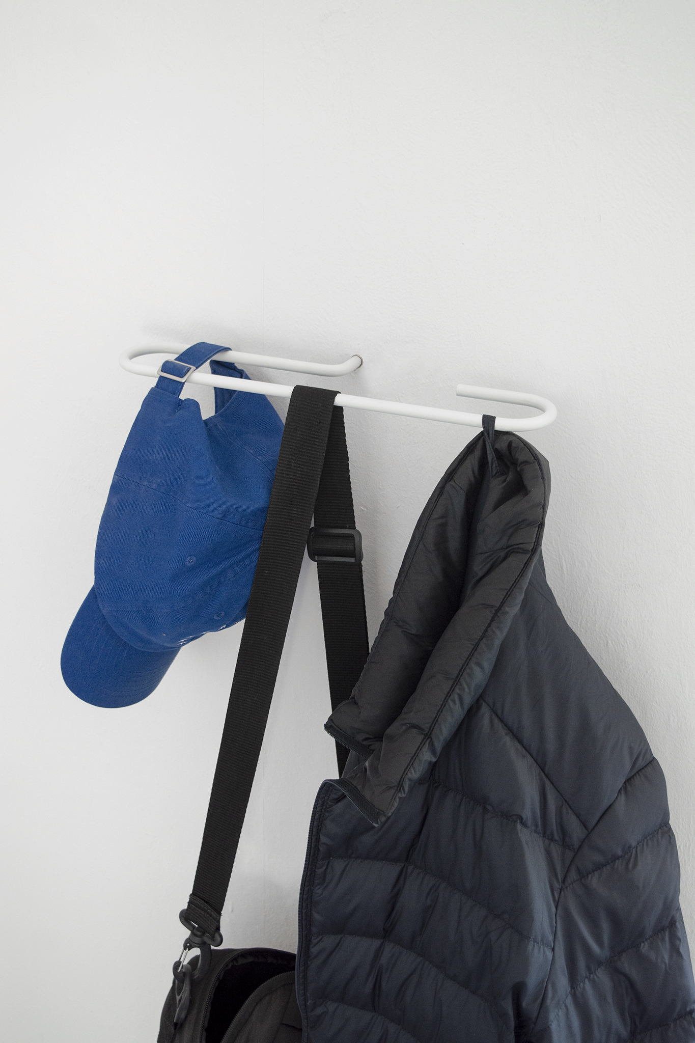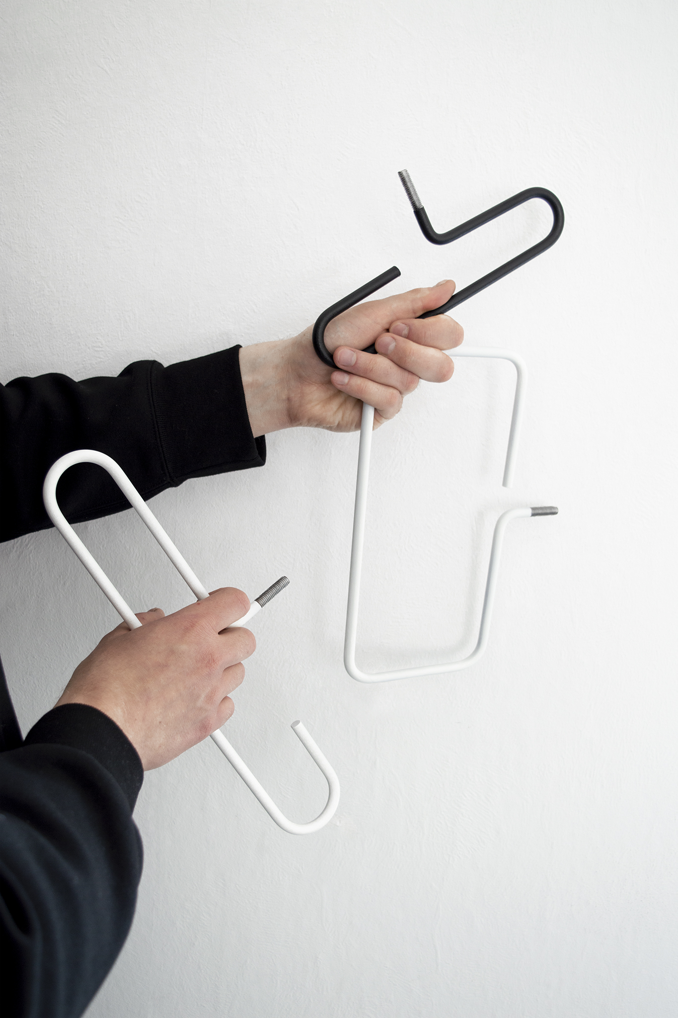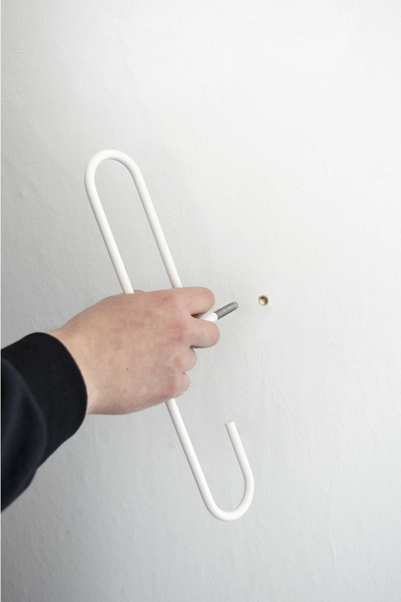 The FRAME HOOK was born from the direct inspiration of a screw hook for an easy and simple method of hanging clothes or objects. The idea of magnification and formal reinterpretation of this conventional wall hook forms the concept of this short project. The different curved shapes are fixed with a standardized brass dowel in the wall and can be arranged freely. The different shapes allow different uses and work both horizontally as vertically.