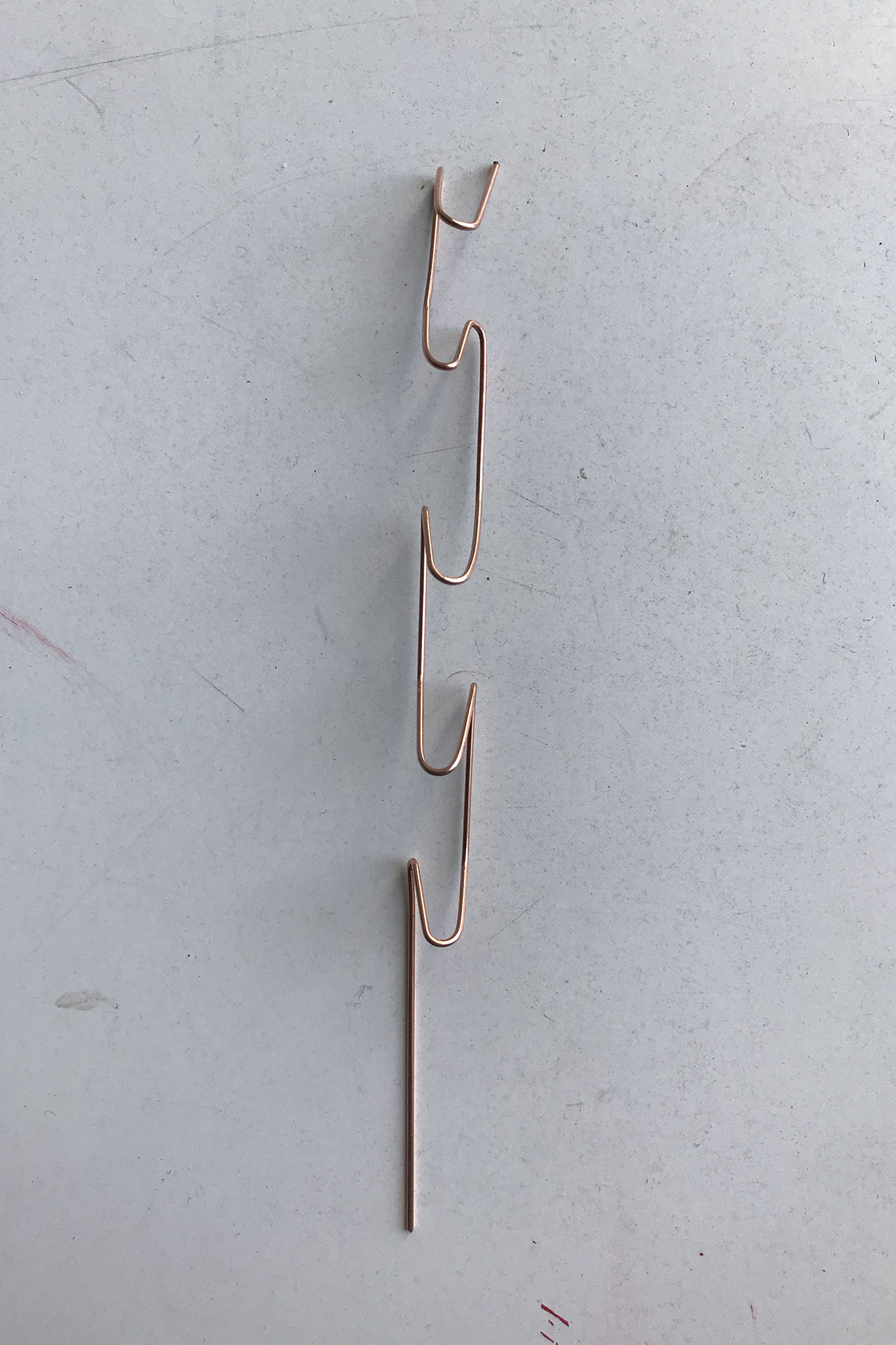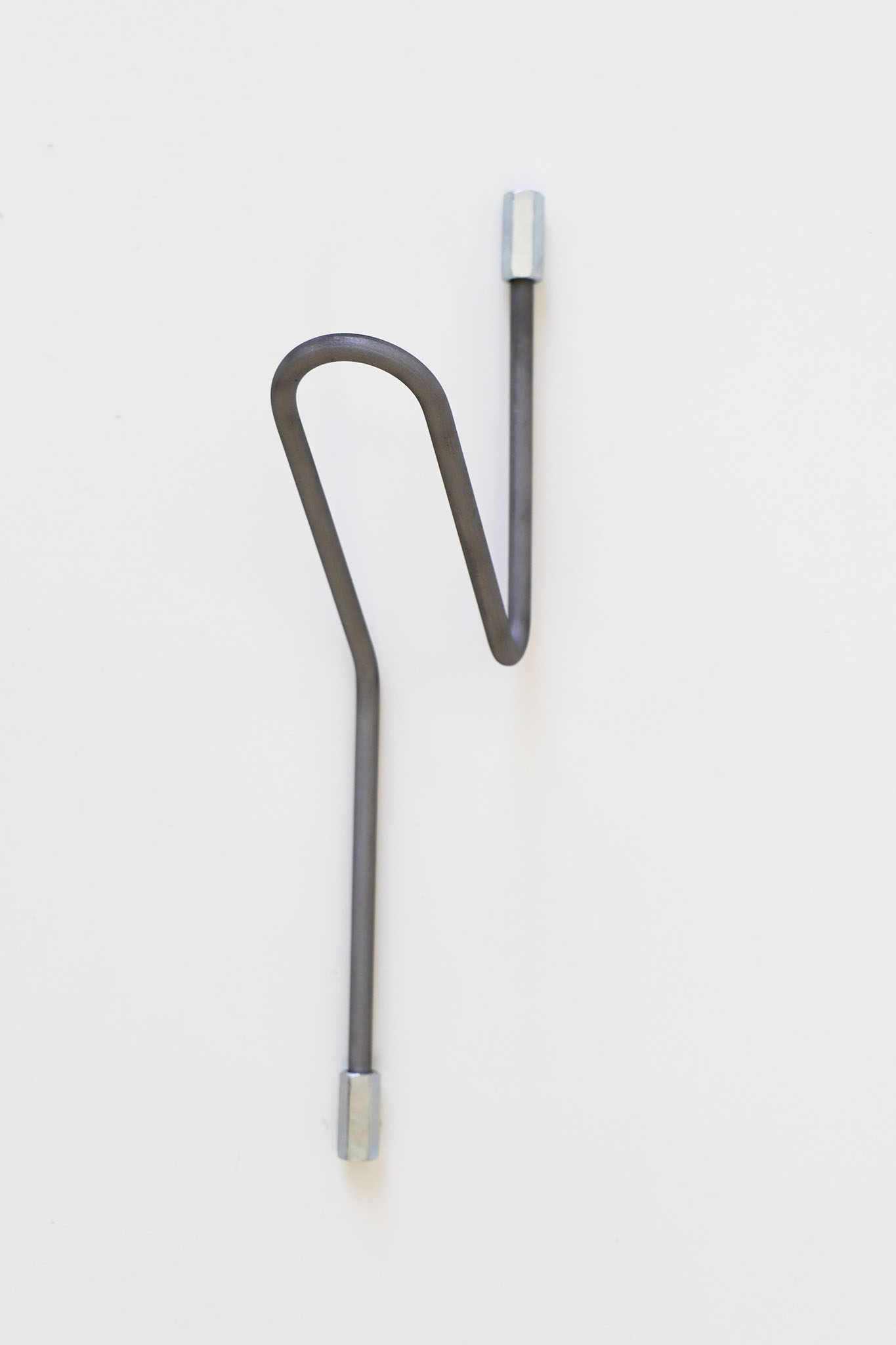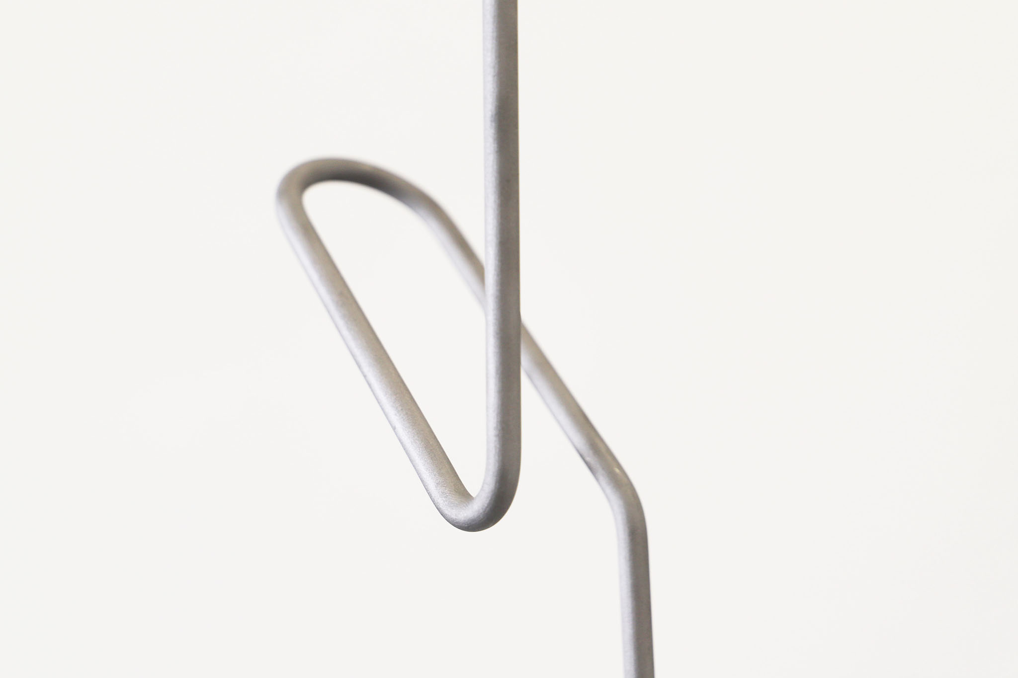 HOOKED is a modular shoe rack and wardrobe system consisting of several hooks and connectors. Each hook measures between 30 and 50 centimeters in length, is formed out of a bended steel rod and offers on each end – top and bottom – a threaded connecting opportunity. Combined with a spacer nut that thread allows each peace to connect to as many new ones as you like. HOOKED can either hang from the ceiling, be attached to the wall or stand on a foot.