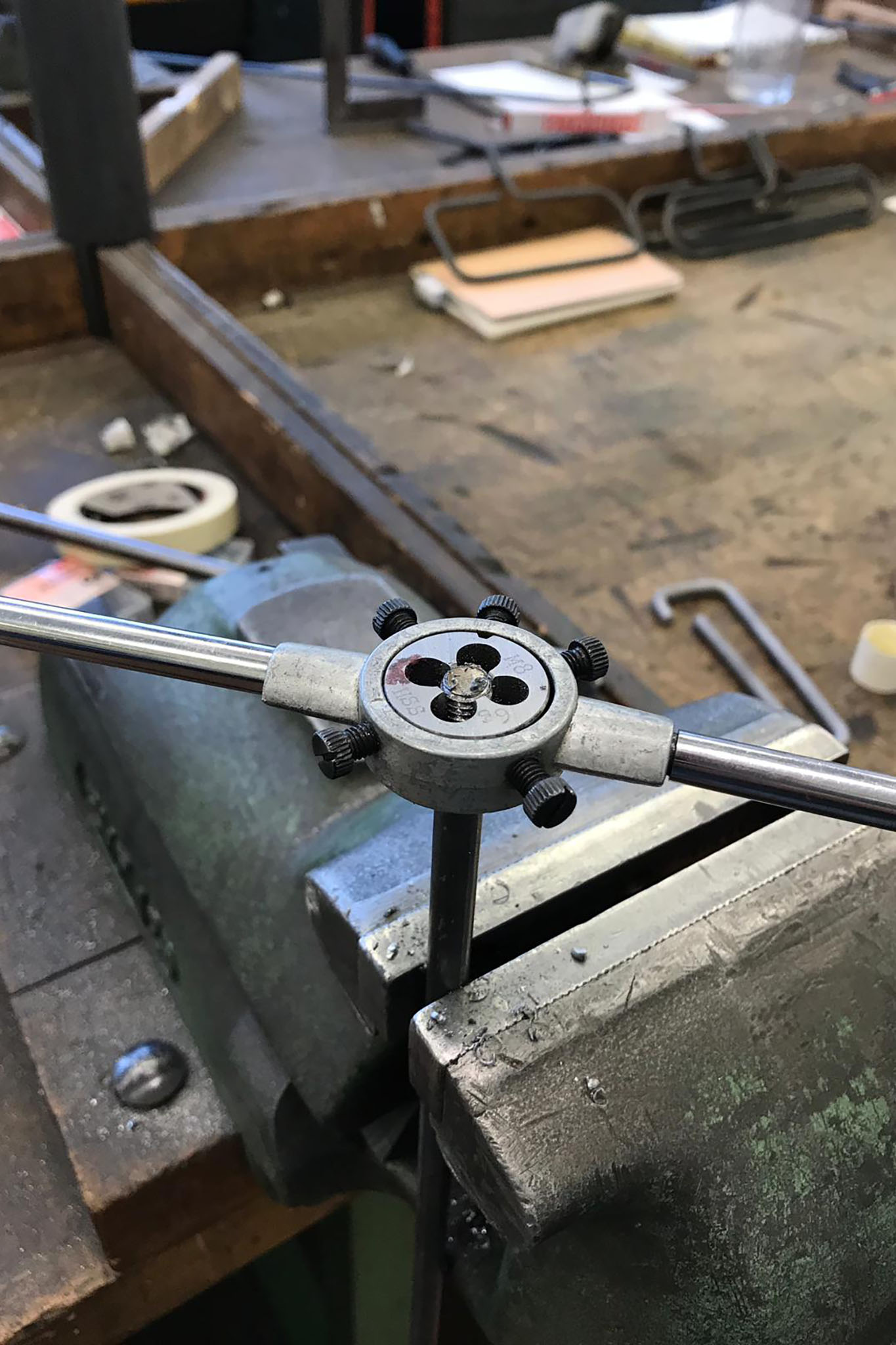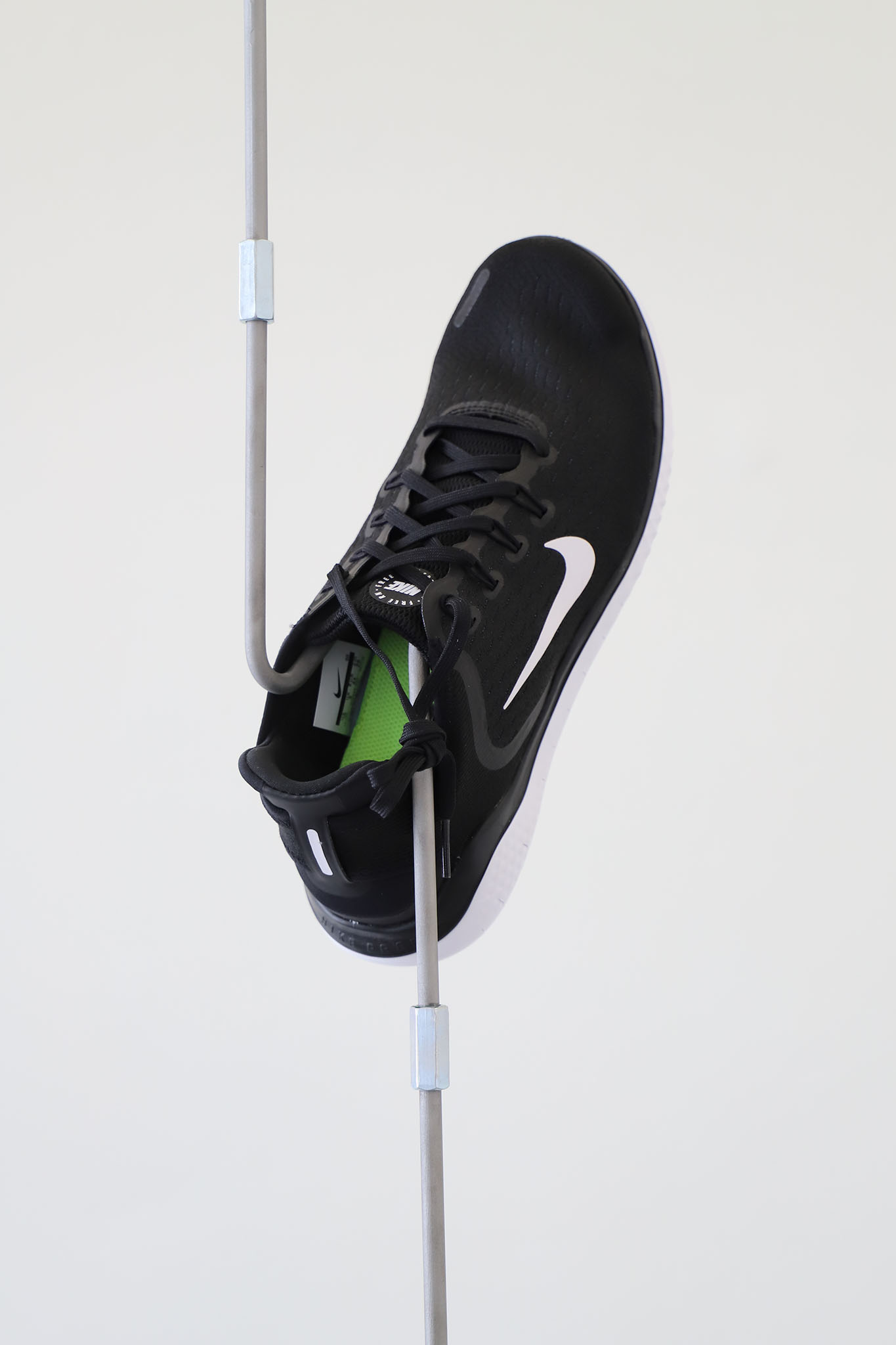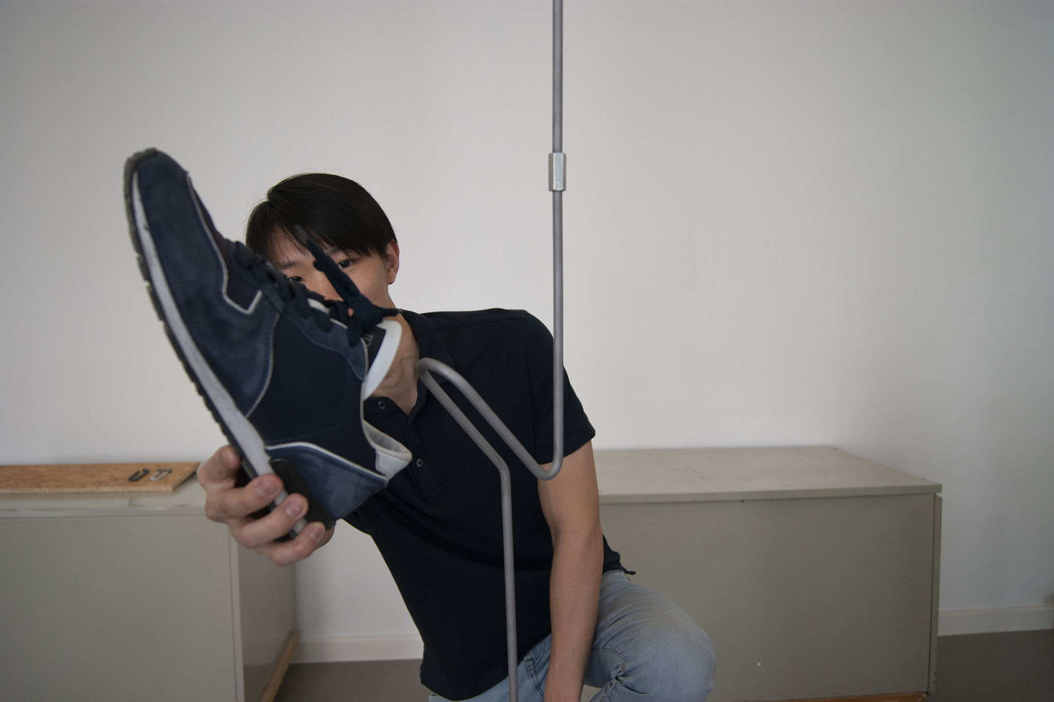 HOOKED is a modular shoe rack and wardrobe system consisting of several hooks and connectors. Each hook measures between 30 and 50 centimeters in length, is formed out of a bended steel rod and offers on each end – top and bottom – a threaded connecting opportunity. Combined with a spacer nut that thread allows each peace to connect to as many new ones as you like. HOOKED can either hang from the ceiling, be attached to the wall or stand on a foot.