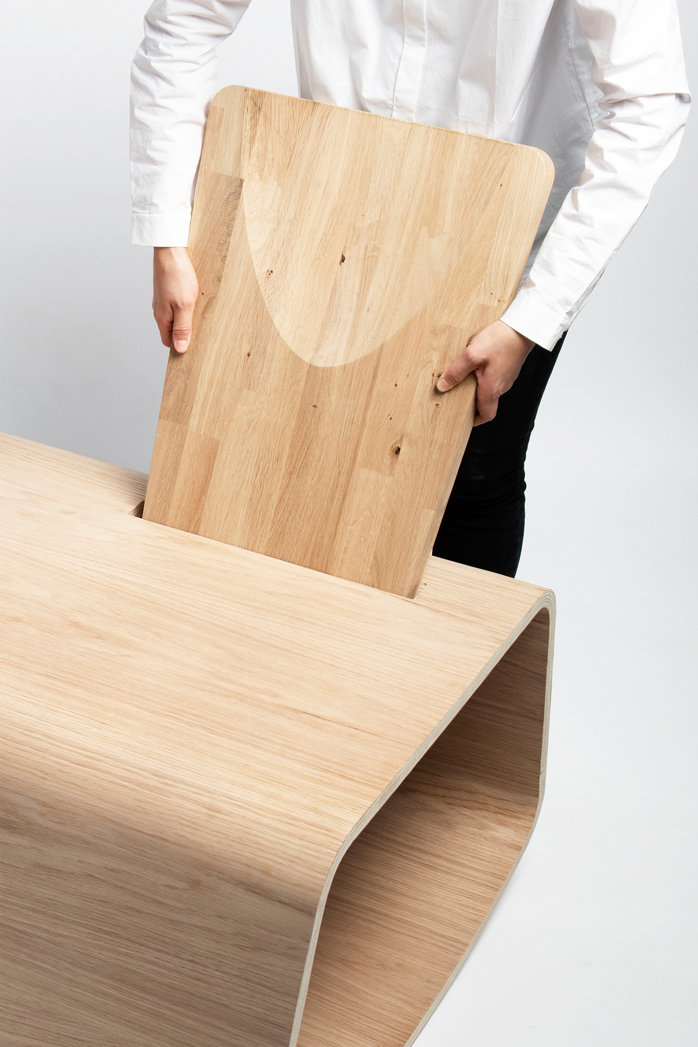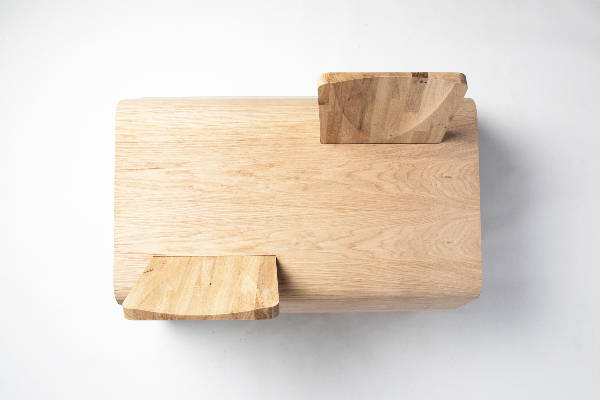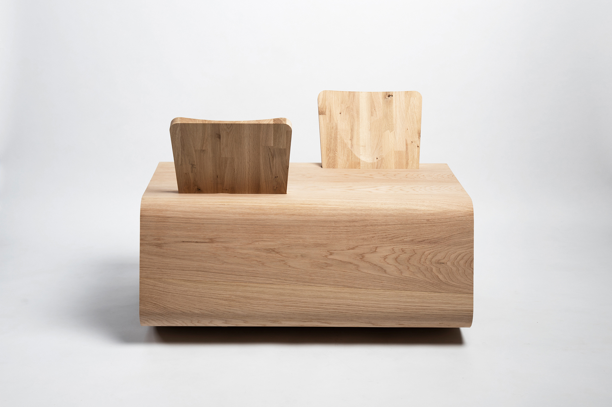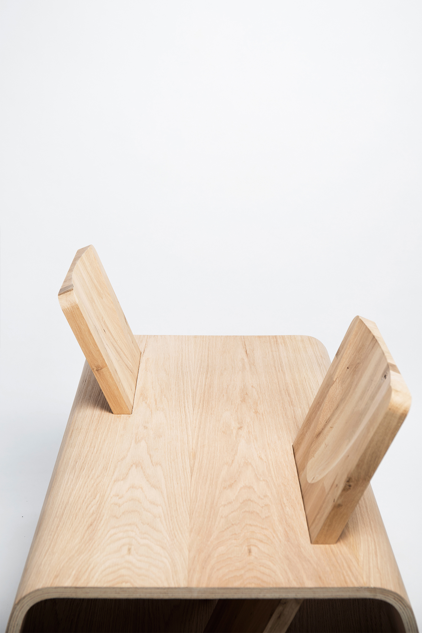 „MAZU“ is a chair on which the two sit together. This chair uses the principle of a swing that moves back and forth and is playful. Playing is an interaction where people can experience the same things together and feel the same feelings. So I tried to trigger human interaction through a chair with play. In addition, the two sit in vis-à-vis, which makes it easier to face each other and to control their movements through the balance and interaction of the two seated. In these „cooperative“ gaming devices, the joy of the additional interpersonal interaction is kindled in us. As a medium, „MAZU“ will interact with two seated people and enhance communication. „MAZU“ is not only a chair, but also acts as a trigger that triggers the emotions of the people.