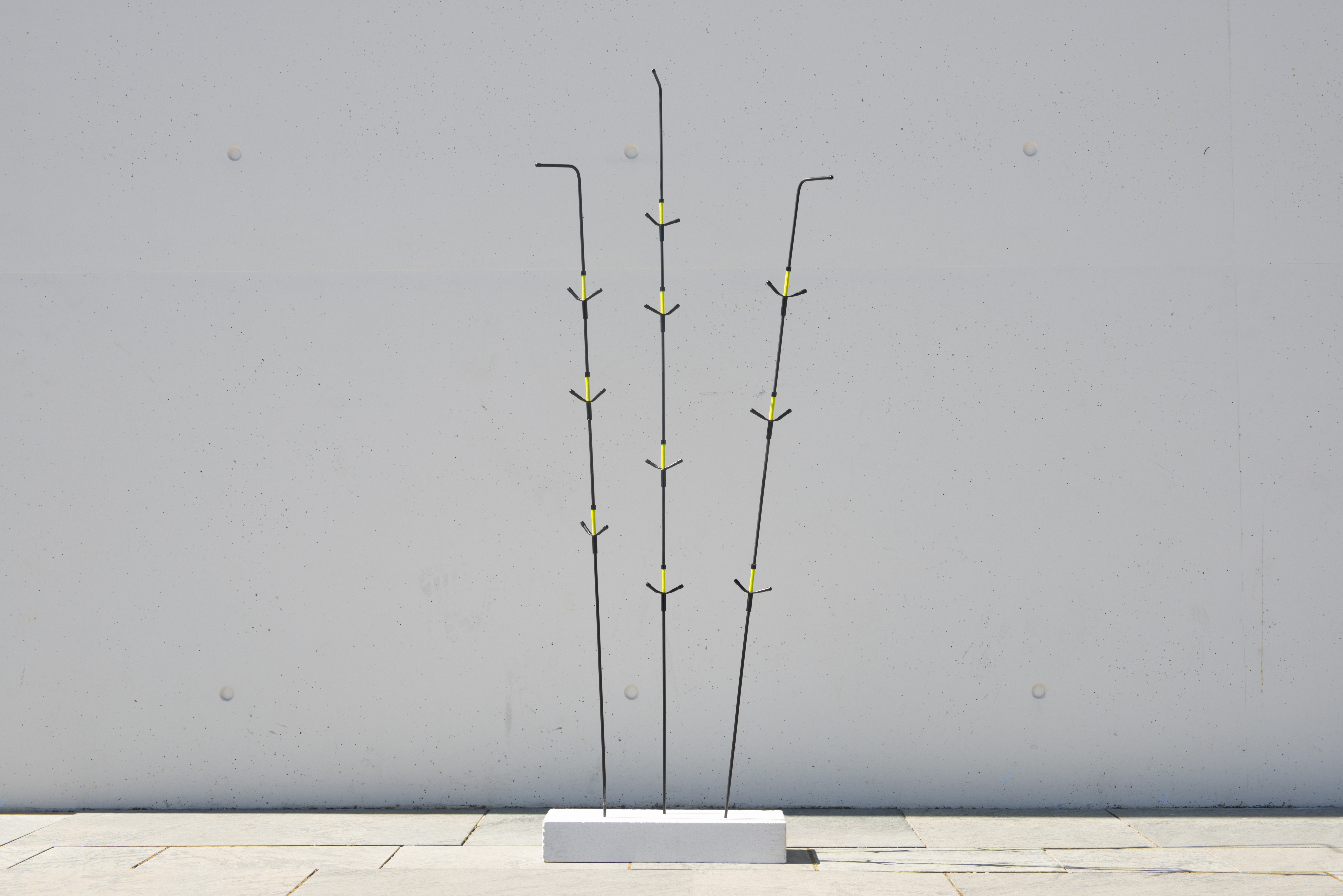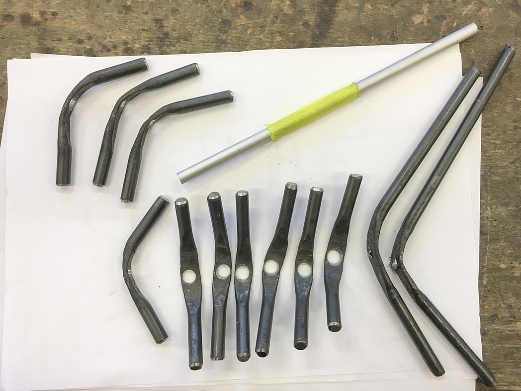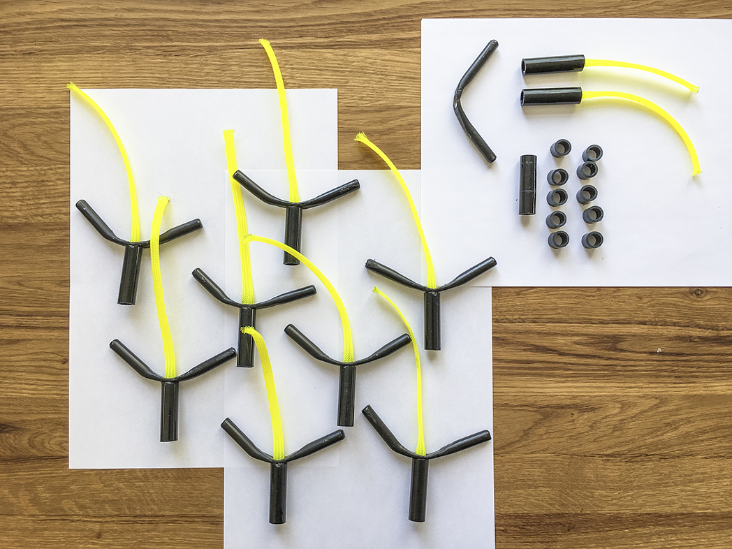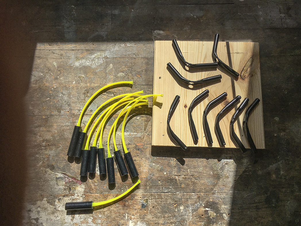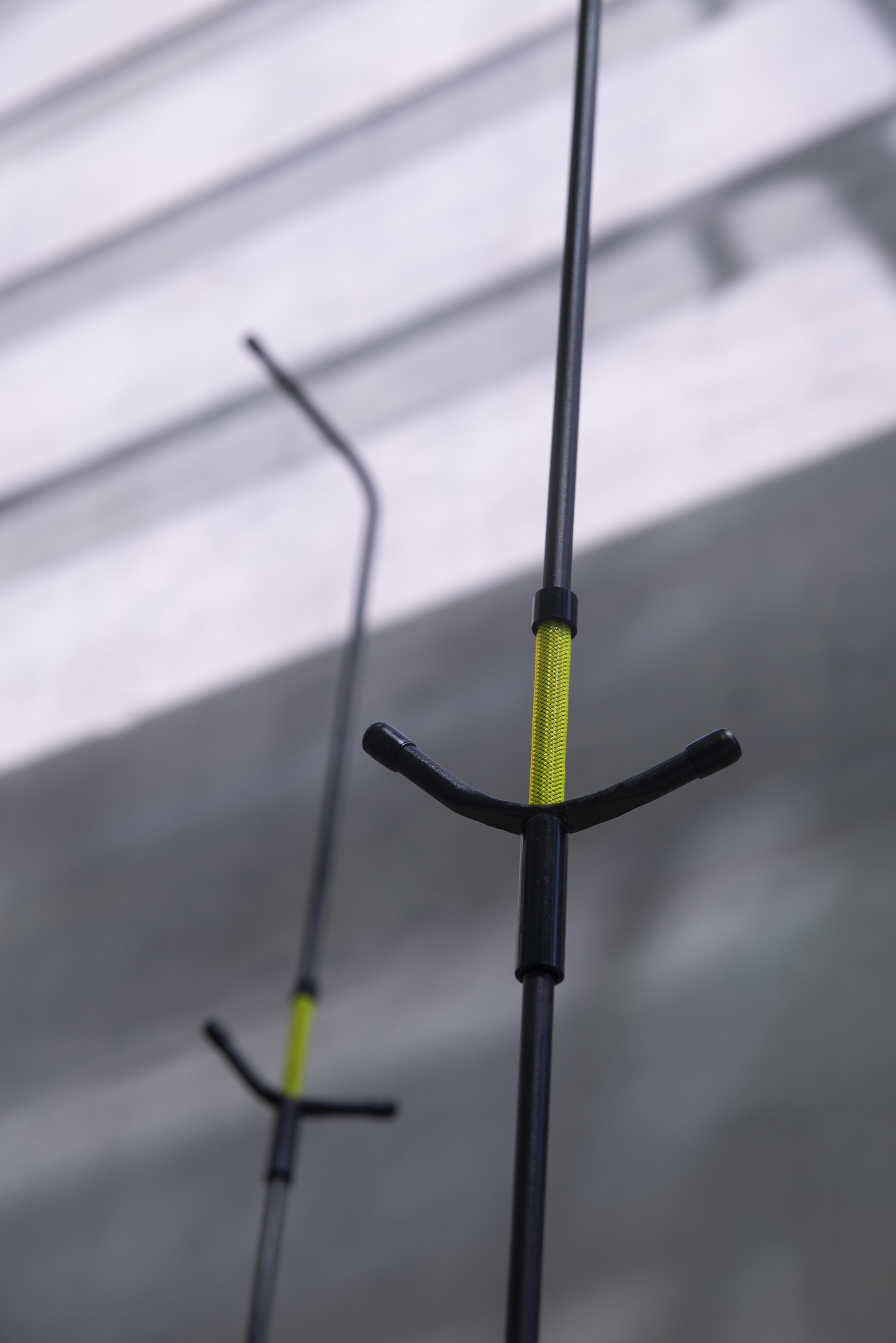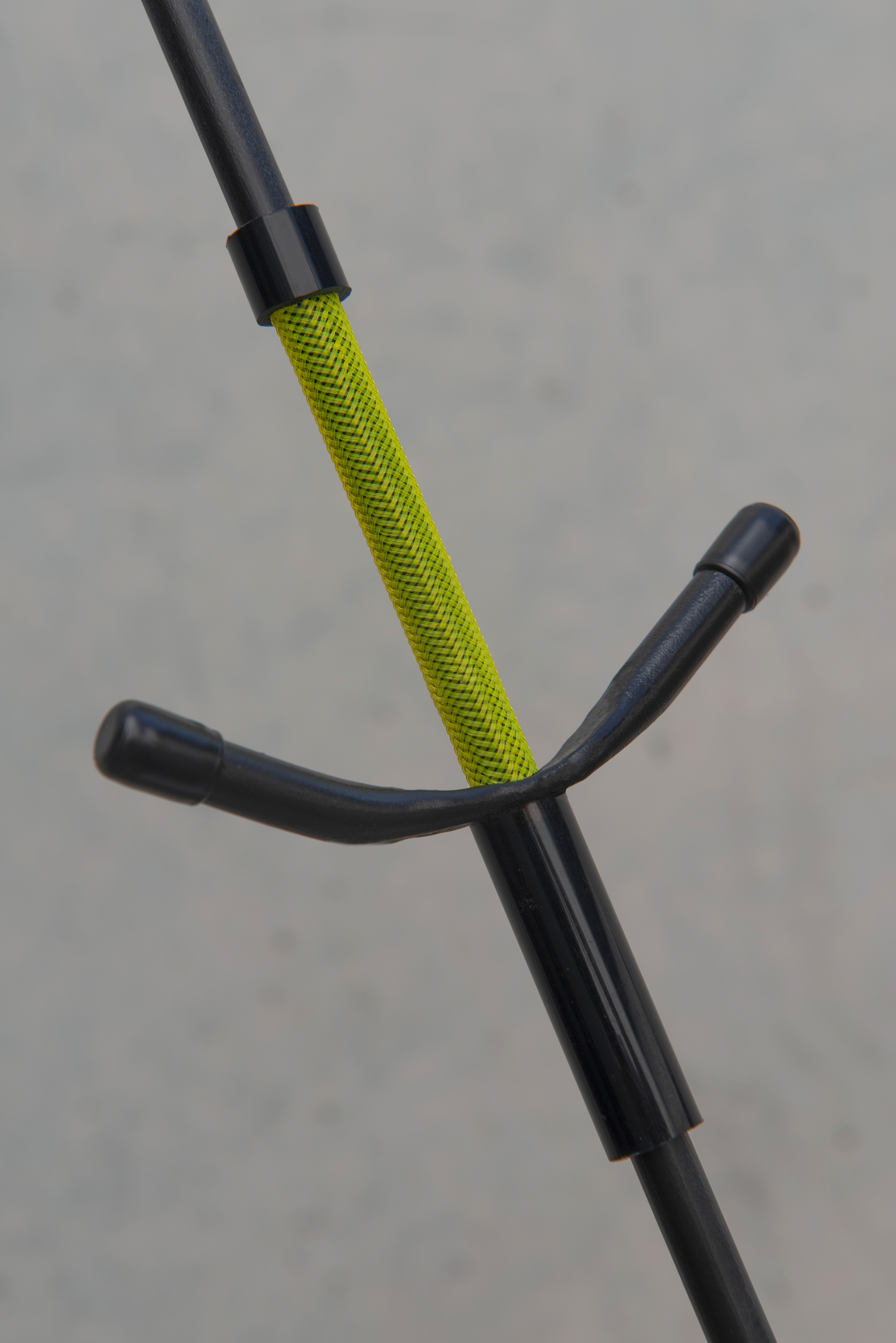 I went searching for an interesting standard-material that both functionally and aesthetically matches to the given steel rods. Thereby, I discovered a braided sleeving usually used to protect cables. On the one hand, when putting the fabric over a rod and pulling on it, the sleeving expands and minimizes its diameter, causing high friction between textile and metal. On the other hand, when pushing the ends of the fabric together, the material widens and it becomes moveable.