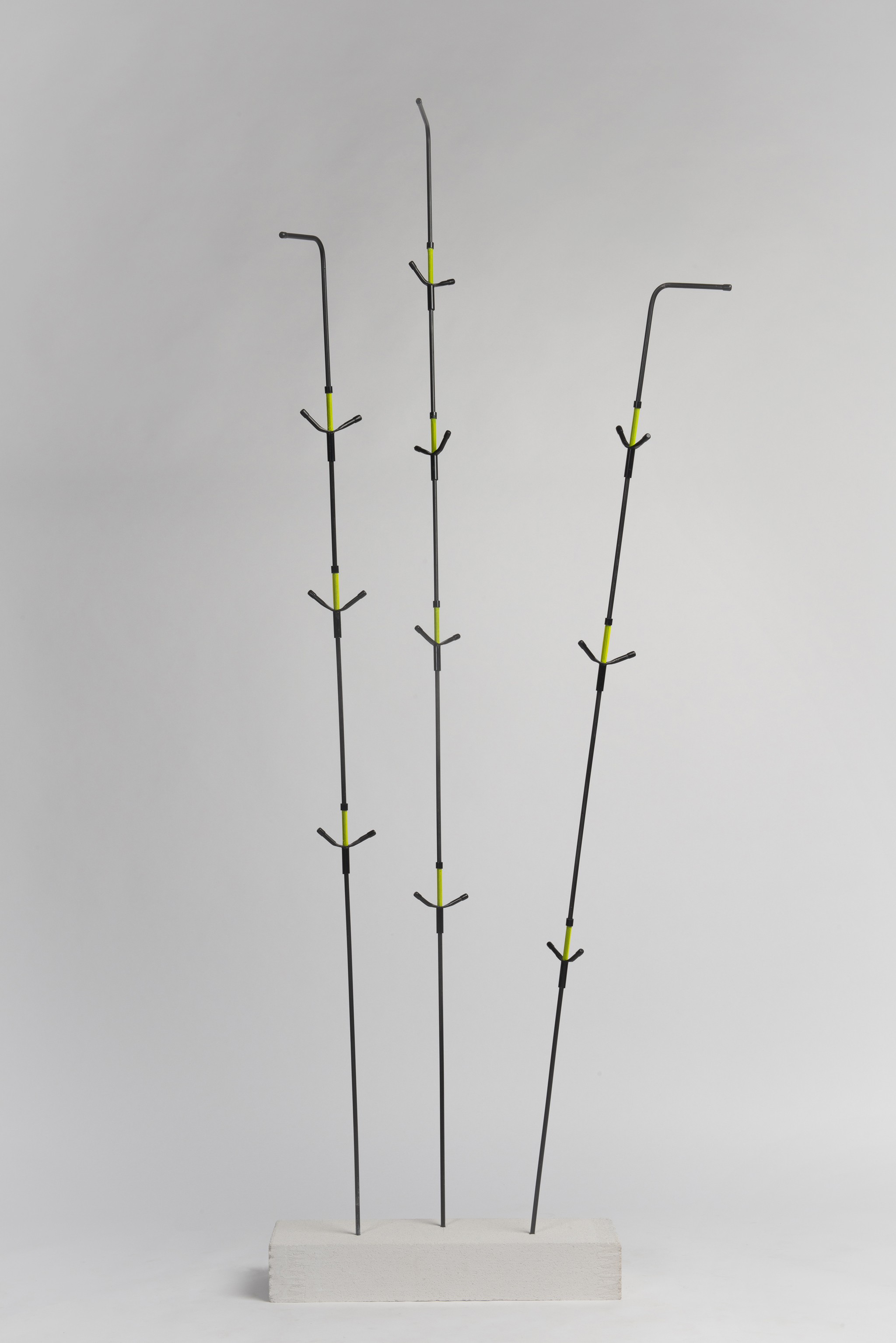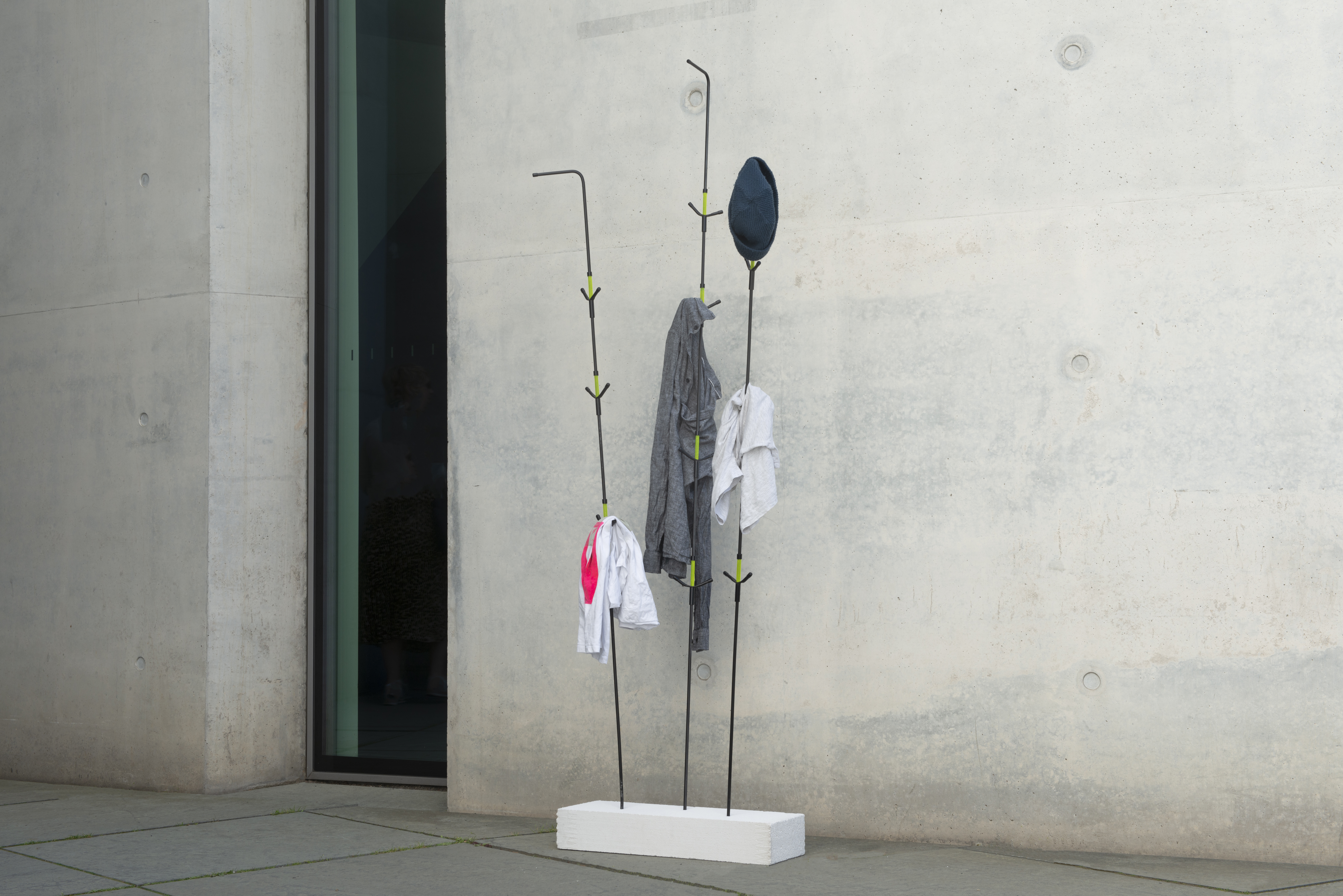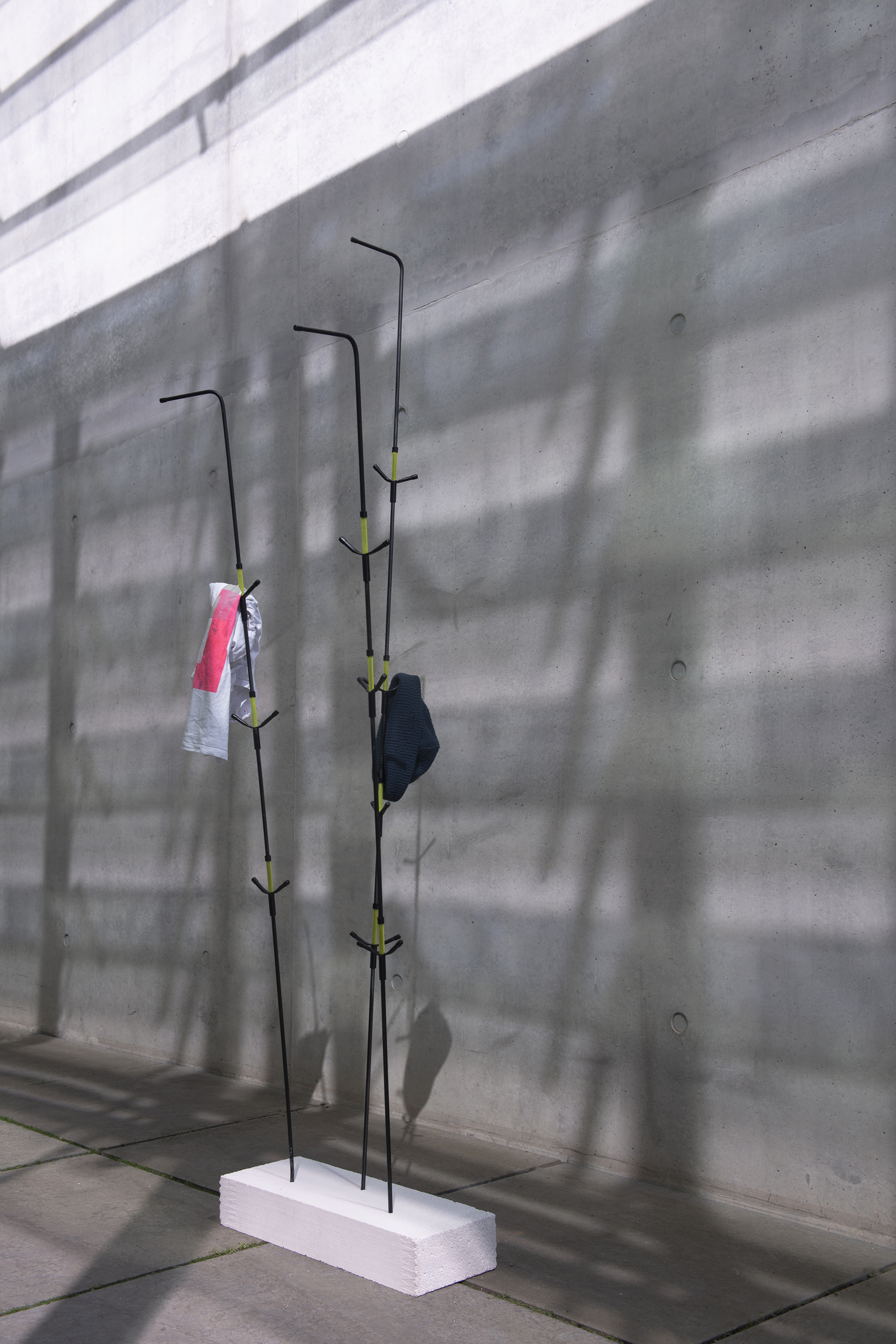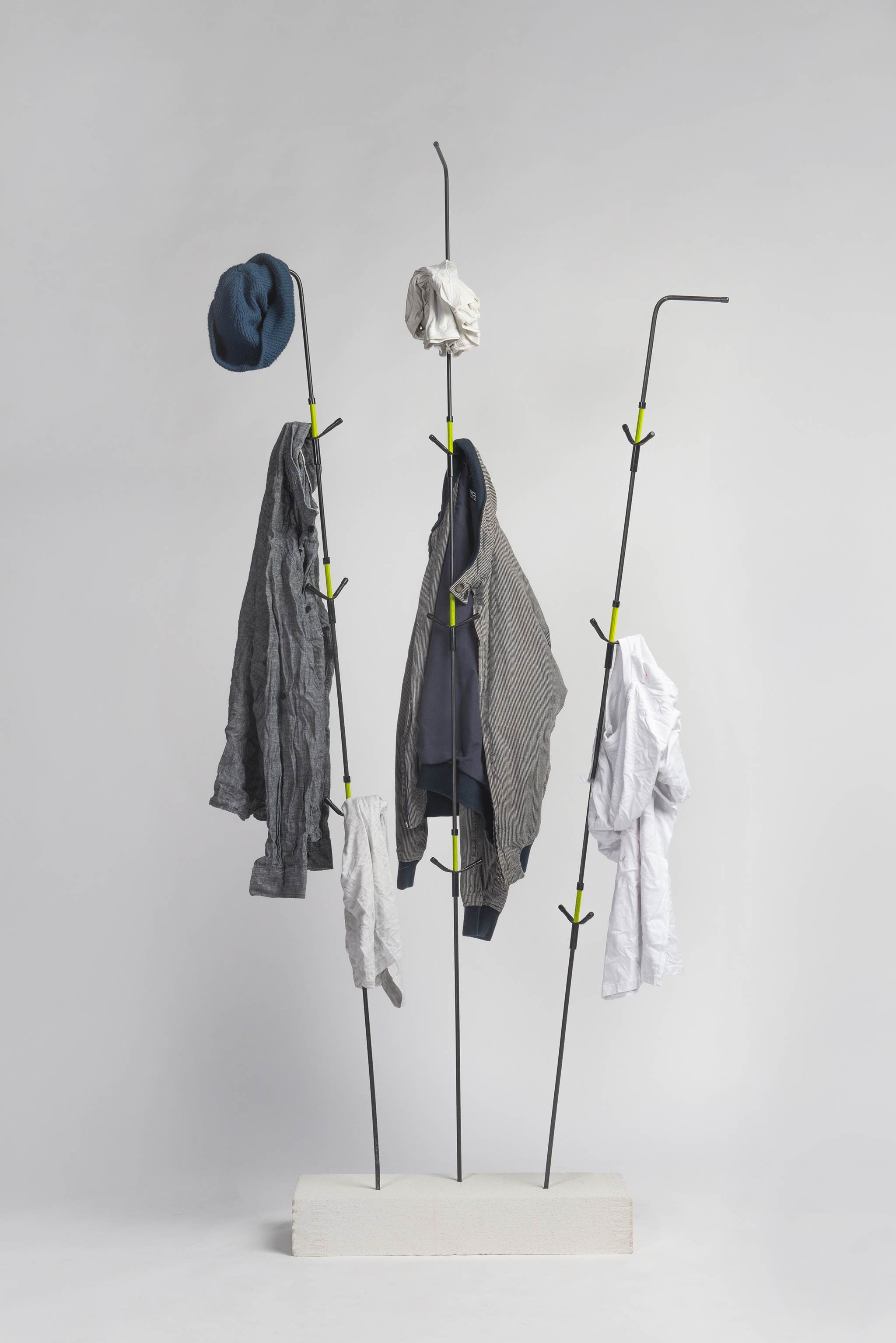 Based on these special characteristics, I designed a modular wardrobe with sliding hooks, whose position can be adapted to the respective clothing.