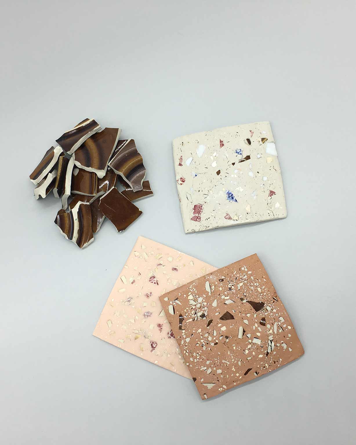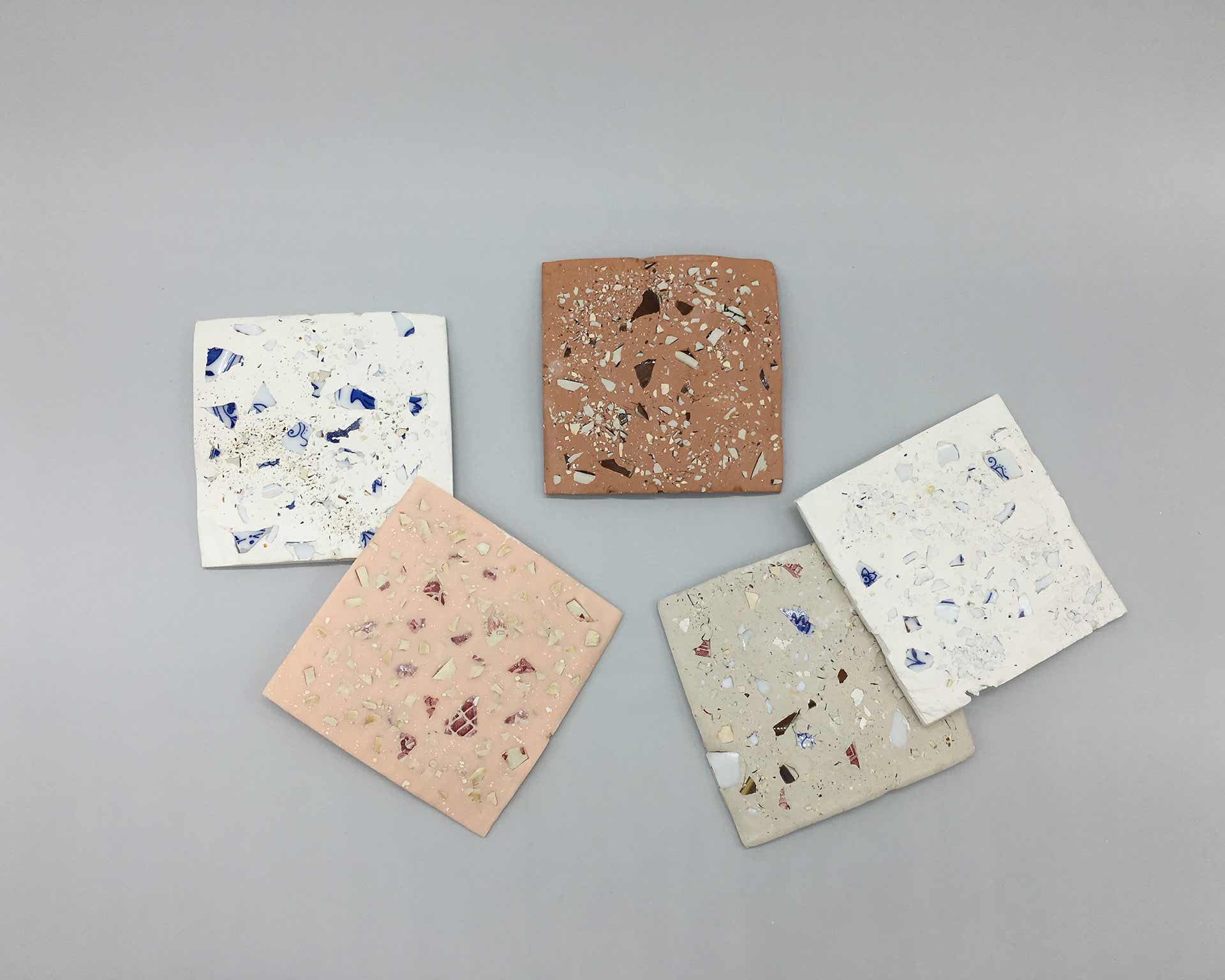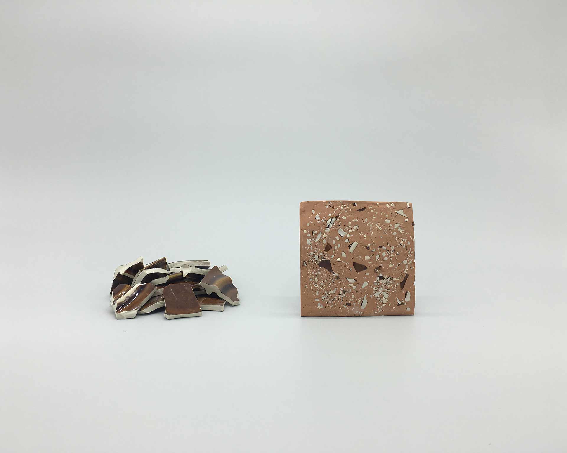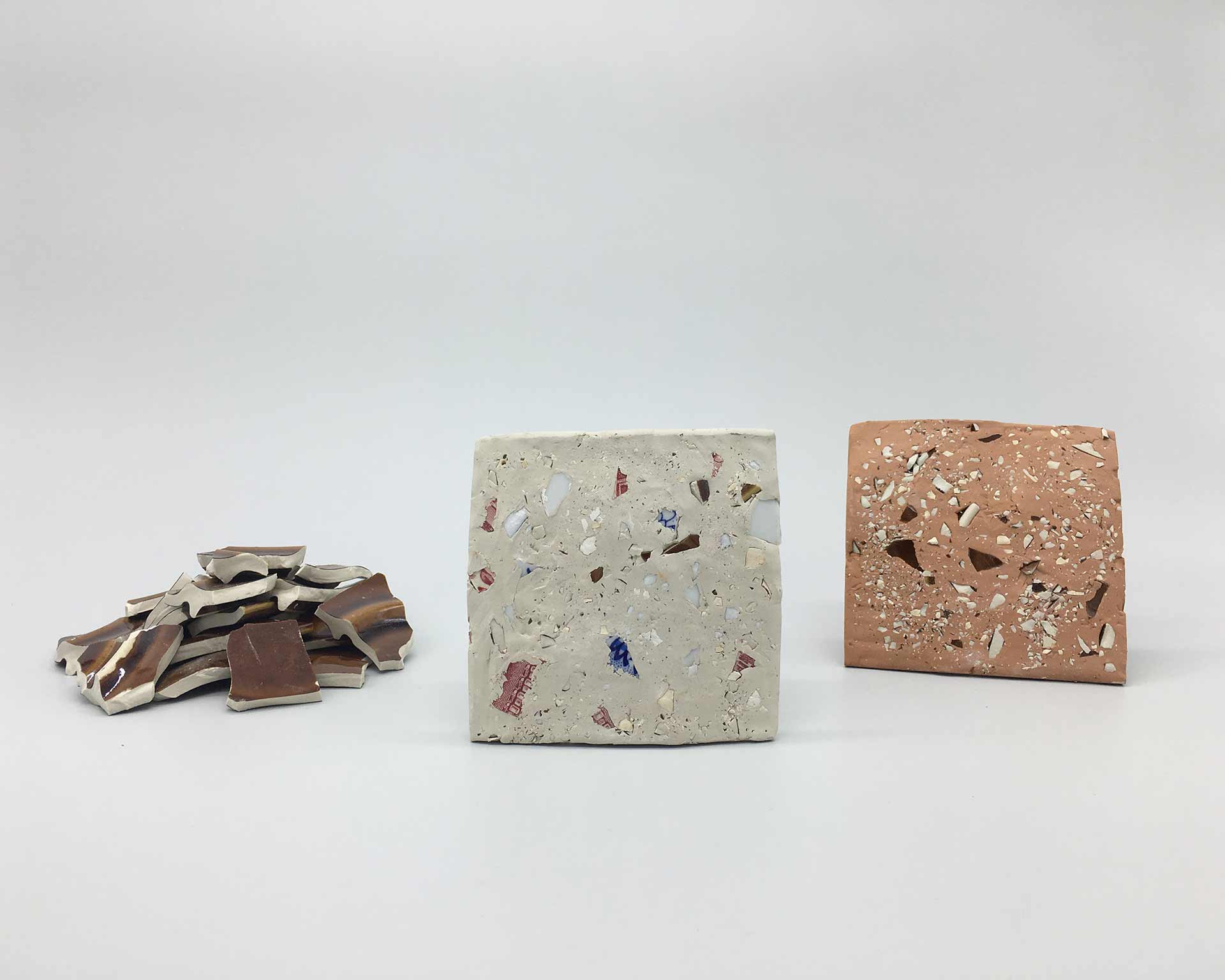 Pala ist eine speziell entwickelte Fliese, die aus 80% recycelten Porzellangeschirr besteht, welches zusammengetragen wurde aus Haushalten, die keine Verwendung mehr dafür finden. Grosse Keramikfirmen wie Kahla Jena hinterlassen Mengen an Keramik Abfall, der wegen mangelnder Qualität nicht dem Weg zum Kunde findet. In diesem Experiment war ich besonders inspiriert von der diesjährigen Yoko Ono Exhibition welche in Leipzig stattfand. Das Thema war hier Keramikstücken wieder einen Wert zu geben indem sie auf verschiedene Arten und Weisen wieder zusammengefügt wurden. Diesen Gedanken habe ich auf mein Experiment mit den Keramikstücken übertragen, indem ich die Stücke mit Ton vermengte und so einzigartige Terrazzo Stücke generierte.